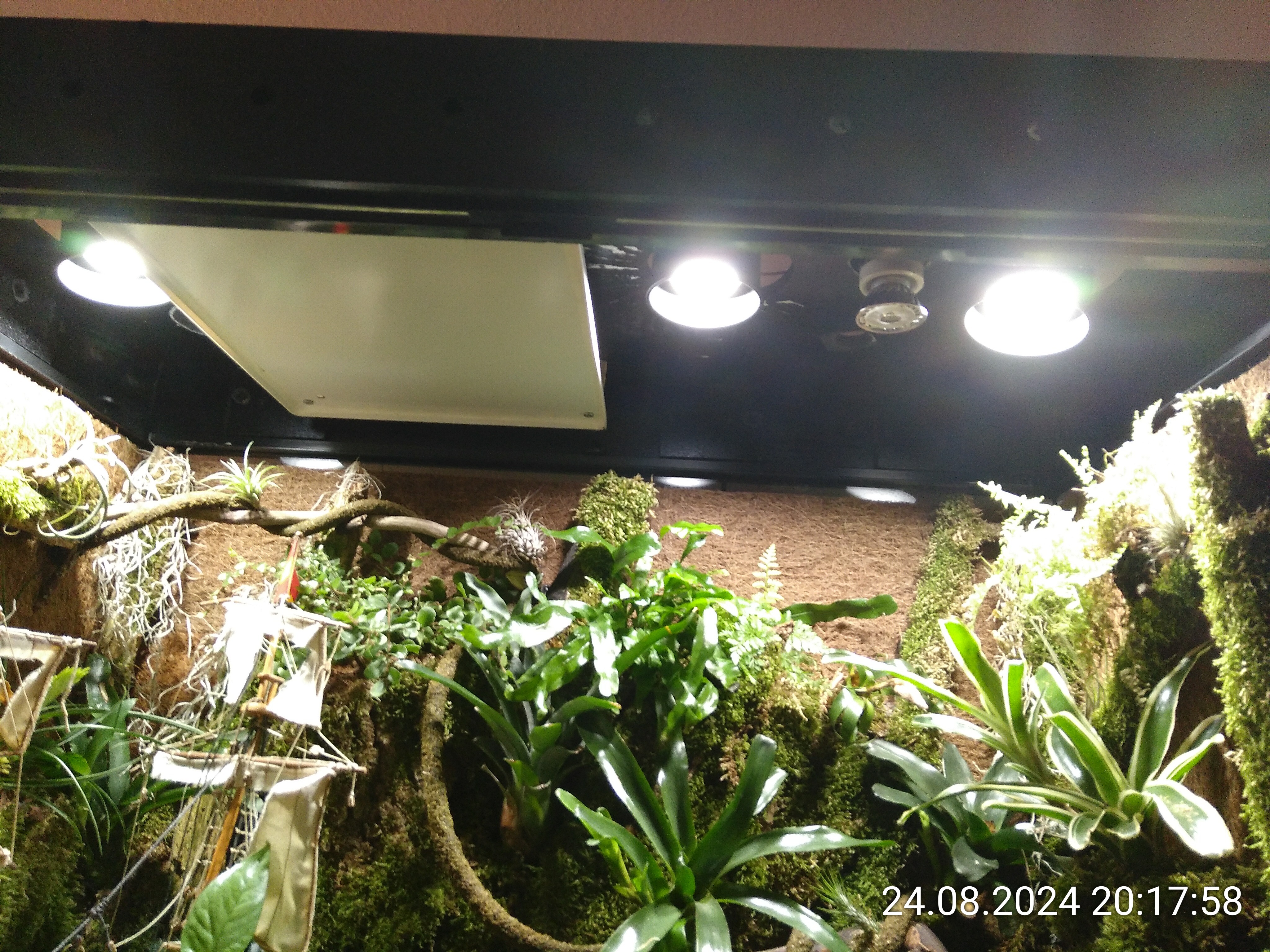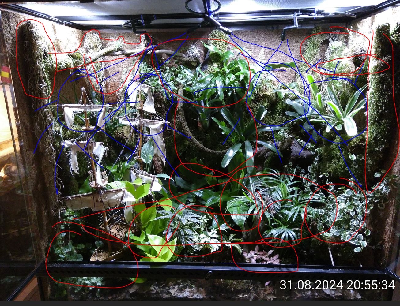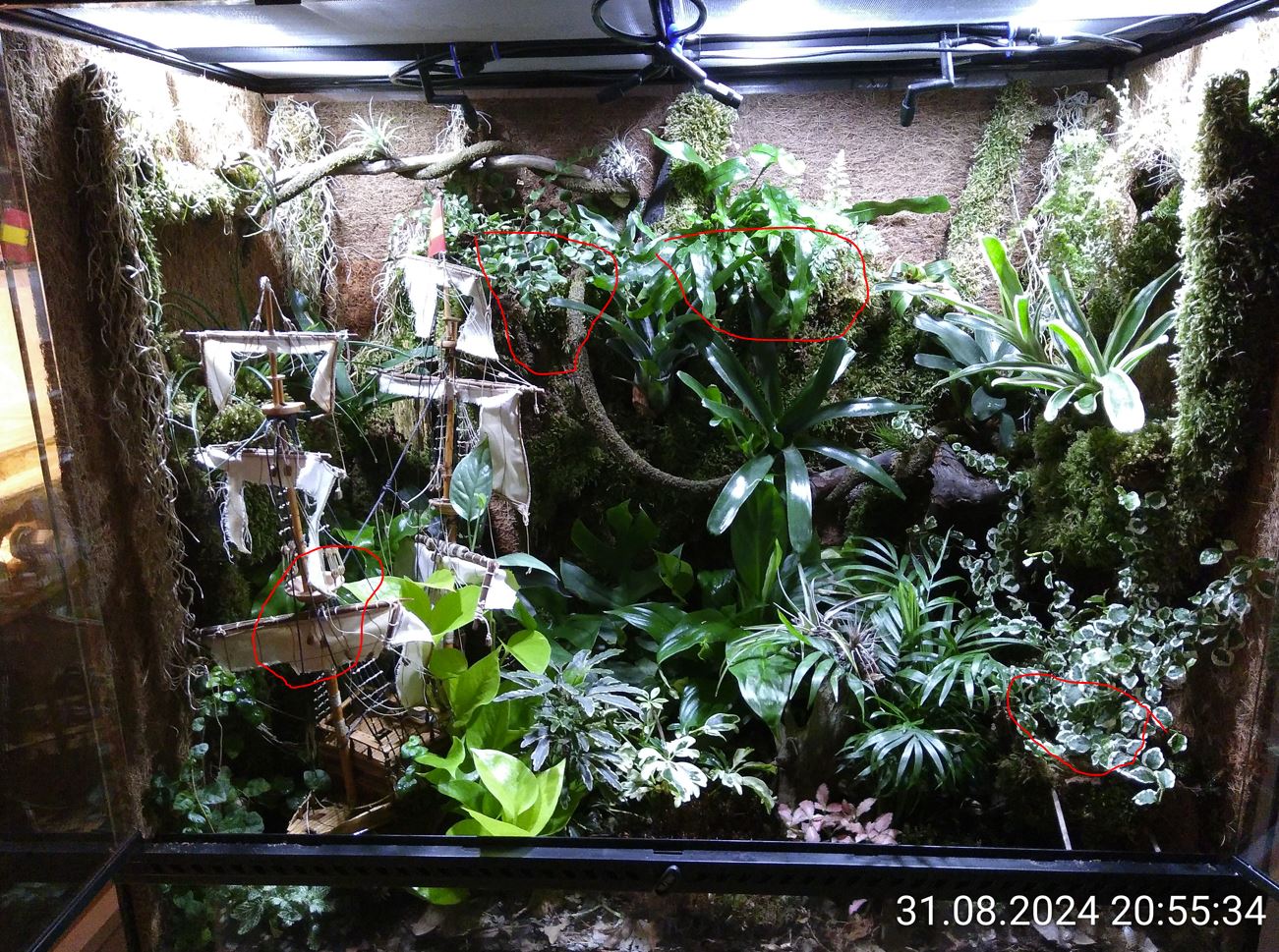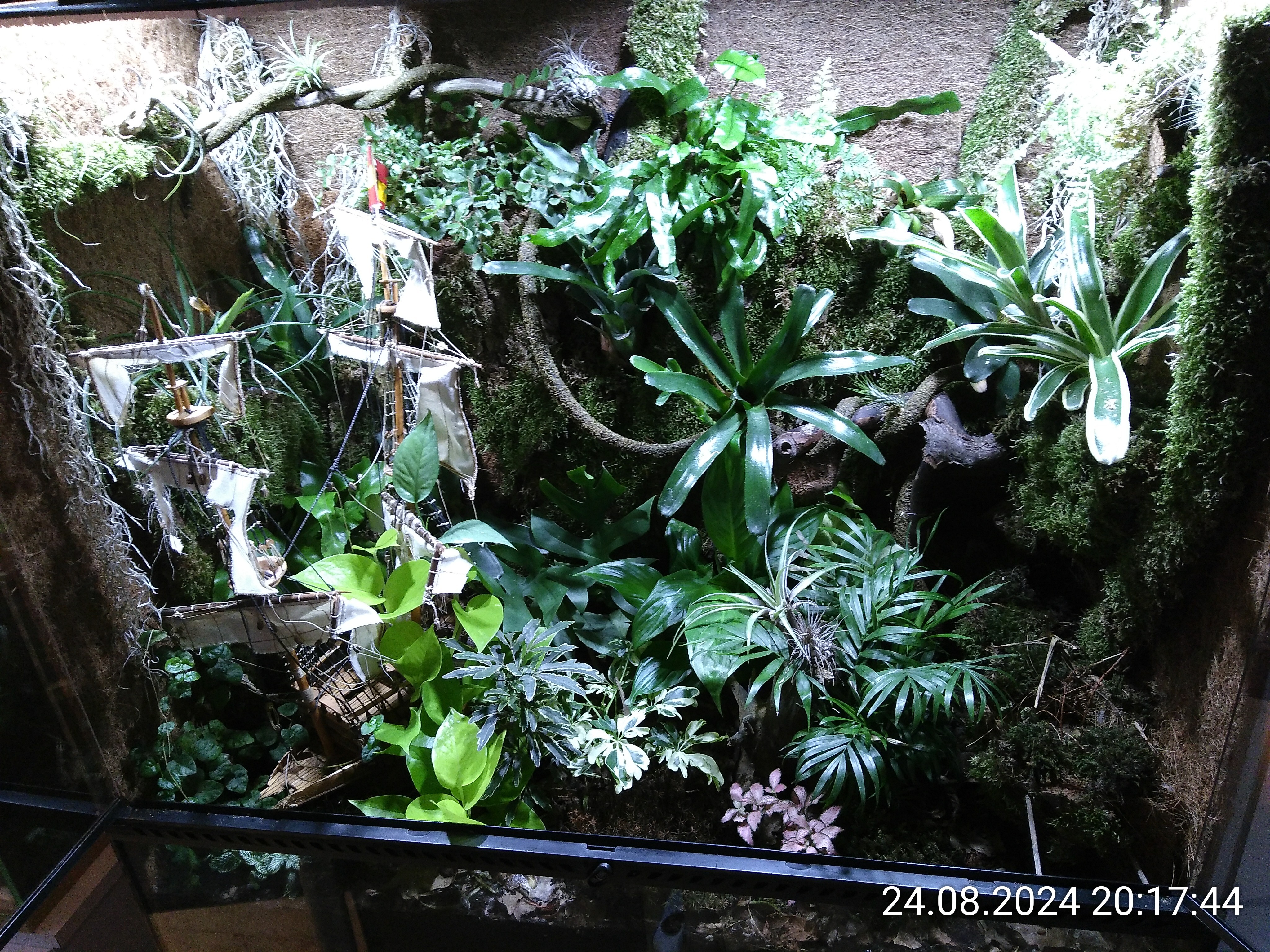 Die Pflanzen am Boden kann man mal großzügig vorgießen, mit den anderen wird das schwierig. Der eine Farn zeigt mir regelmäßig mit hängenden Blättern, dass er mehr Wasser will. Mit meinem Handsprüher lasse ich keine Ecke aus. Die Anlage kann das aber nicht. Ein überhängendes Blatt kann schon dafür sorgen, dass die darunterliegende Pflanze kein Wasser abbekommt. Das Schiff stört und es gibt viele Ecken und Überhänge.