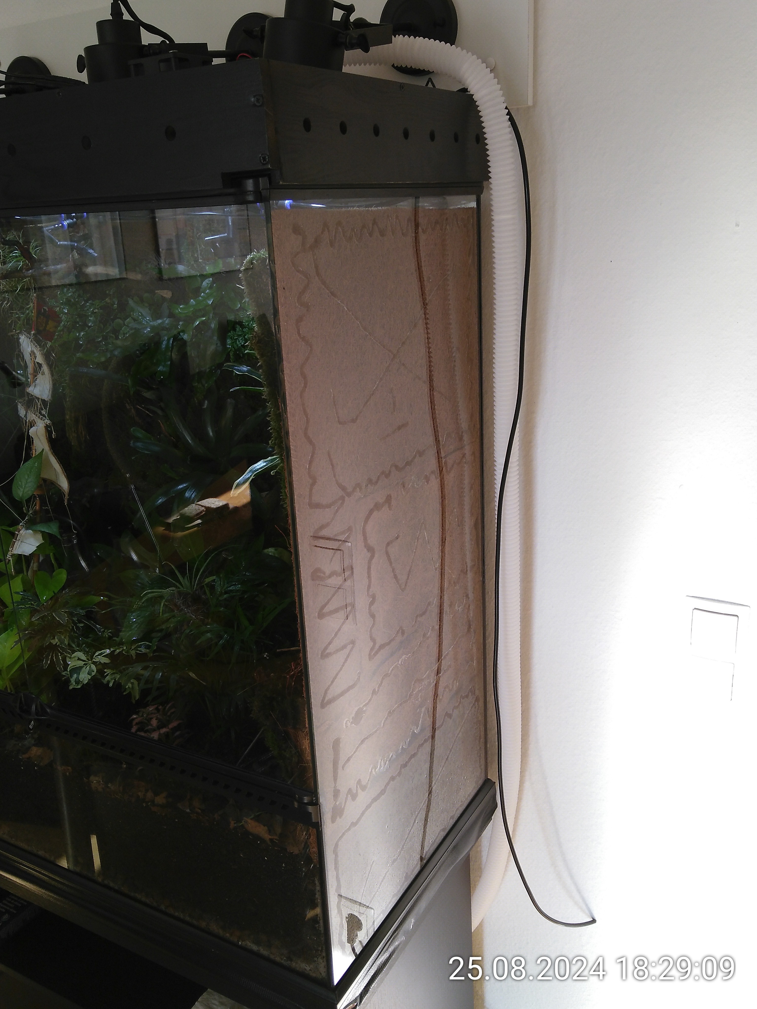 Den LF-Sensor habe ich oben in der Mitte angebracht. Dort kann er nicht angesprüht werden. Das ist eigentlich der einzig sichere Platz. Dafür zeigt er keine Ergebnisse, die ich einfach übernhemen kann. Ganz oben ist die LF deutlich geringer als weiter unten. Ich muss also für die korrekte Einstellung die Steuerung auf eine niedrigere LF einstellen. Den Temperaturfühler habe ich hinten links am Deckel befestigt. Weit weg von der Heizung.