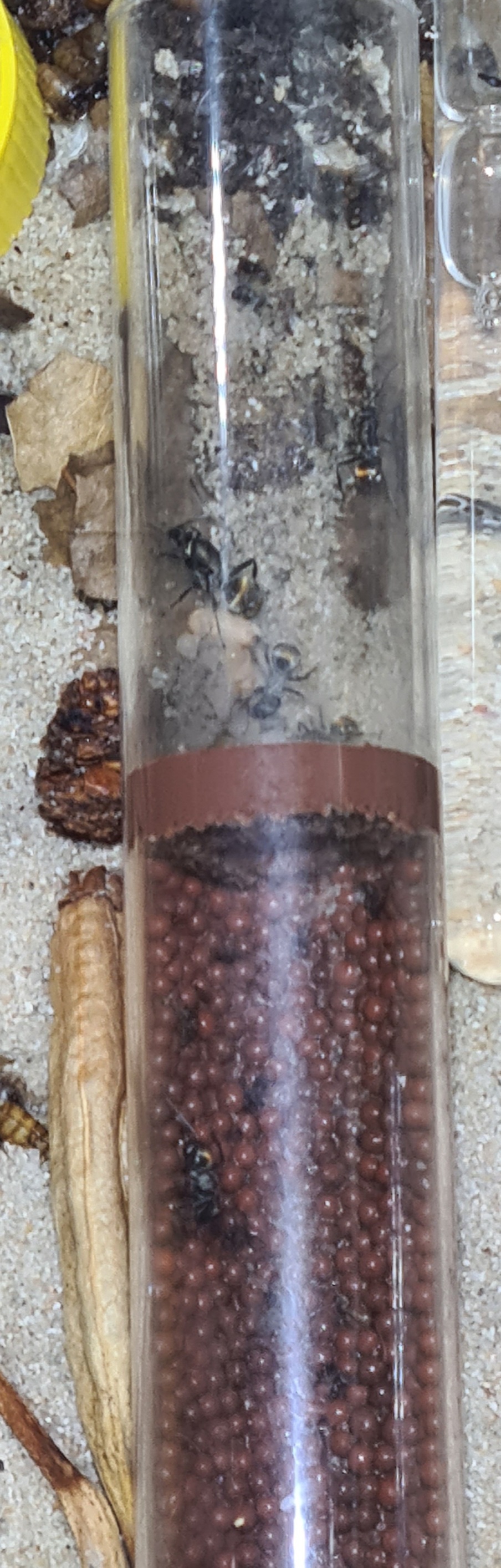 Da ich ja eine relativ trockene Arena habe, die zwar lufttechnisch immer wechselnd befeuchtet wird, werden nicht benötigte und trockene Fruchtfliegen als Wall um den Eingang des Nestes ausgelegt.