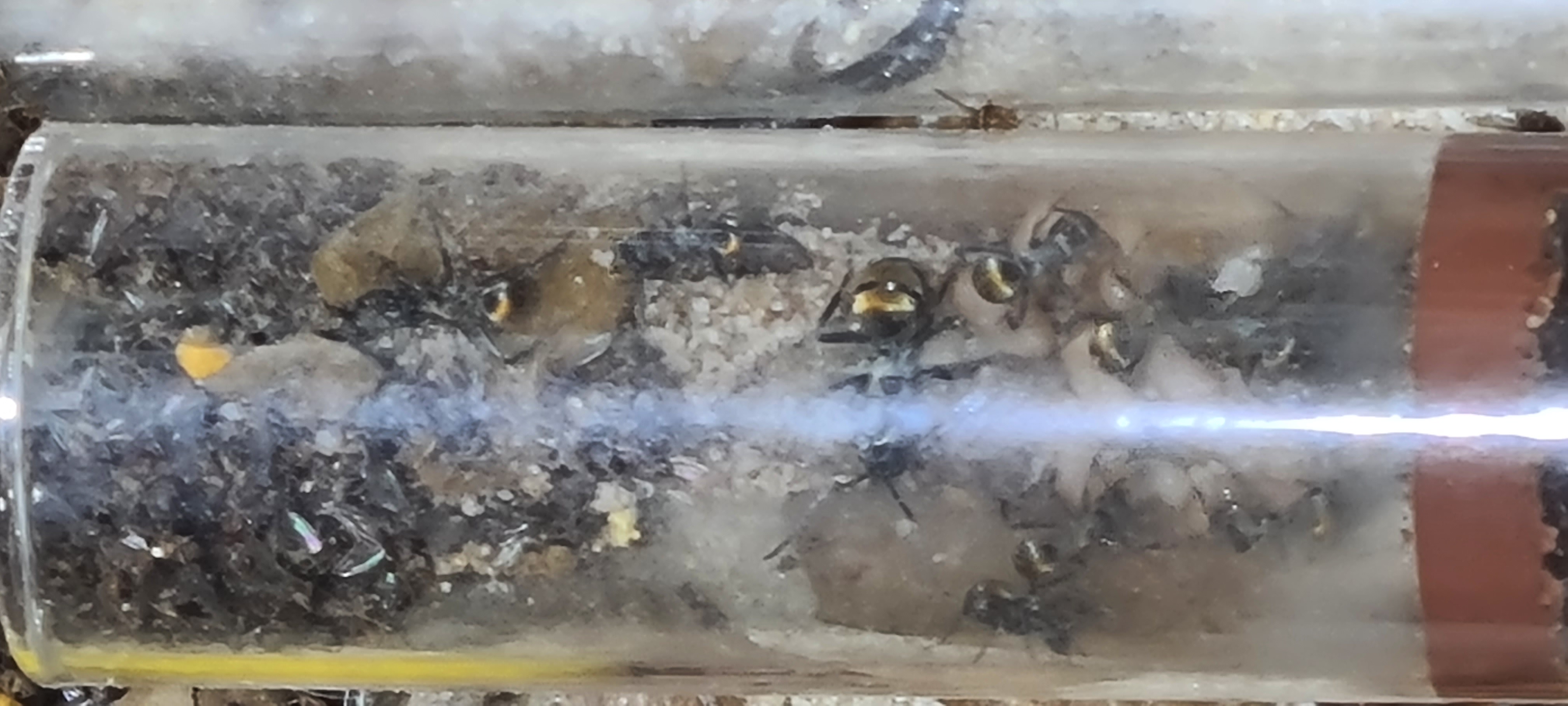 Es sind nun 7 Arbeiterinnen, eine Menge Larven und 2 Eierpackete.