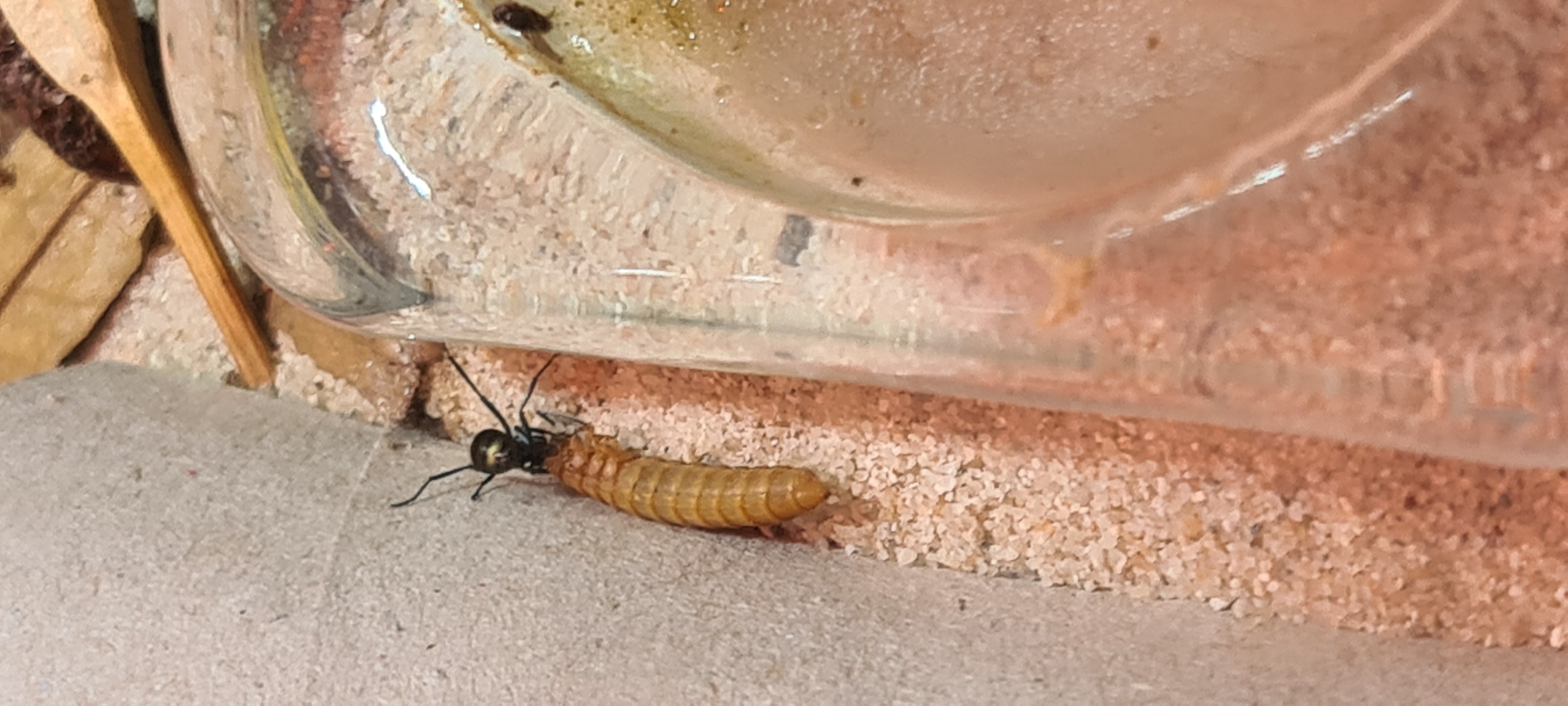 Naja zur heutigen Fütterung gab's mal wieder nicht nur Fruchtfliegen, sondern auch Mehlwürmer.