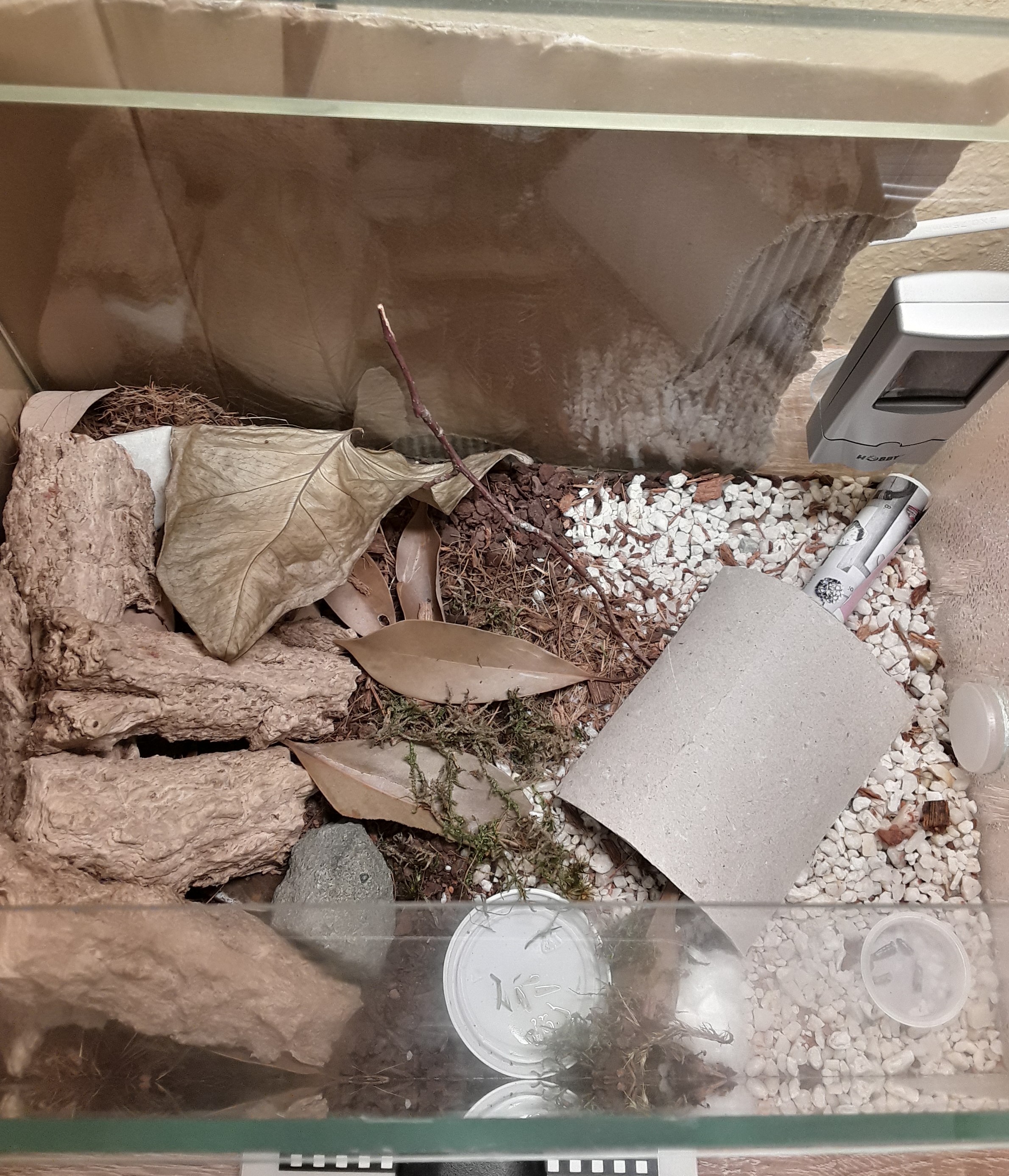 In der Arena sind Nestmaterialien wie Piniensubstrat, kleine Holzsubstrate, getrocknete Blätter, kleine Holstückchen und ein paar Steine in der Ecke.