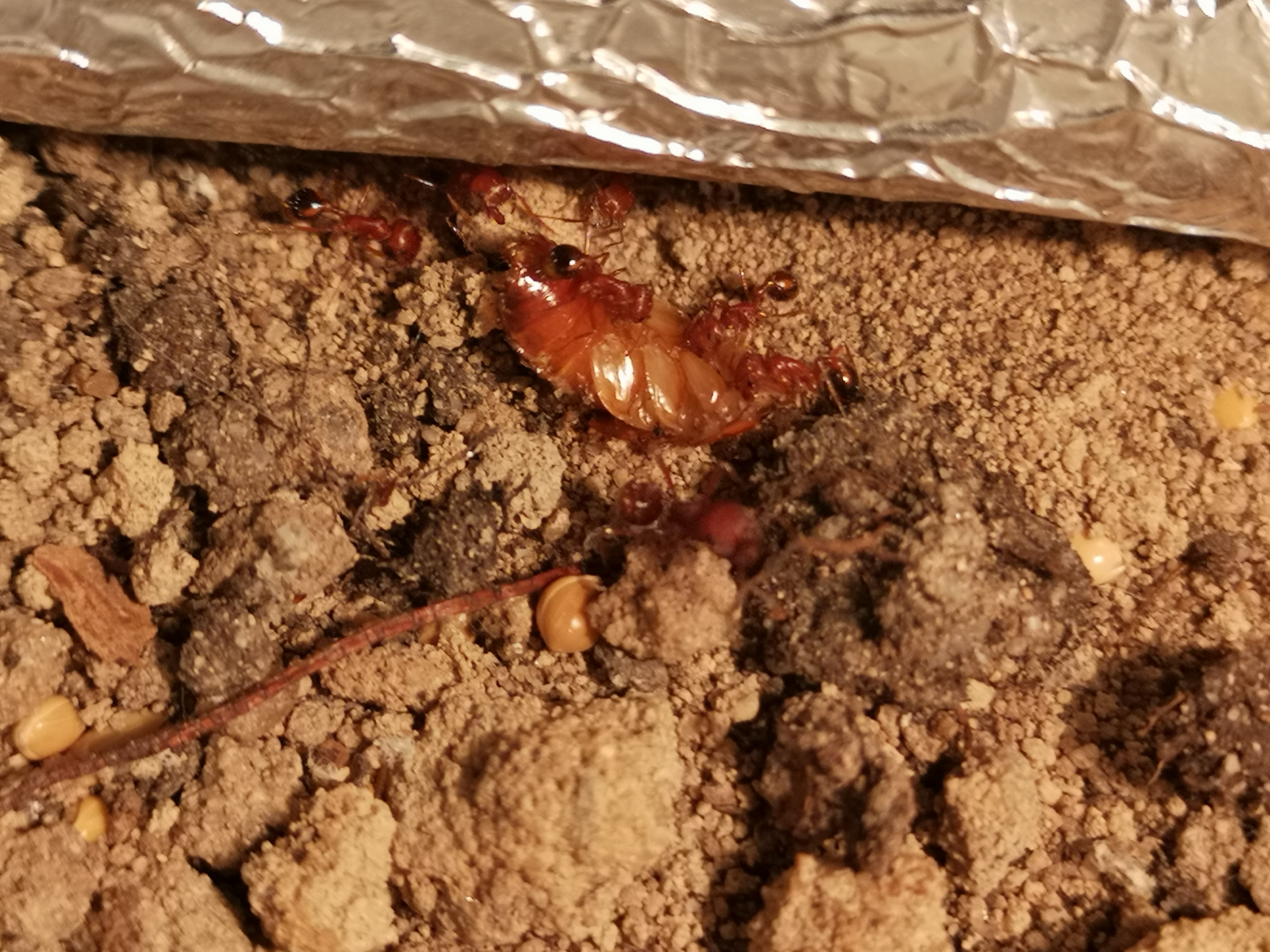 Heute fütterte ich eine kleine halb-tote Schokoschabe (aus eigener Zucht) welcher schnell die Beine abgenommen wurden (ja die Natur ist brutal). Ich finde es faszinierend wie selbst hier Pogonomyrmex californicus bicolor und Pogonomyrmex occdentalis kooperieren. Man kann sehr gut mit dem Auge den Größenunterschied und die andere Körperform, so wie Färbung auseinander Halten.
