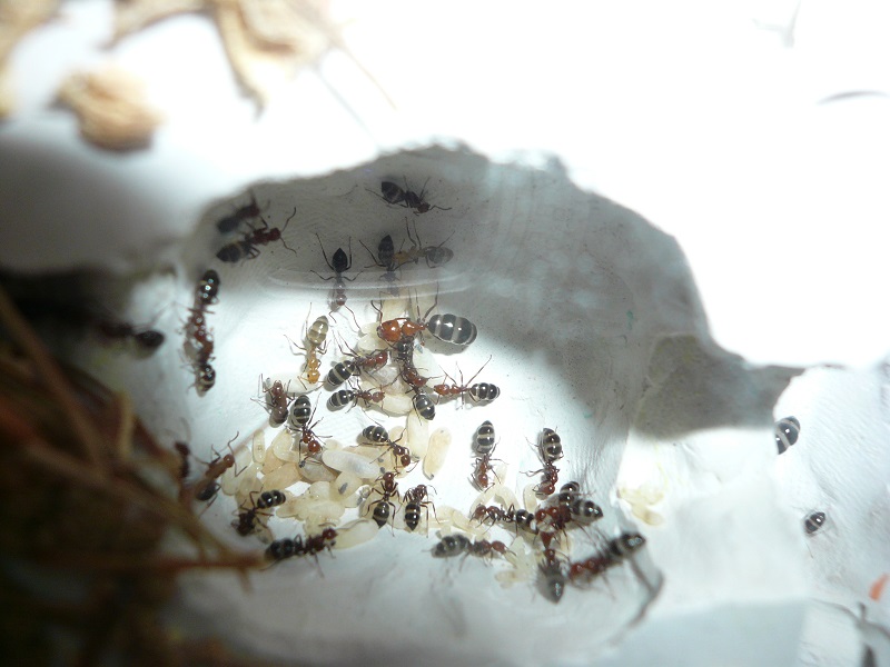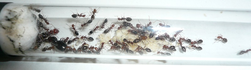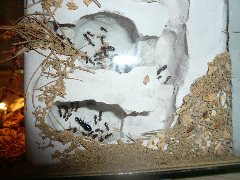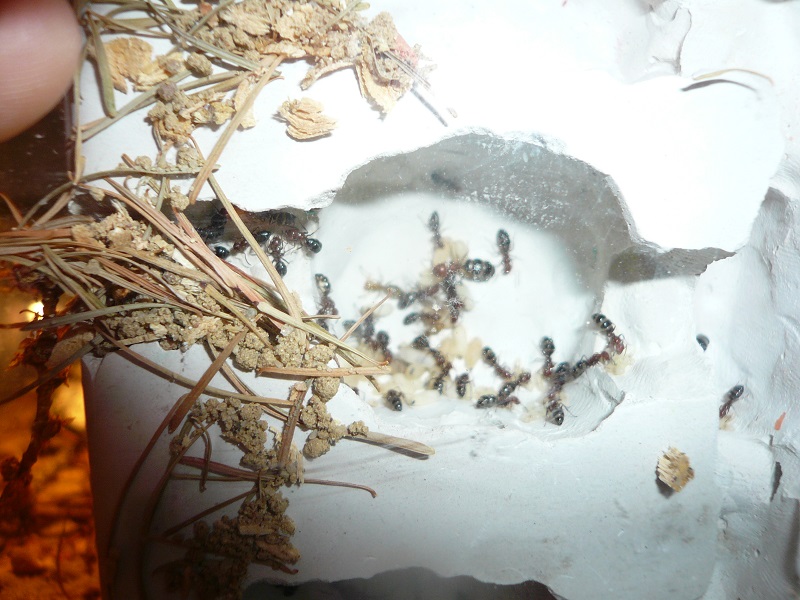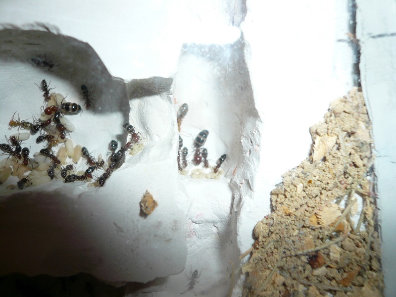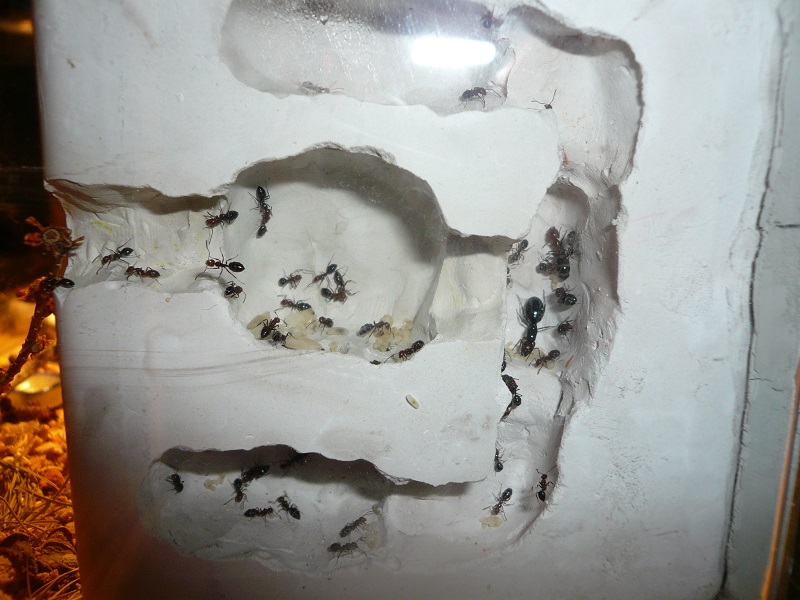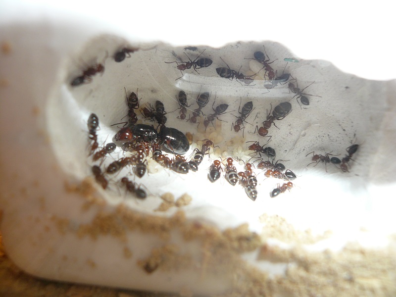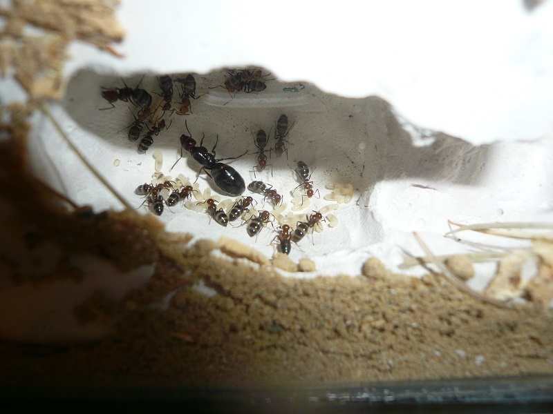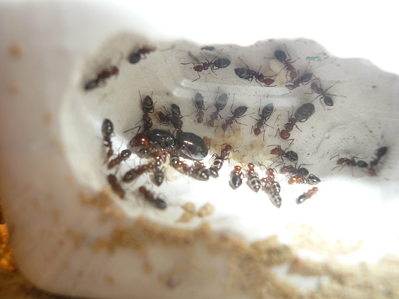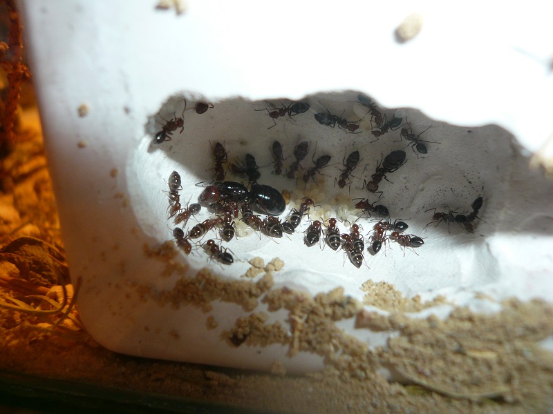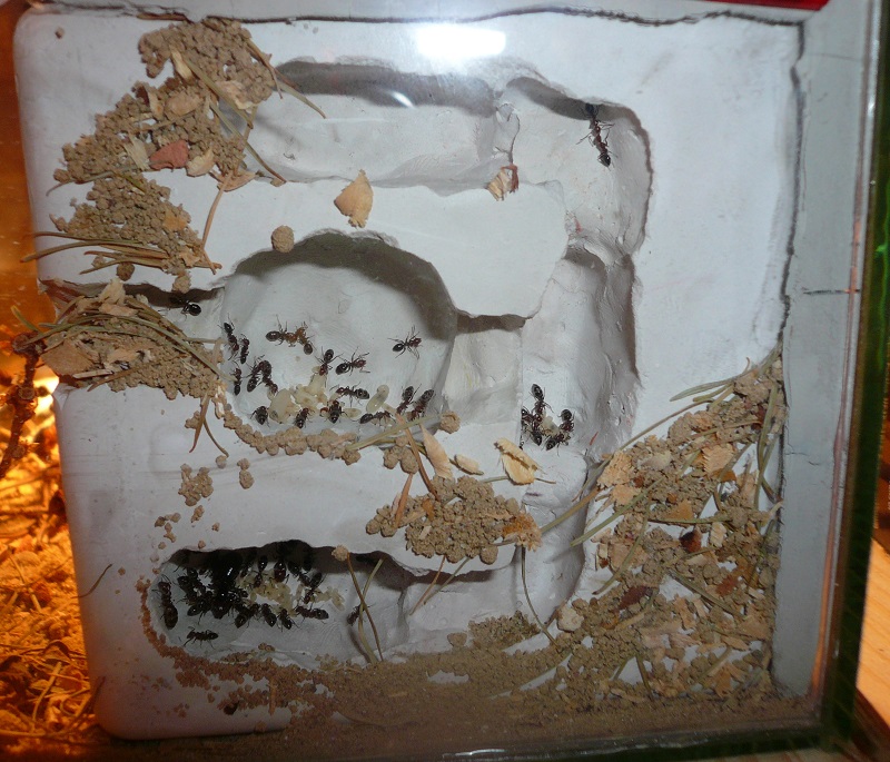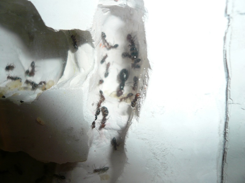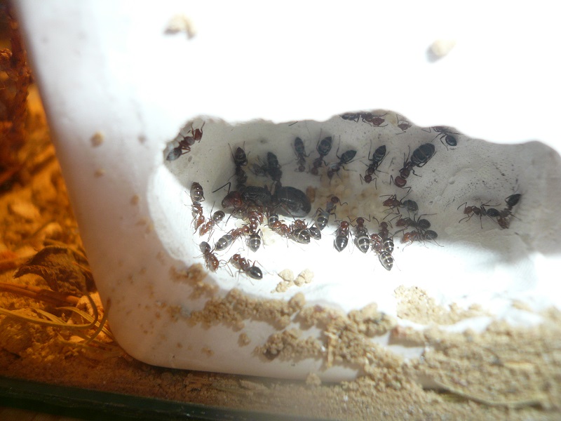 Ich hab sie natürlich gleich ins Formi gelegt und ihnen Honigwasser und eine Mücke angeboten. Nachdem die etwa 60 Arbeiterinnen ihre Scheu überwunden hatten, haben sie gleich ihre 30x20x20 Arena erkundet und haben dabei auch das selbstgebastelte Gipsnest gefunden und erkundet. Und während das Honigwasser dankend abgelehnt (sie hatten wohl keinen Durst, jede zweite war physiogastrisch) und die Mücke von einem Ende der Arena zu anderen gezerrt wurde, bildete sich eine immer belaufener werdende Ameisenstraße ins Nest, bis schließlich auch die zahlreiche Brut, die beiden Majore, die wohl als Repleten dienen (beide waren randvoll mit Honigwasser), und auch die Königin umzogen.
