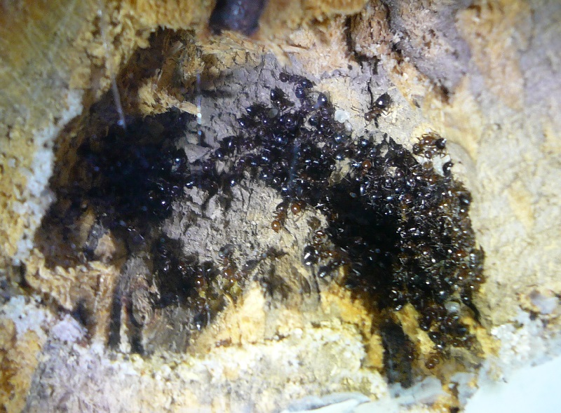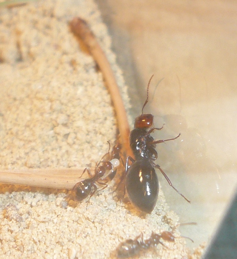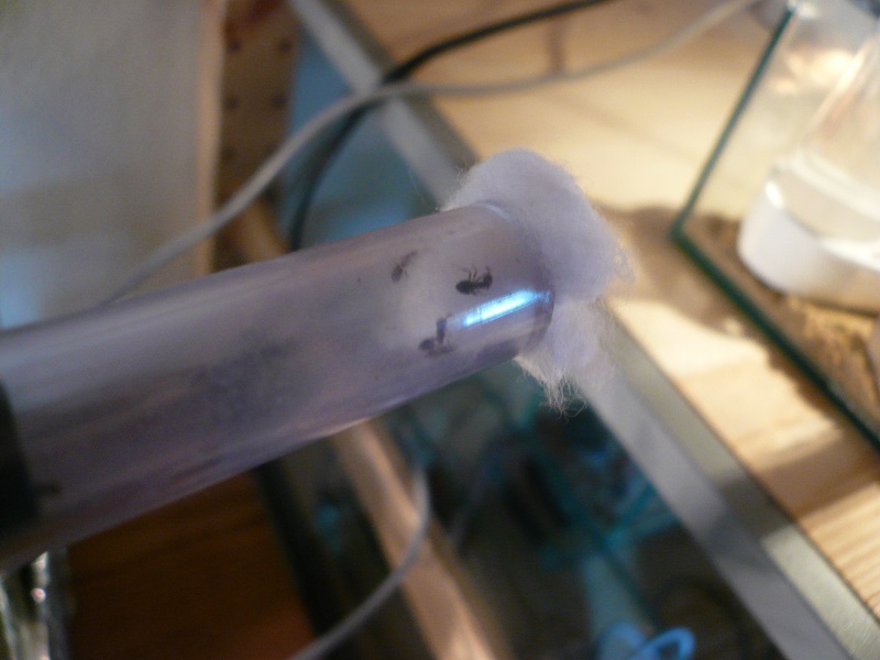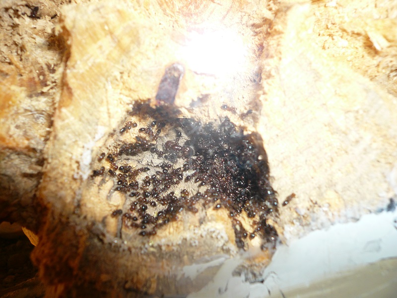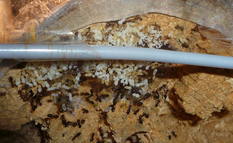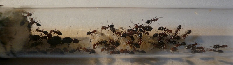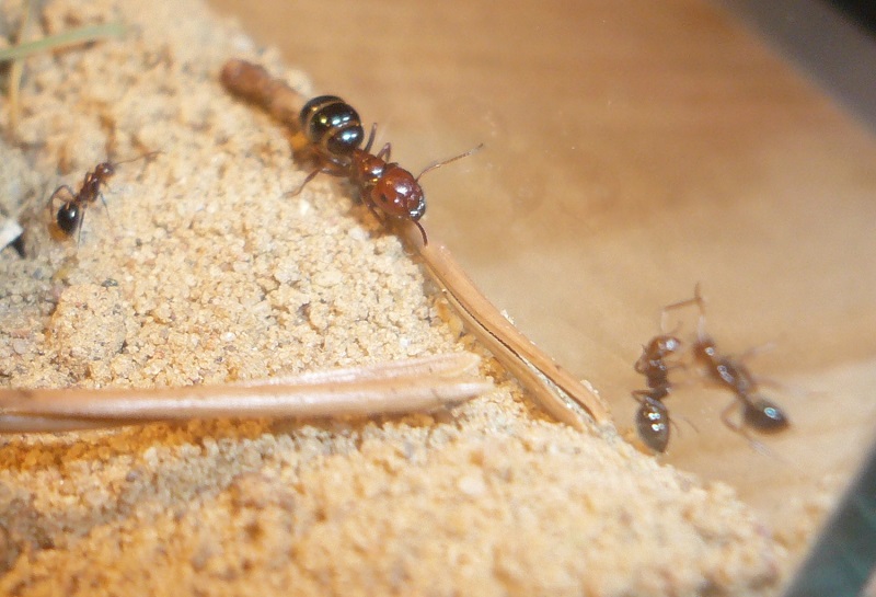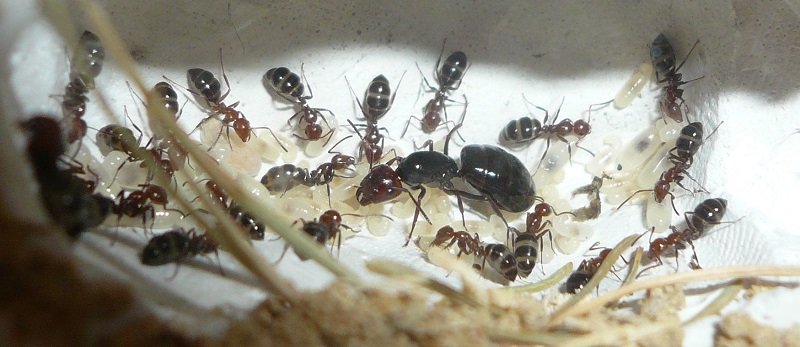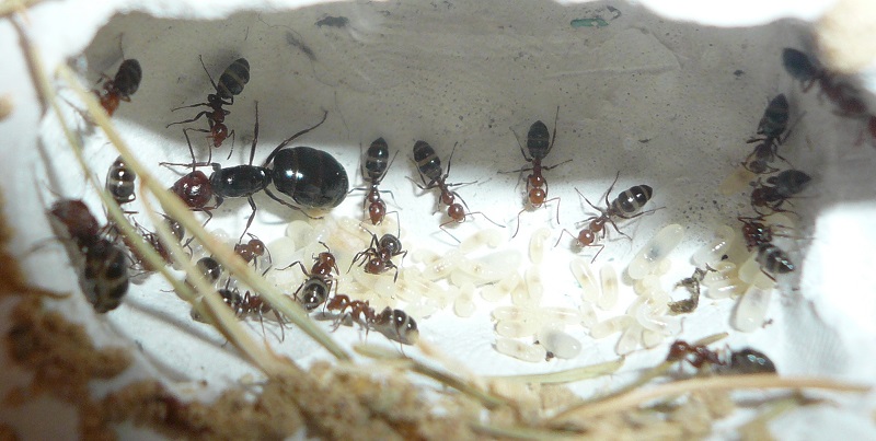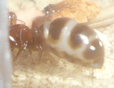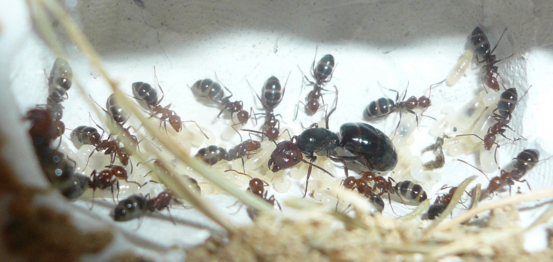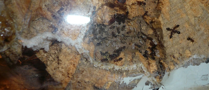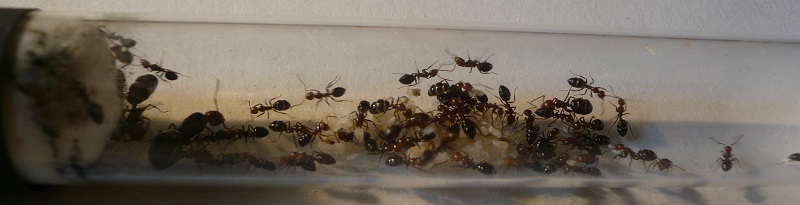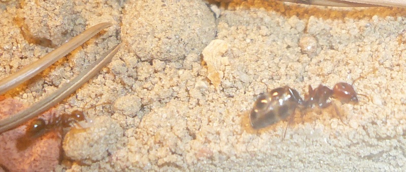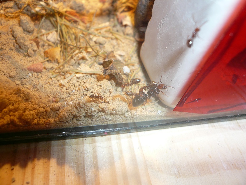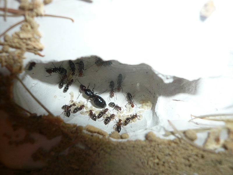 Ich hab sie natürlich gleich ins Formi gelegt und ihnen Honigwasser und eine Mücke angeboten. Nachdem die etwa 60 Arbeiterinnen ihre Scheu überwunden hatten, haben sie gleich ihre 30x20x20 Arena erkundet und haben dabei auch das selbstgebastelte Gipsnest gefunden und erkundet. Und während das Honigwasser dankend abgelehnt (sie hatten wohl keinen Durst, jede zweite war physiogastrisch) und die Mücke von einem Ende der Arena zu anderen gezerrt wurde, bildete sich eine immer belaufener werdende Ameisenstraße ins Nest, bis schließlich auch die zahlreiche Brut, die beiden Majore, die wohl als Repleten dienen (beide waren randvoll mit Honigwasser), und auch die Königin umzogen.