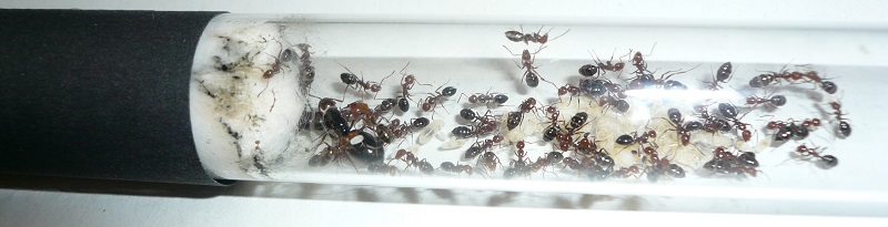 Außerdem hat sich eine Ameisenstraße zu dem ums Eck führenden Schlauchverbinder, der oben ins Formi eingebaut ist (wegen den Vergesellschaftungsversuchen, Beschreibung siehe Tag 157) gebildet und sie haben etwas Karton, den ich ihnen im vorigen Jahr in der Hoffnung auf ein Kartonnest reingeworfen hatte, dort reingefriemelt. Außerdem knabbern sie an der Watte, die ich zu Verschlusszwecken in das Schlauchende in Richtung