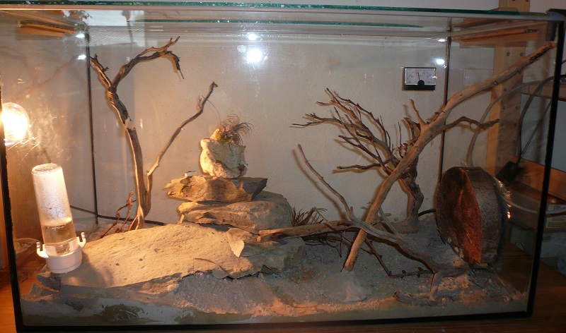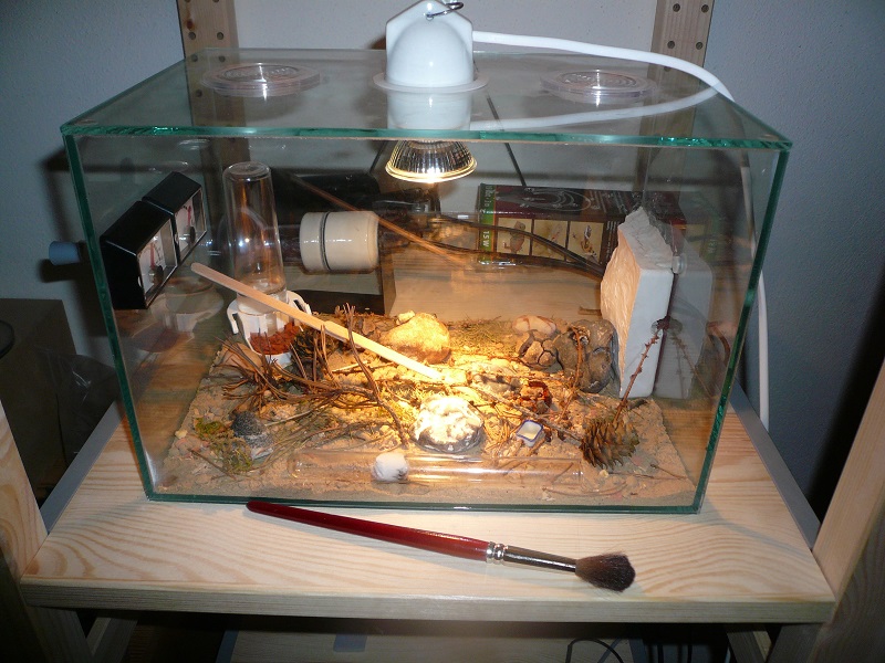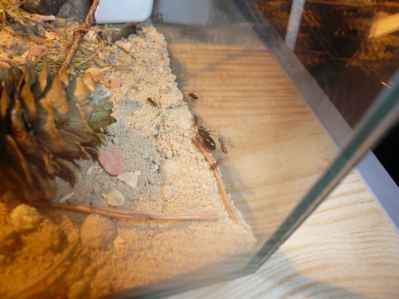 Zum Formi: Ich hab eine 30x20x20 Arena vom Antstore mit einem 35W-Halogenstrahler und einem selbstgebautem Gipsnest drin. Wie es eingerichtet ist, sieht man auf den Fotos.
