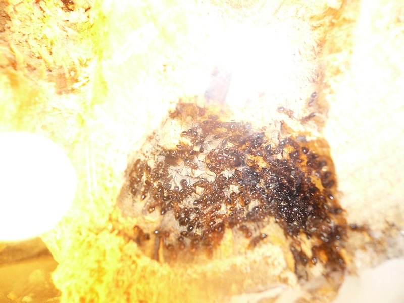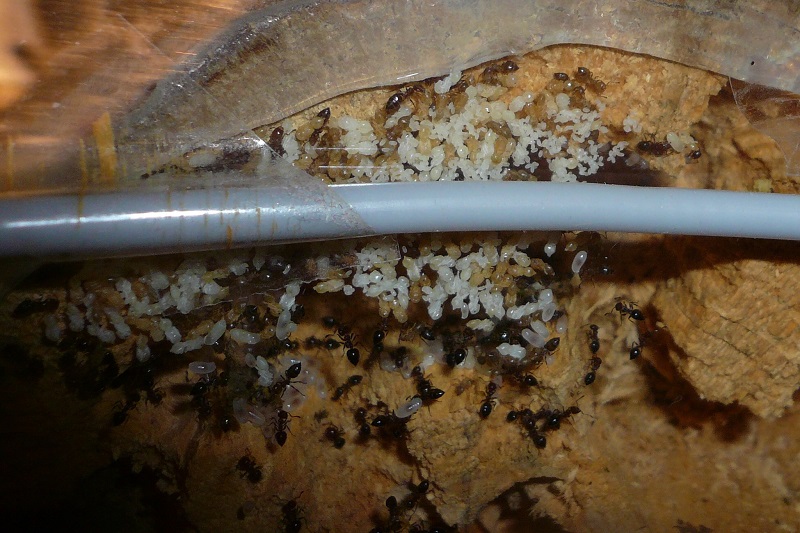 Man merkt, dass sie den neuen Halogenstrahler mit 20 Watt sehr viel besser finden als den alten mit 35, der das Formi auf knapp über 30° brachte. Sie fouragieren mehr und tragen Fliegen gerne ein. Obwohl ich sie recht selten mal am Zuckerwasser sehe, sind immer noch fast alle physiogastrisch und auch der Brut geht's gut, während weiterhin fleißig Nadeln und Sand in das Gipsnest (ich fertige übrigens gerne auf Maß solche Gipsnester an, einfach bei mir melden) transportiert werden.
