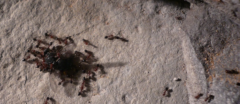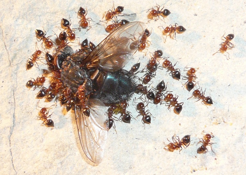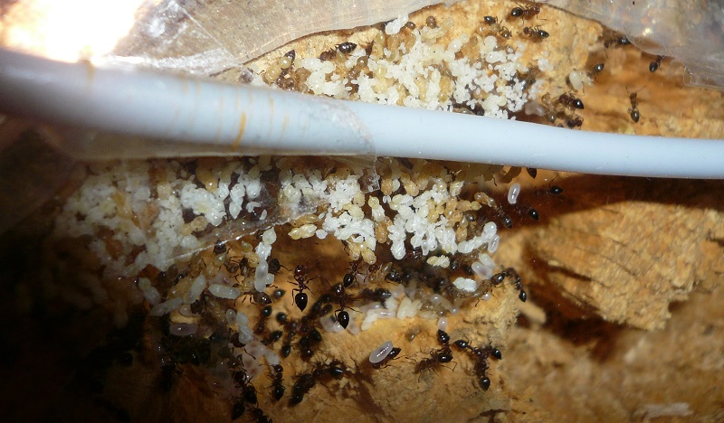 Ich muss sagen, die schmidtis machen mir Freude. Vor allem, seit ich ihnen in den Osterferien ein ursprünglich für meine Messor Gyne gedachtes Heizkabel vor ihrem Nest entlang geführt habe und deshalb jetzt auch von der Crematogaster-typischen explosionsartigen Vermehrung sprechen kann. Die Gyne legt wohl Eier ohne Ende, denn wie man auf den Fotos sieht, benutzen sie diese sogar als Baumaterial, um den Nesteingang zu verengen. Das schlägt sich auch im Proteinbedarf nieder: Ich hab das Gefühl, ihren Futterbedarf nie ganz decken zu können, jedenfalls ist es noch nicht passiert, dass sie eine Fliege verschmäht haben, weil sie keinen Hunger mehr hatten und sie stürzen sich auf jede Fliege, die ich ihnen in das (übrigens in der Winterruhe radikal umdesignte) Formi lege und es bilden sich tolle Straßen.