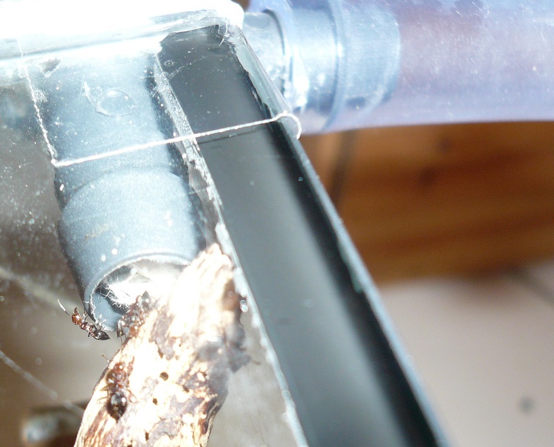 Außerdem hat sich eine Ameisenstraße zu dem ums Eck führenden Schlauchverbinder, der oben ins Formi eingebaut ist (wegen den Vergesellschaftungsversuchen, Beschreibung siehe Tag 157) gebildet und sie haben etwas Karton, den ich ihnen im vorigen Jahr in der Hoffnung auf ein Kartonnest reingeworfen hatte, dort reingefriemelt. Außerdem knabbern sie an der Watte, die ich zu Verschlusszwecken in das Schlauchende in Richtung lateralis gestopft hatte. Kann es sein, dass sie sich in dem Eck-Schlauchverbinder-Stück ein Kartonnest bauen wollen? Es wundert mich zwar (im Nest ist noch ordentlich Platz), aber es ist wohl so.
