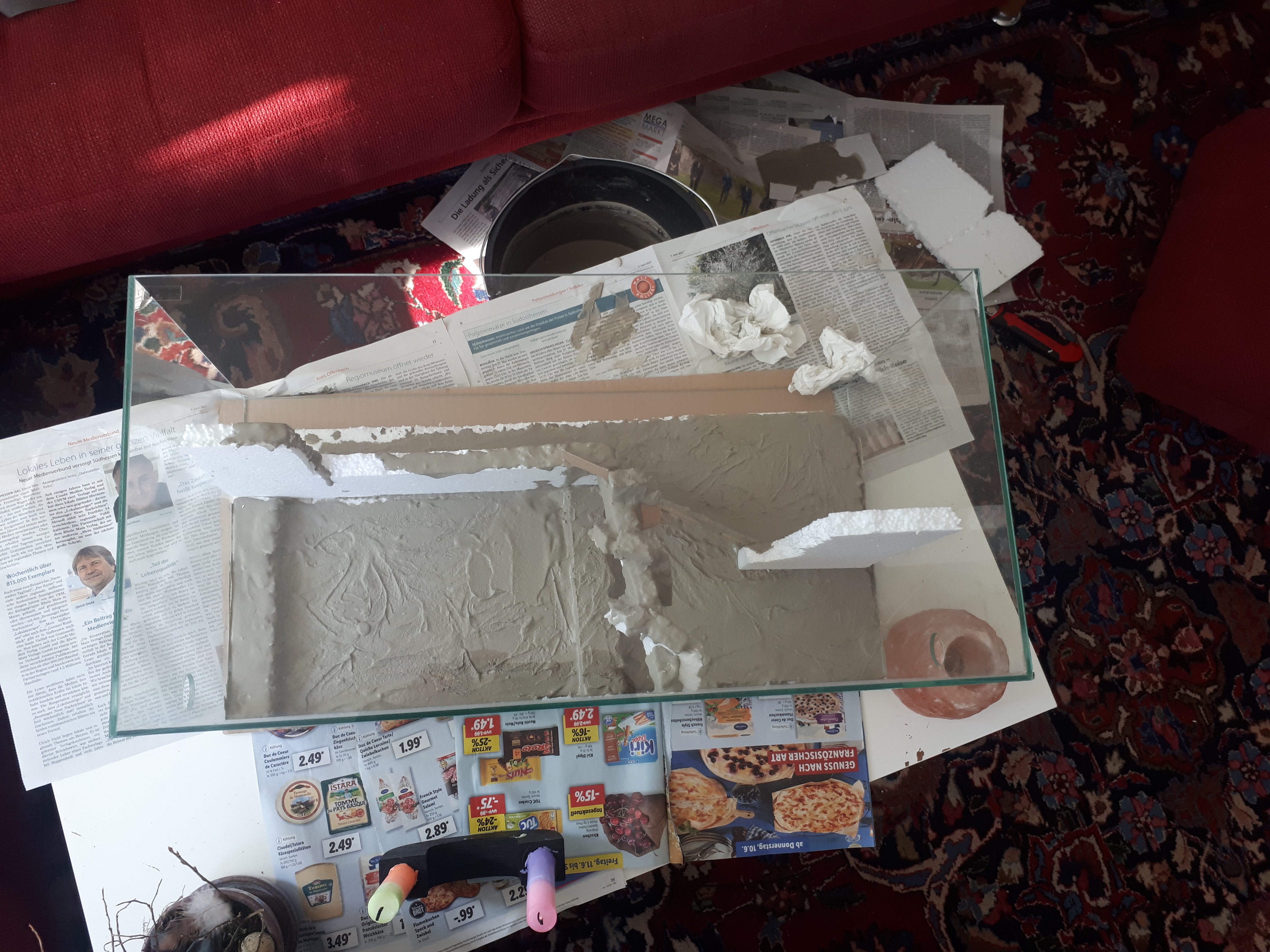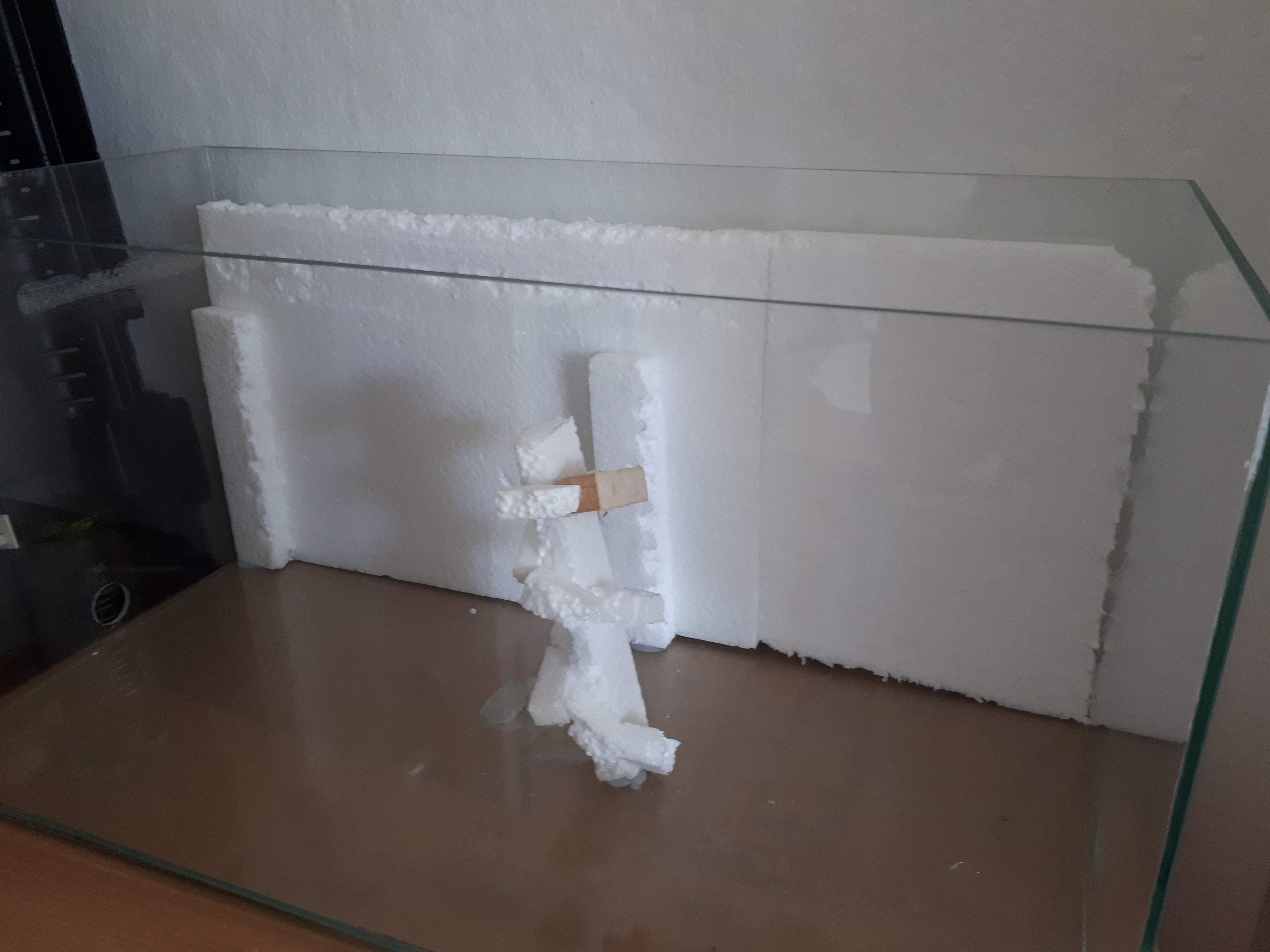 Angefangen habe ich, indem ich Styroporplatten als RĂŒckwand in einem 60x30er Becken aus dem Antstore mit Aquariensilikon verklebte und eine "Wendeltreppe" errichtete - ebenfalls aus Styropor, Silikon und zudem Holzverschnitt.
