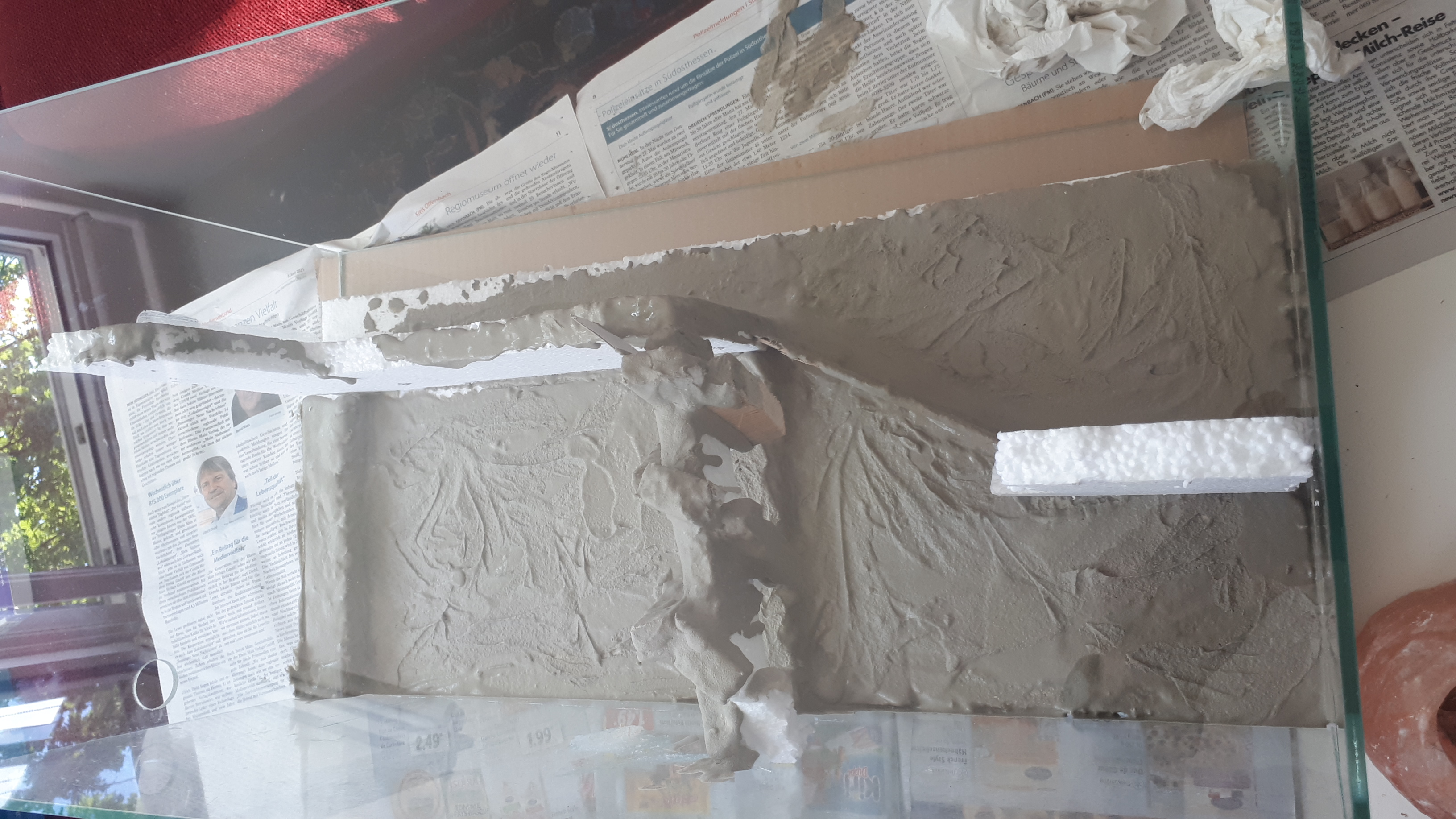 Im nĂ€chsten Schritt wurden RĂŒckwand und Treppe und die mit diesen verklebten Plattformen aus Styroporplatten mit Fliesenkleber (angeblich Flex-Kleber, aber wie man damit gezielt Formen ausarbeiten kann, ist mir jedenfalls immer noch ein RĂ€tsel) bestrichen.
