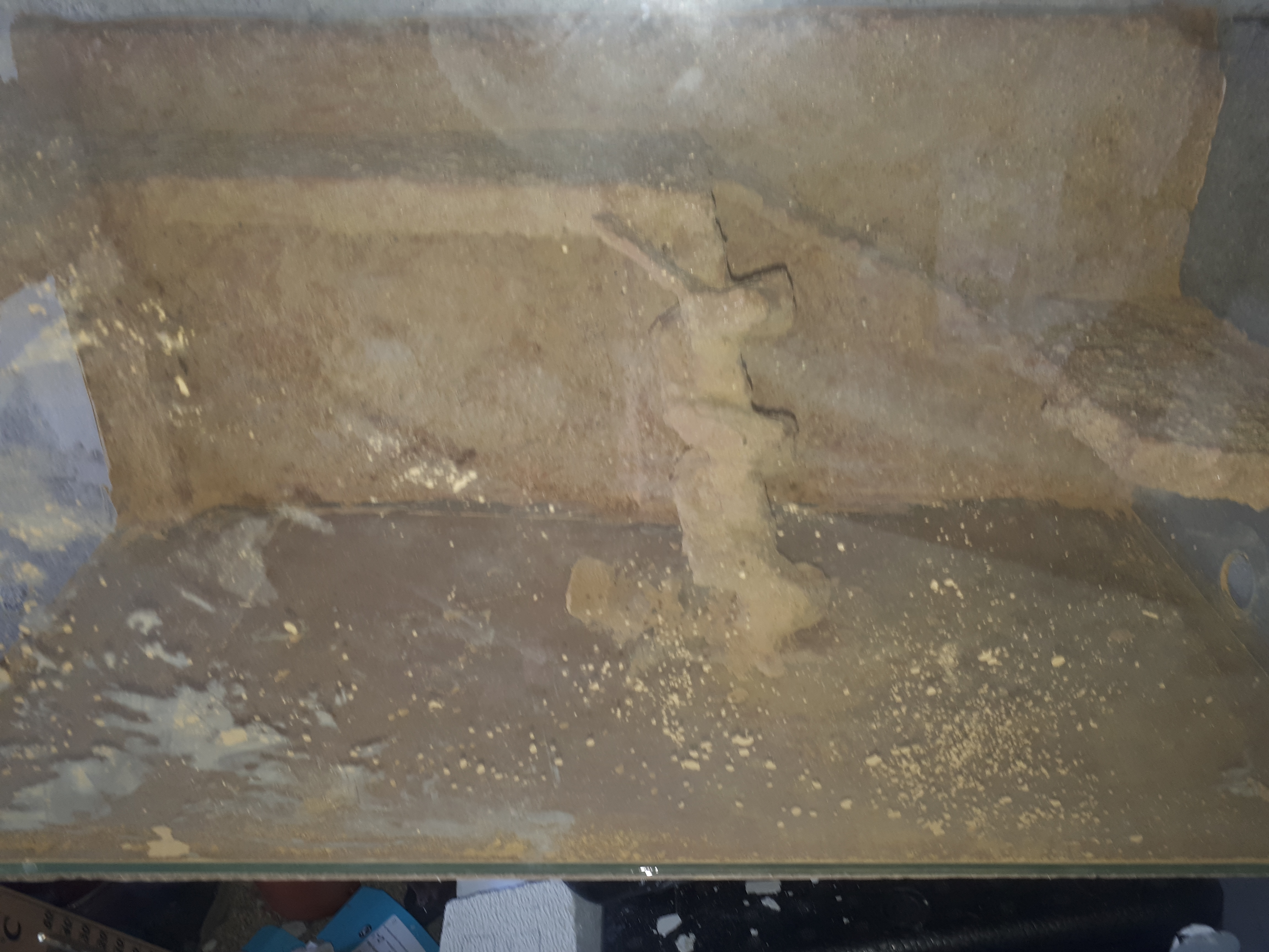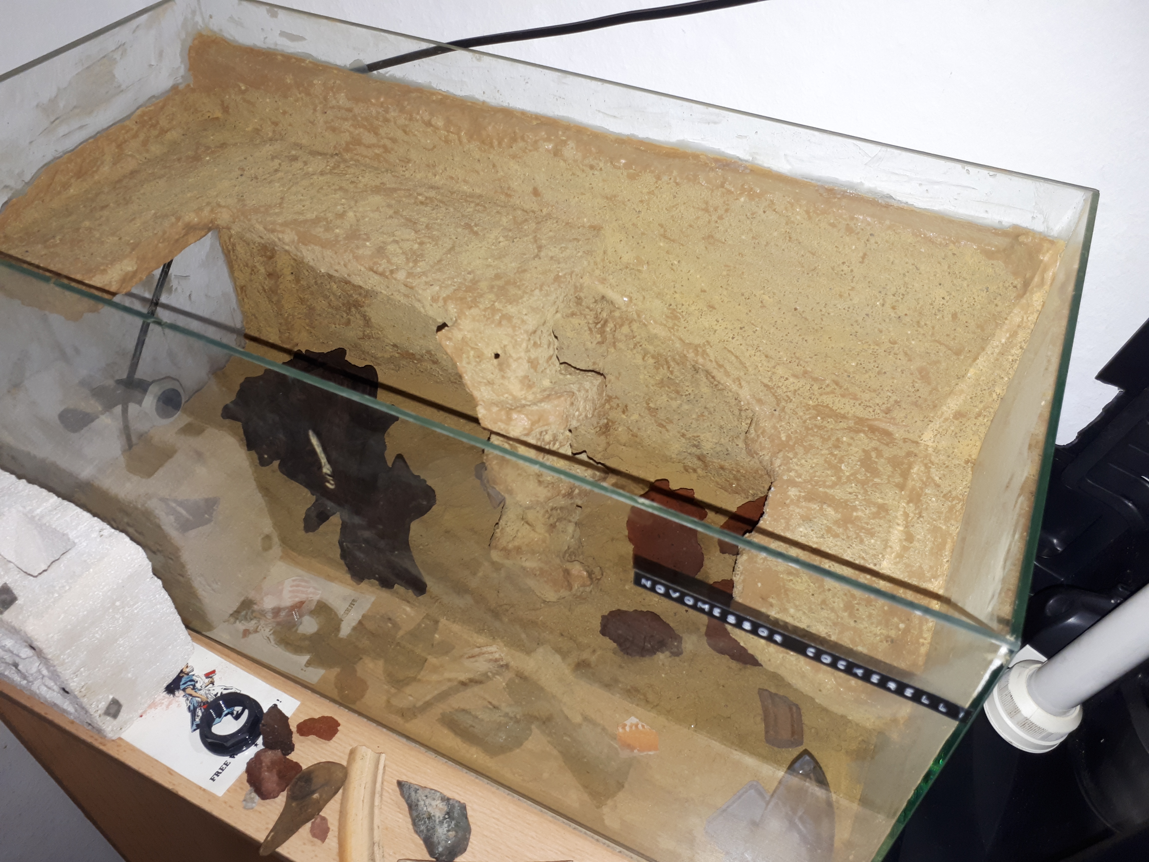 Zur Gestaltung des WĂŒstenbodens nahm ich eine grabfĂ€higes WĂŒstensubstrat aus dem Zoohandel und mischte die 4-5fache Menge Lehm dazu, wollte das ganze befeuchten und machte es zu Matsch. Was aber nicht schlecht aussieht, wie ich finde, da das fĂŒr die Rissbildung, die nach ausgetrocknetem Flussbett oder Wadi aussieht, sorgte.
