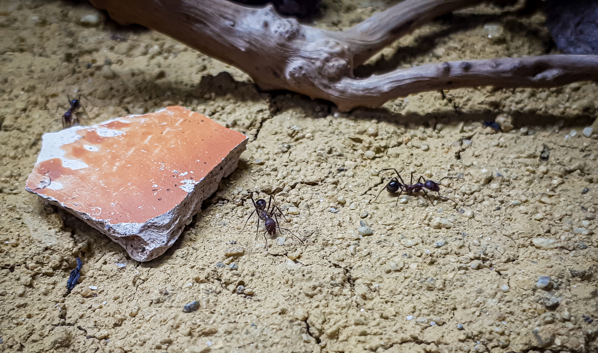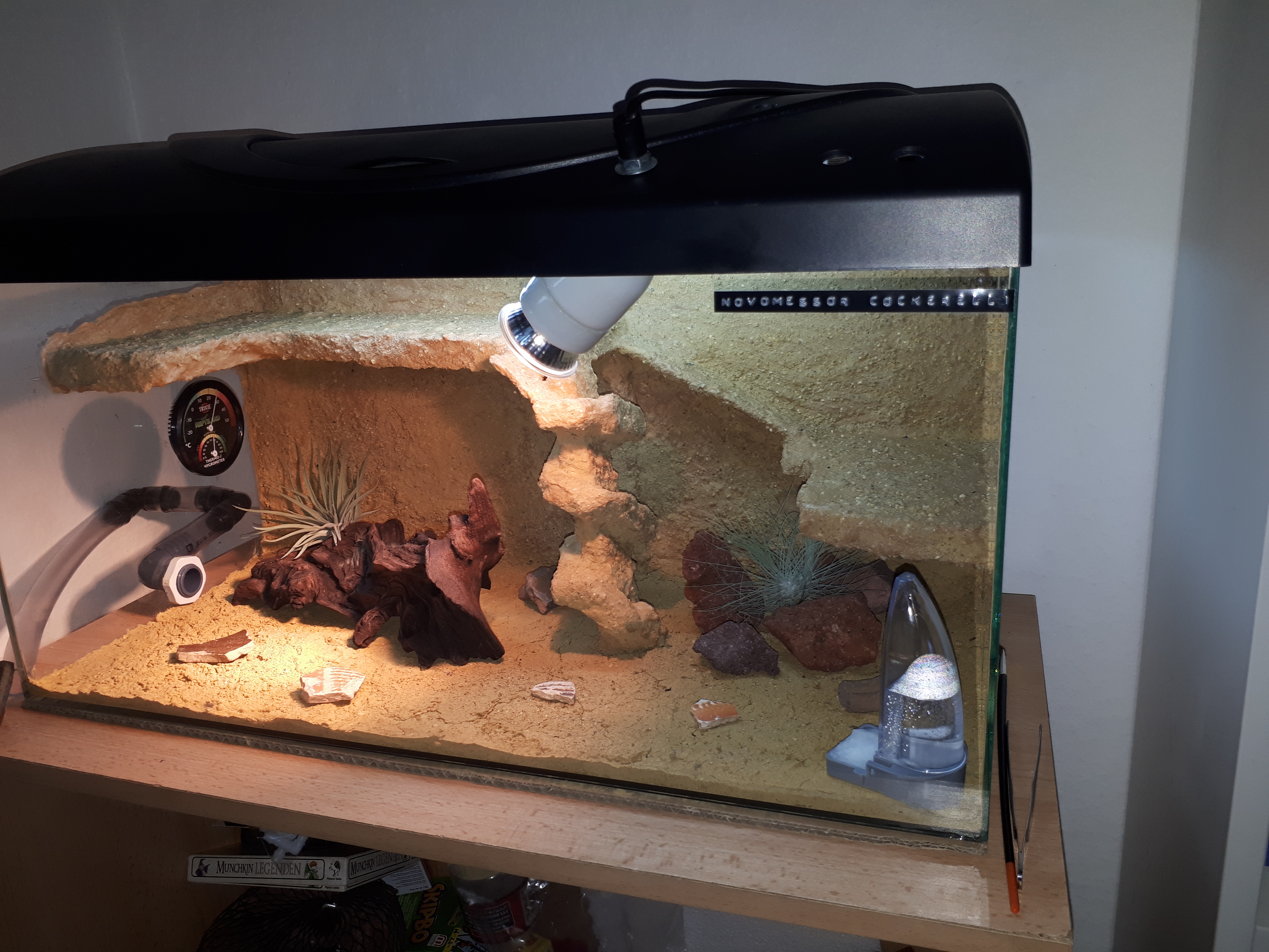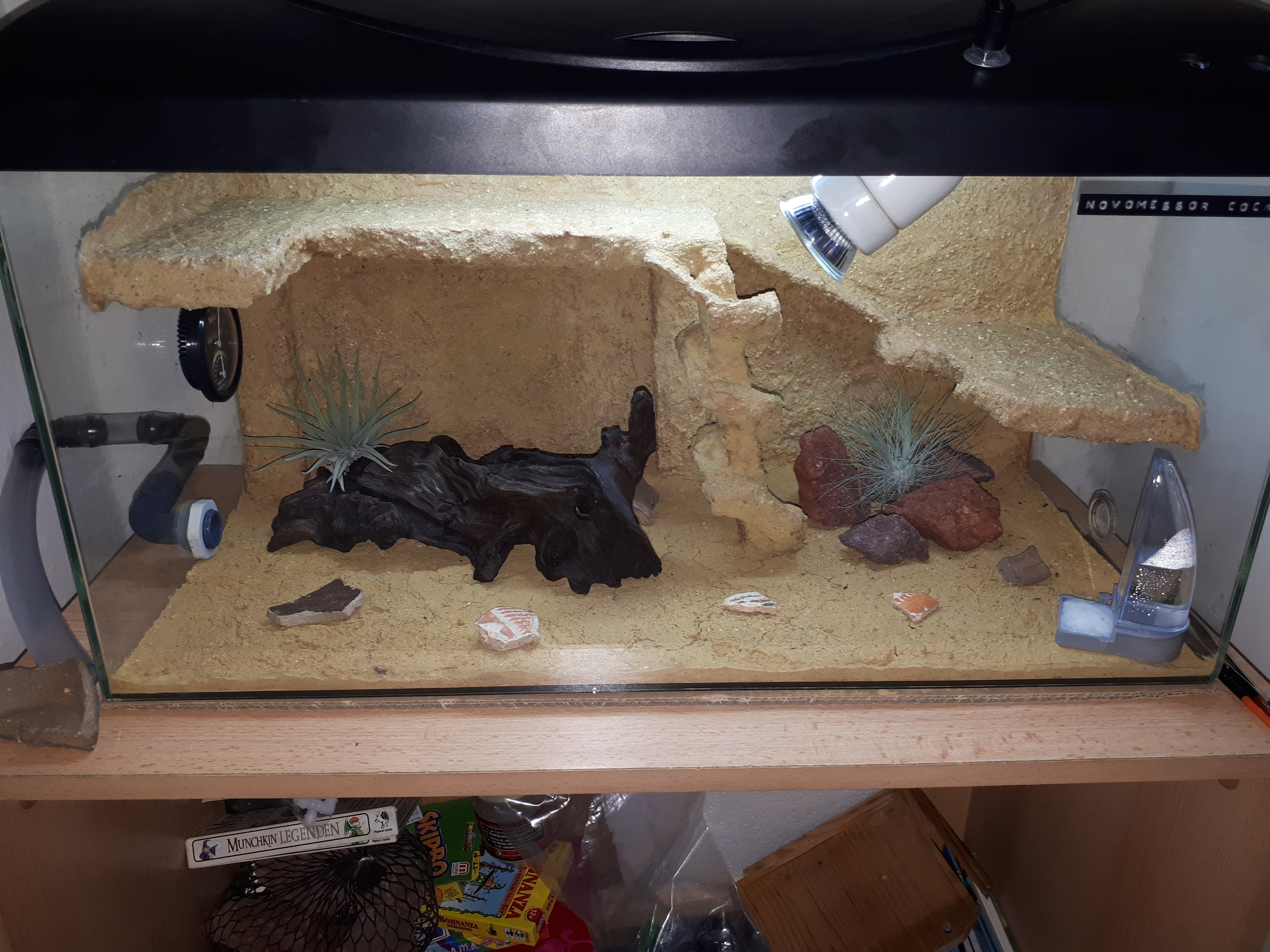 Jop, dann noch Deko rein - eine Aquarienwurzel, zwei Tillandsien, diverse Scherben von der Arbeit, Lavasteine und schon hat man eine ziemlich schöne Arena!