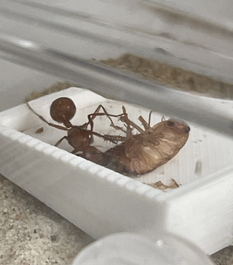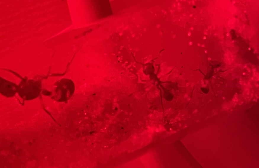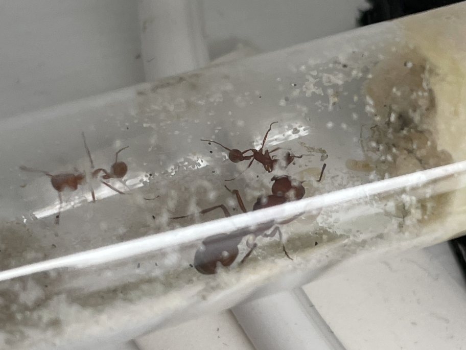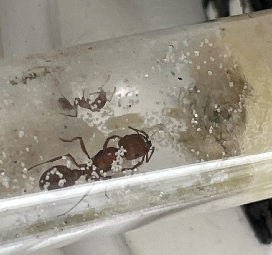 Brut vorhanden und wie bereits beschrieben zwei Arbeiterinnen. Man sieht bereits jetzt Größenunterschiede bei den Arbeiterinnen.