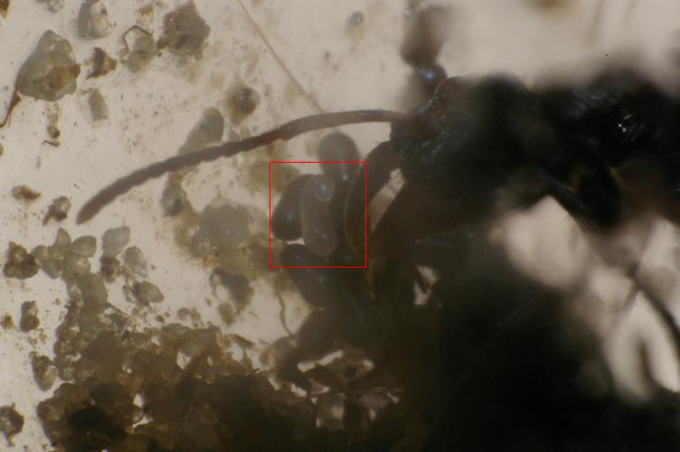 Desweiteren wäre die Geschichte mit dem weißen Ei geklärt. Ectatomma ruidum legt weiße Eier, die dann kurz darauf dunkel, fast schwarz werden. Warum das so ist, weis ich nicht. Würde mich aber echtmal interessieren. Vielleicht einfach nur eine chemische Reaktion eventuell zur Tarnung in der Erde. Weil weiße Eier auf brauner Erde sind schon deutlich sichtbarer. Aber welche natürliche Feind könnte da dahinter stecken? Die gekrümmte Haltung nimmt Emma auch nur zum Eierlegen ein. Sie nimmt dann direkt das Ei in die Mandiblen und legt es ab.