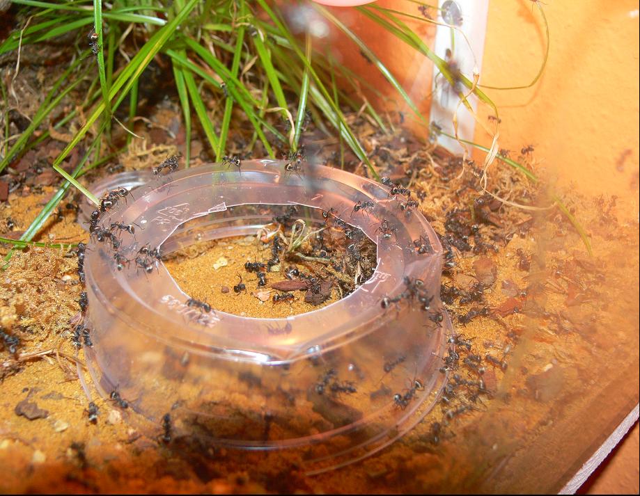 DurchfĂŒhrung: Man nehme eine Plastikschale und schneidet in den Boden ein Loch mit ca. 5 cm Durchmesser. Das SchĂ€lchen stellt man kopfĂŒber im Terrarium auf und gibt durch die Ăffnung ein Heimchen hinein. Nun werden 2-4 Arbeiterinnen ebenfalls durch die Ăffnung gegeben.
