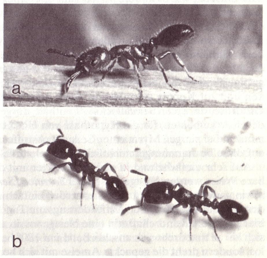 http://ameisenforum.de/attachment.php?attachmentid=8447&stc=1&d=1200157917Die Fähigkeit zu kommunizieren ist eine der wichtigsten Vorraussetzungen für das Sozialverhalten untereinander. Daher haben speziell Ameisen aufgrund ihrer sehr hoch entwickelten Sozialstruktur ein besonders großes Repertoire an Verständigungsmöglichkeiten. Die Kommunikation zwischen Ameisen findet zumeist auf einem chemischen Niveau mithilfe verschiedenster Pheromone statt. Wichtige chemische- / oder olfaktorische Kommunikationssignale sind Orientierungsmarken, Rekrutierung von Nestgenossen, Alarmsignale, die bei der Verteidigung des Nestes zum Einsatz kommen, und die Beutealarmsignale bei der Erlegung eines größeren Beutetiers, letztere werde ich im weiteren Verlauf der Facharbeit detaillierter auslegen. Die Kommunikation beschränkt sich jedoch nicht nur auf chemische Signale. Oft dienen auch Klopf- oder Stridulationssignale zur Alarmierung der Artgenossen, was zur mechanischen Kommunikation zugehörig ist. Eine weitere häufige verwendete Verständigung unter Ameisen ist die taktile Kommunikation. Hierbei werden mit Körperkontakt Information ausgetauscht oder sogar um Futter gebettelt. Ein Beispiel für die taktile Kommunikation wäre der unter den Ameisen der weit verbreitete Tandemlauf. Hierbei führt eine kundige Ameise eine andere zu einem Futterplatz oder einem geeigneten Nistplatz. Beim Tandemlauf berührt die Folge-Ameise ständig die Hinterbeine und die Gaster der kundigen Ameise um somit ihr ihre Gegenwart signalisiert. Falls der Kontakt unterbrochen wird wartet die kundige Ameise und versprüht ein Pheromon, welches die Folge-Ameise anlockt. Hier sieht man deutlich das Zusammenspiel von taktile und olfaktorische Kommunikation. Im frühen 20 Jahrhundert glaubten Forscher die Sprache der Ameisen mithilfe der taktilen Kommunikation vollständig analysiert zu haben. Sie beobachteten Ameisen, welche sich mit ihren Fühlern in einer abwechselnden Frequenz berührten. Aufgrund dieser Beobachtungen und mangelnder chemischer Nachweise wurde die Kommunikation zwischen Individuen eines Ameisenstaates auf die mechanische und taktile Kommunikation, die „Fühlersprache“, reduziert (vgl. Dettner 1999, S. 489ff).