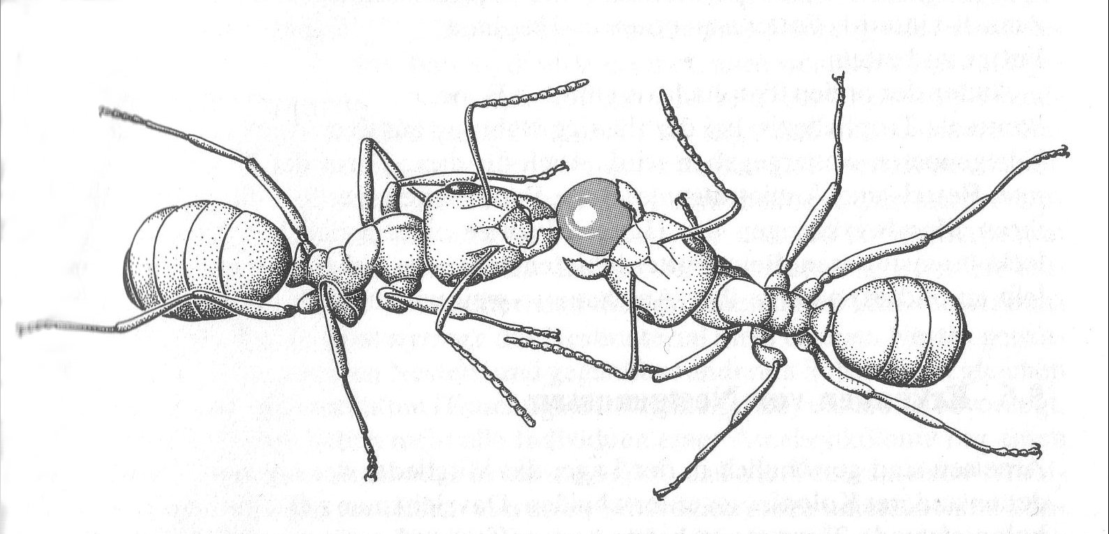 Dabei „betteln“ Ameisen ihre Artgenossen an indem sie mit den Fühlern und den Forderbeinen den Kopf des anderen Artgenossen betrommeln. Dadurch würgt die Artgenossin aus ihrem Kropf eine kleine Menge flüssiger Nahrung hervor. Dieses rituelle Verhalten wird bei fast allen Ameisenarten beobachtet und als Sozialstruktur festigend gedeutet. Eine ganz besondere alltägliche Kommunikation führen nur wenige ausgewählte Ameisen, denn die Brutpflege Arbeiterinnen sind ihr ganzes Dasein nur für die Brut zuständig. Die Kommunikation mit der Brut ist eine rein chemische Kommunikation. Die Arbeiterinnen erkennen das Stadium der Larve und behandeln diese mit spezieller Sorgfalt nach dessen Bedürfnissen. Es ist zu beobachten, dass diese Arbeiterinnen bei Alarmverhalten die Brut schnellstmöglich vom Geschehen fort transportieren, wobei andere Individuen ihre derzeitige Aktivität abbrechen und sofort eingreifen. (vgl. Dumpert 1978, S. 63ff)