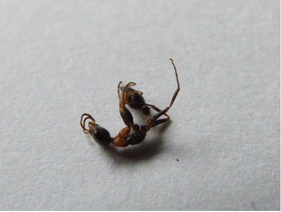 Eine Arbeiterin ist vollkommen normal durch das Terrarium gelaufen und hat nur gelegentlich ihren Gaster in die Höhe gestreckt. Auf einmal fÀllt sie vom Ast und windet sich eine Stunde am Boden, bis sie stirbt...