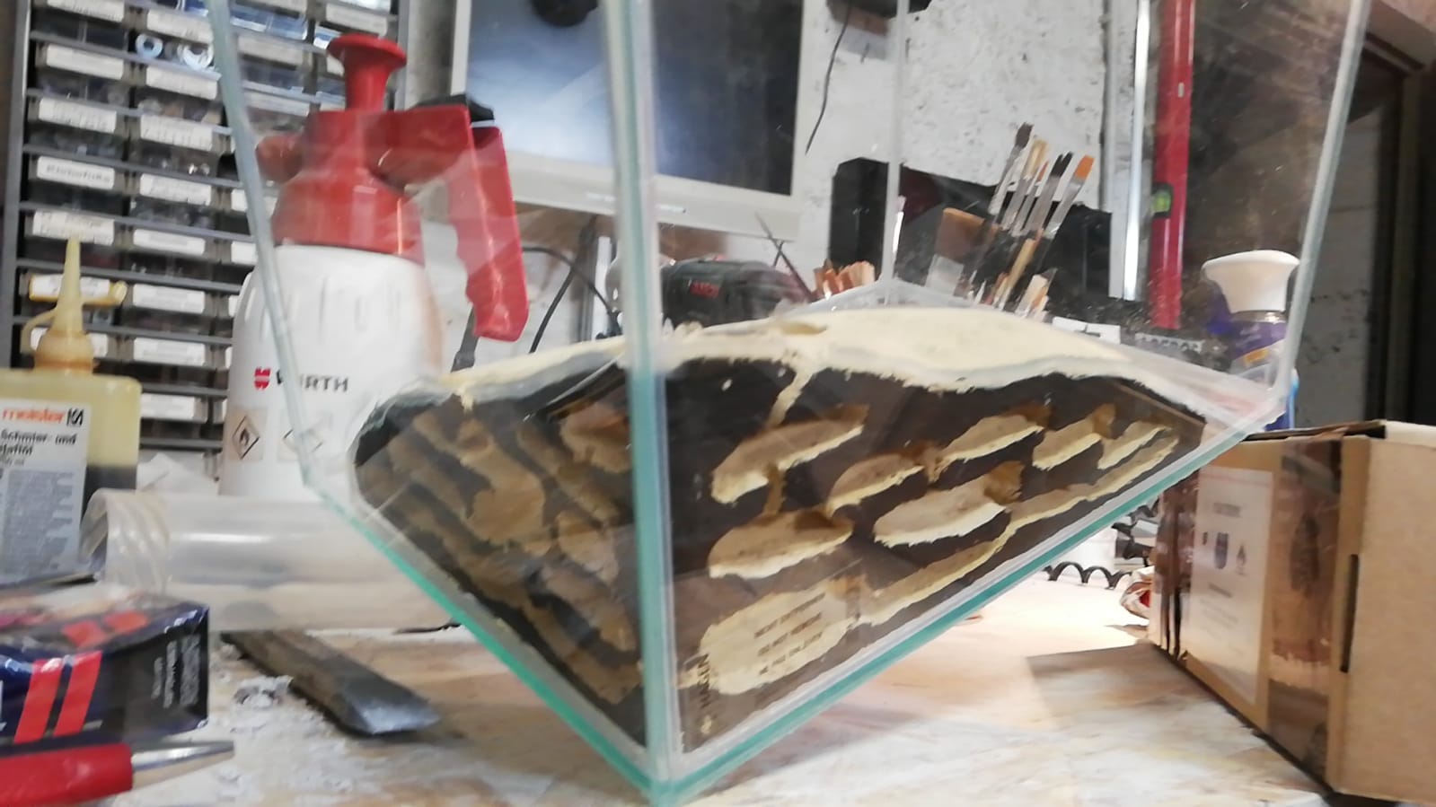 Die Stoßflächen noch mit Umbra bemalt, damit die Kammern besser zur Geltung kommen. Der Boden ist so eine Sand/Lehmmischung die ich mal gekauft hatte weil sie aussah wie aus dem Outback