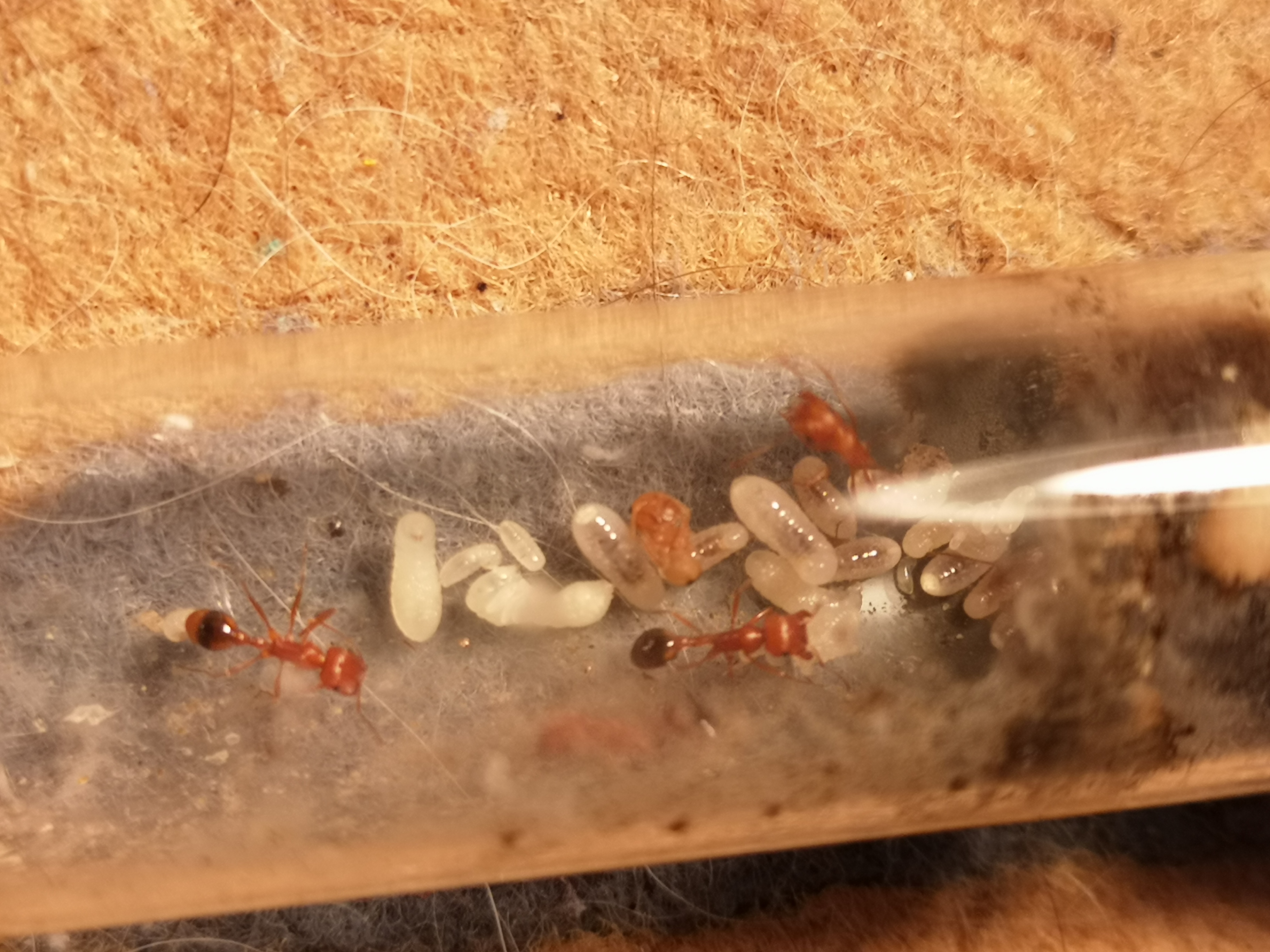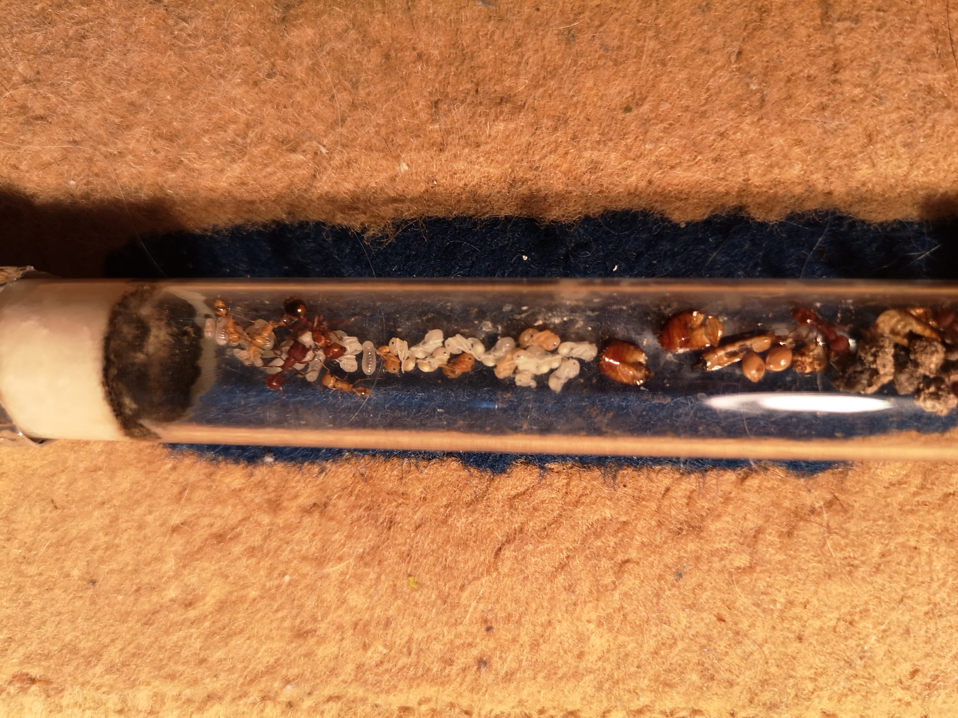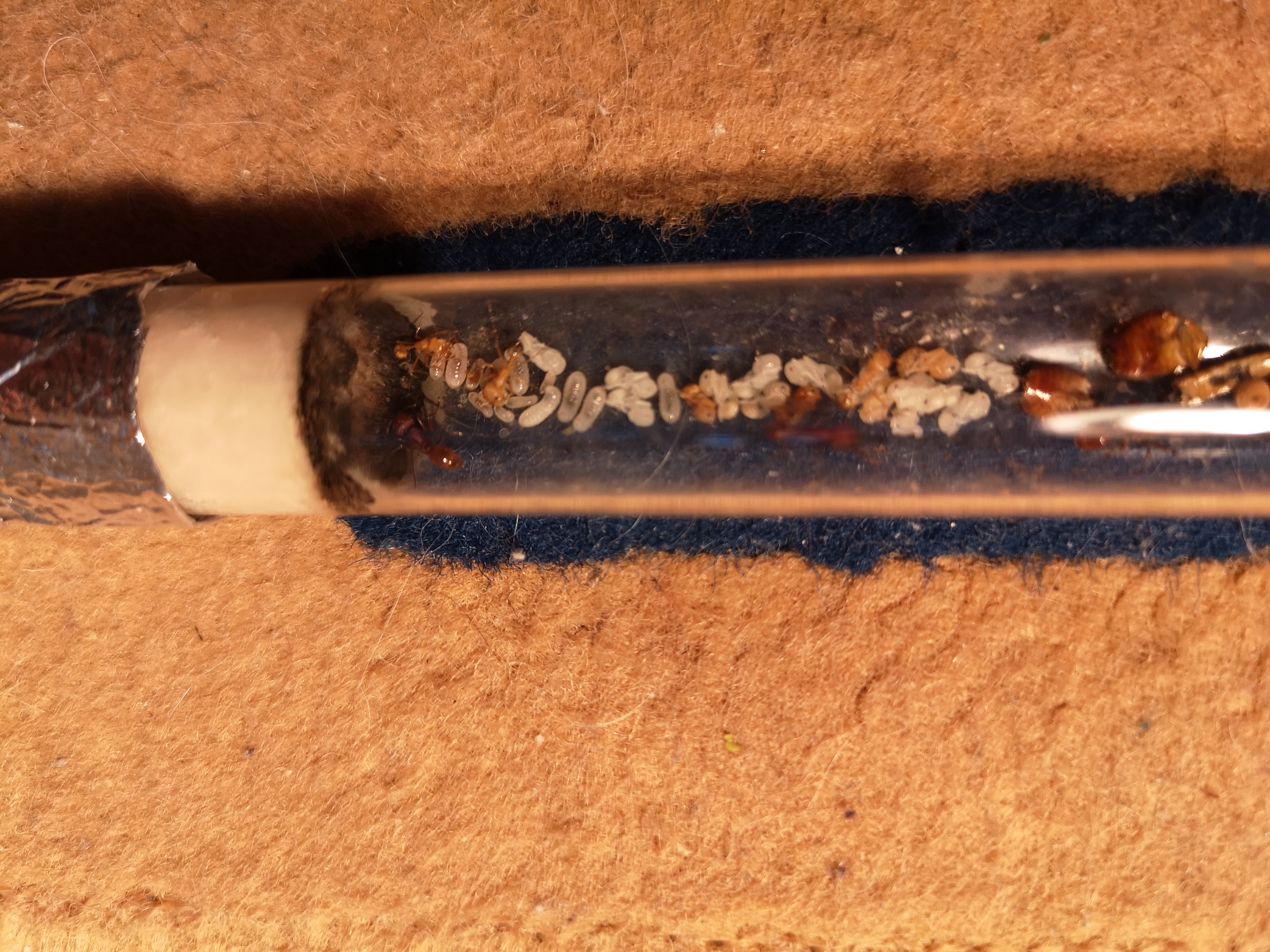 Königin stammt ursprünglich aus Kalifornien (hatte extra nachgefragt, war mir wichtig. Ich besitze noch eine große Pogonomyrmex occidentalis Kolonie und gab aus Neugier 3 Nacktpuppen in der ersten Woche nach Erhalt dazu um zu schauen ob diese akzeptiert werden. Die