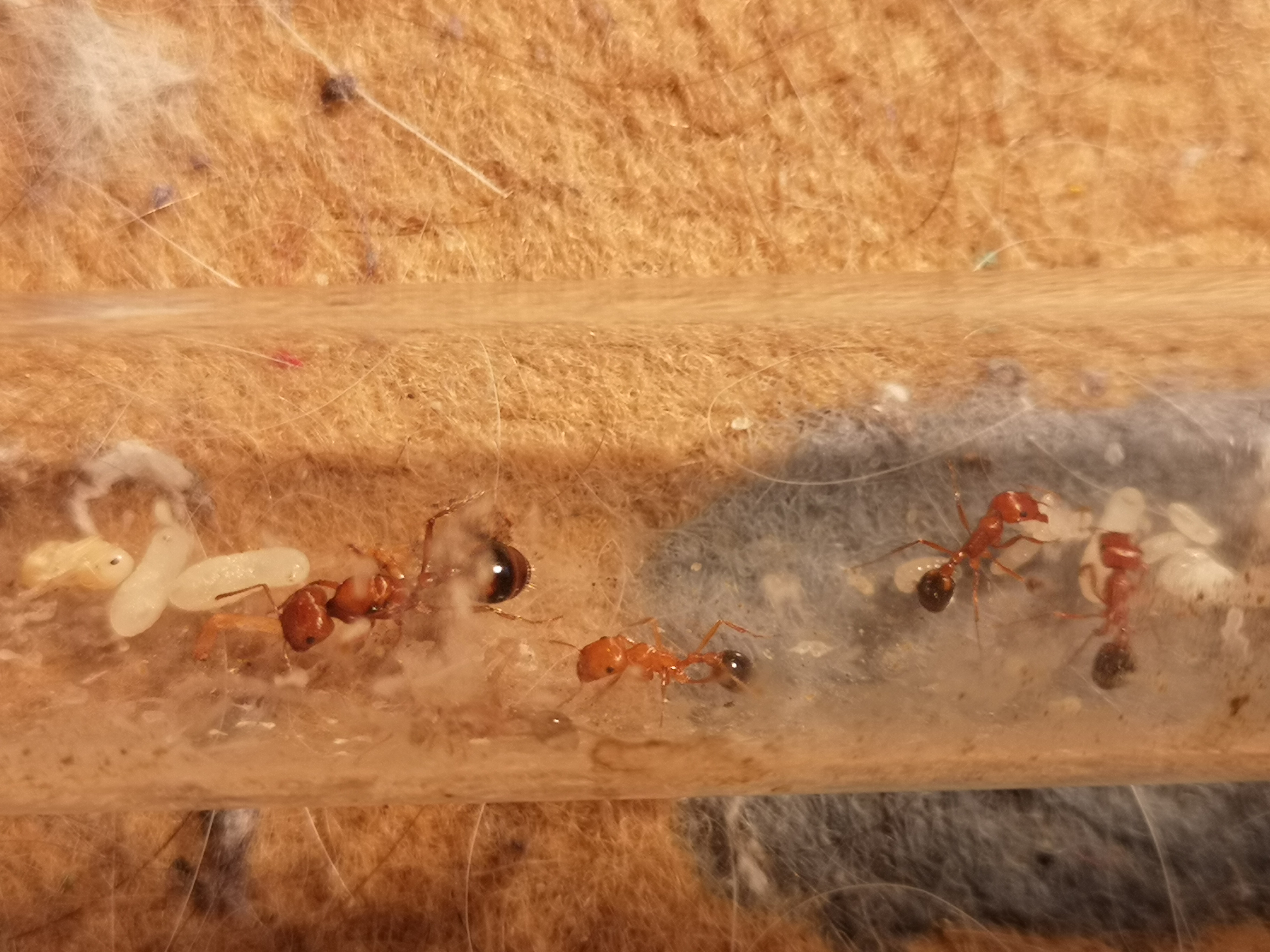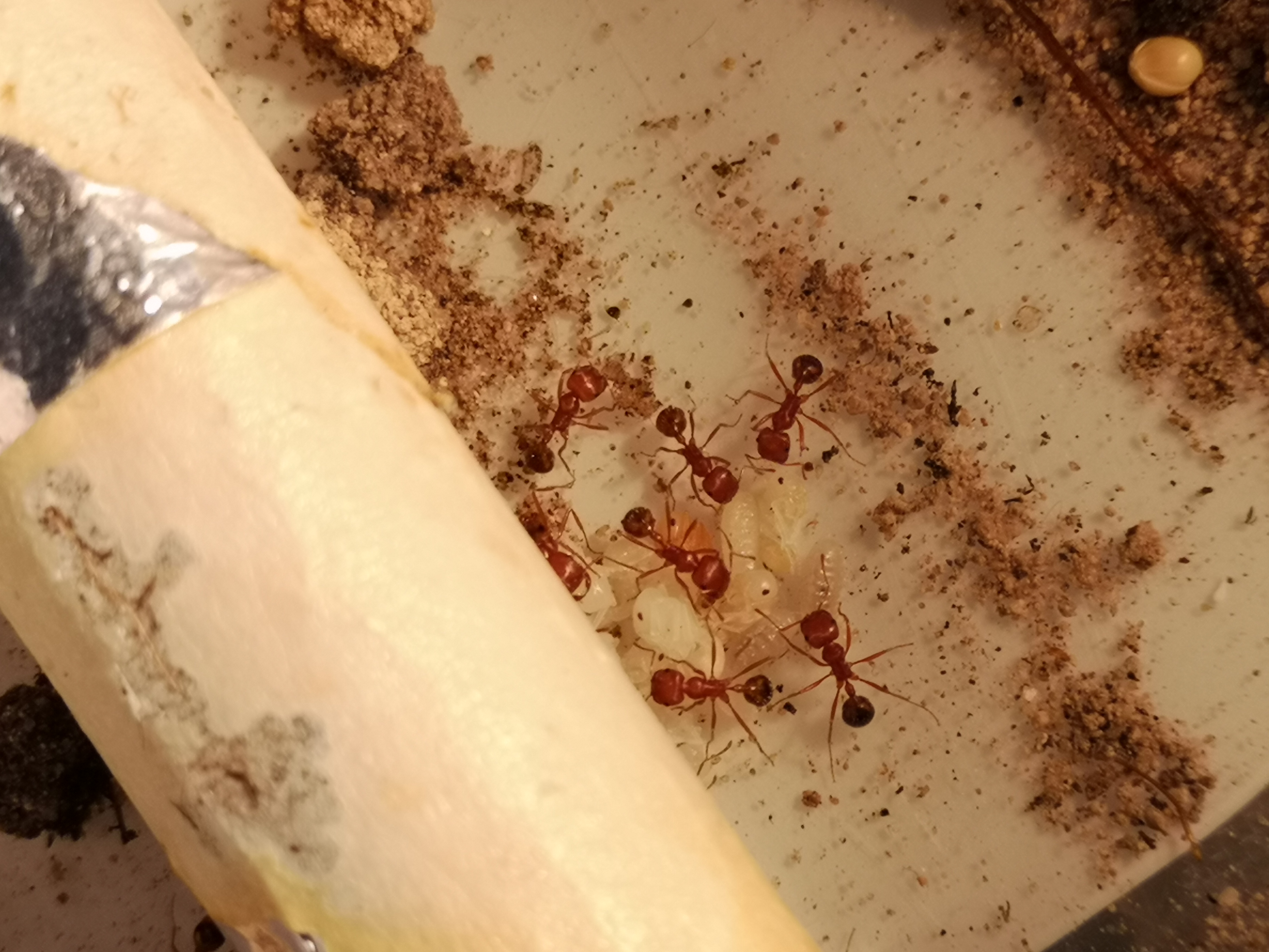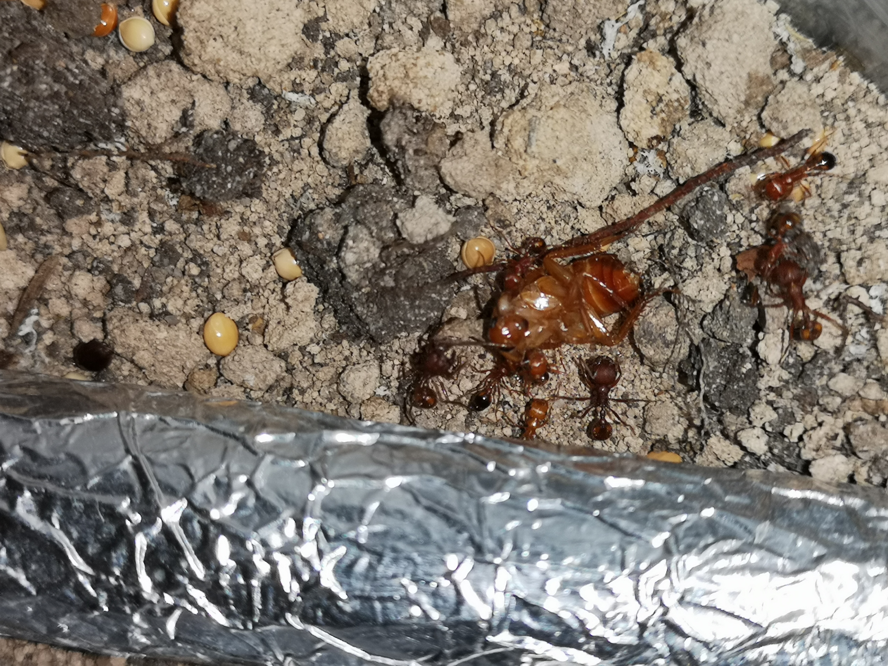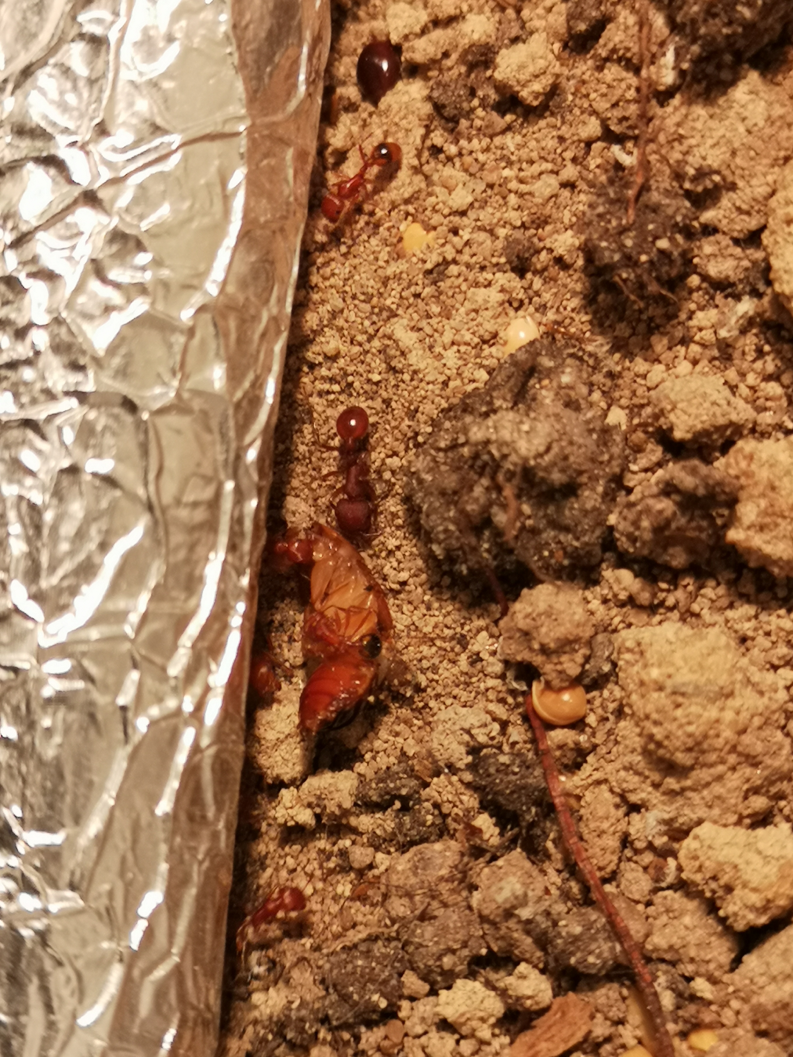 Königin komplett freien Gang. Die Pogonomyrmex occidentalis Nacktpuppen wurden diesesmal komplett ignoriert und nach 3 Tagen bemerkte ich wie eine