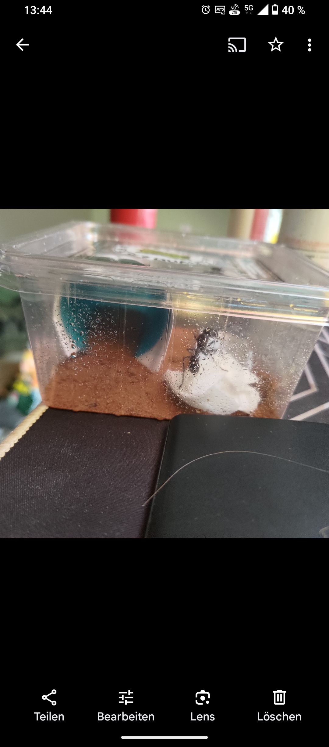 So heute war es soweit. Die Königin kam an. Leider hat Express mit UPS etwas länger gedauert als gedacht, aber es sollte erstmal kein Problem darstellen. Das einzige Problem das ich habe, ist das Myants wohl seinem Job garnicht nachkam. Letzte Woche Donnerstag bestellt, Dienstag würde es erst an DHL übergeben. Freitag wird dann hoffentlich die Einrichtung ankommen. Leider hatte ich bis jetzt nur eine Möglichkeit, die Königin und ihre getrennt gelieferte Larve in einer Ehemaligen Futtertierbox unterzubringen. Sehr wenig Platz, aber mehr Platz als in ihrern Transportbehältnissen. BILDER folgen wenn sie sich beruhigt hat.
