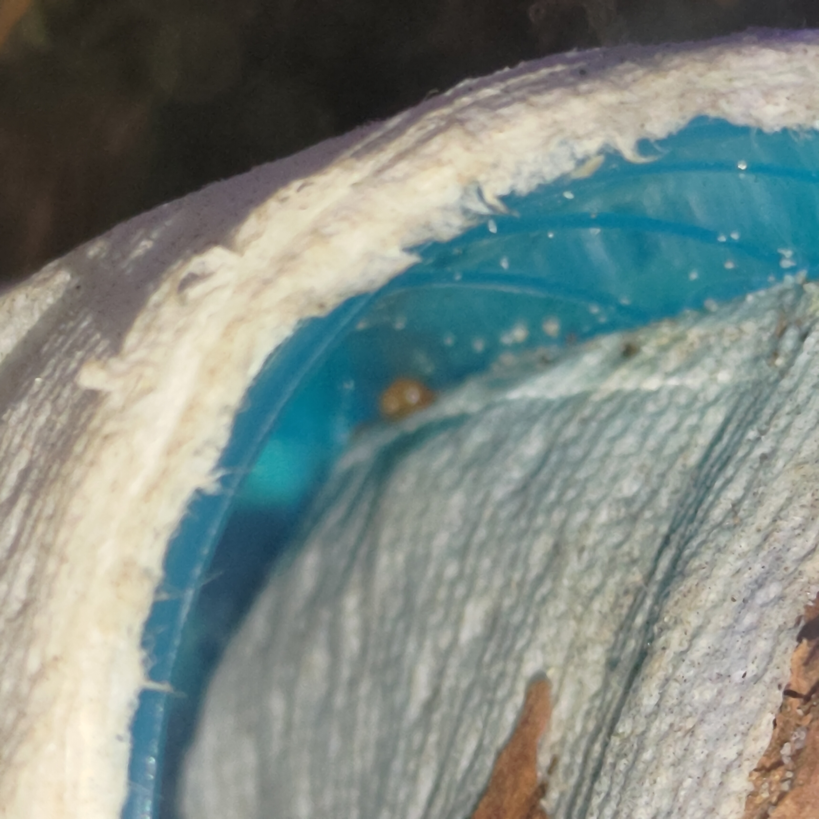 Nach einer Woche Übungsplatz bin ich dann mal wieder Zuhause und kann euch sagen es gibt gute Neuigkeiten. Die Kokosnuss wurde nicht angenommen, sondern lieber der halbe Becher mit Zewa. Dennoch 2 eier die sie gelegt hat. Bleibt abzuwarten ob sie durchkommen, aber erstmal ein Erfolg. Sie erkundet häufig ihr Becken, gräbt sich zwischen dem Moos durch. Fleißig ist sie, das kann ich sagen. Die Heimchen wurden bisher nicht angerührt. Ich gebe regelmäßig honigwasser und besprühe das Becken, was sie mir jedesmal mit ihrem Drohgezirpe dankt. Den Finger möchte ich da wirklich nicht reinhalten. Die Temperatur liegt bei konstanten 25 Grad und die Luftfeuchtigkeit durchgehen bei über 90%. Bild folgt. Tut mir leid für die schlechte qualität.