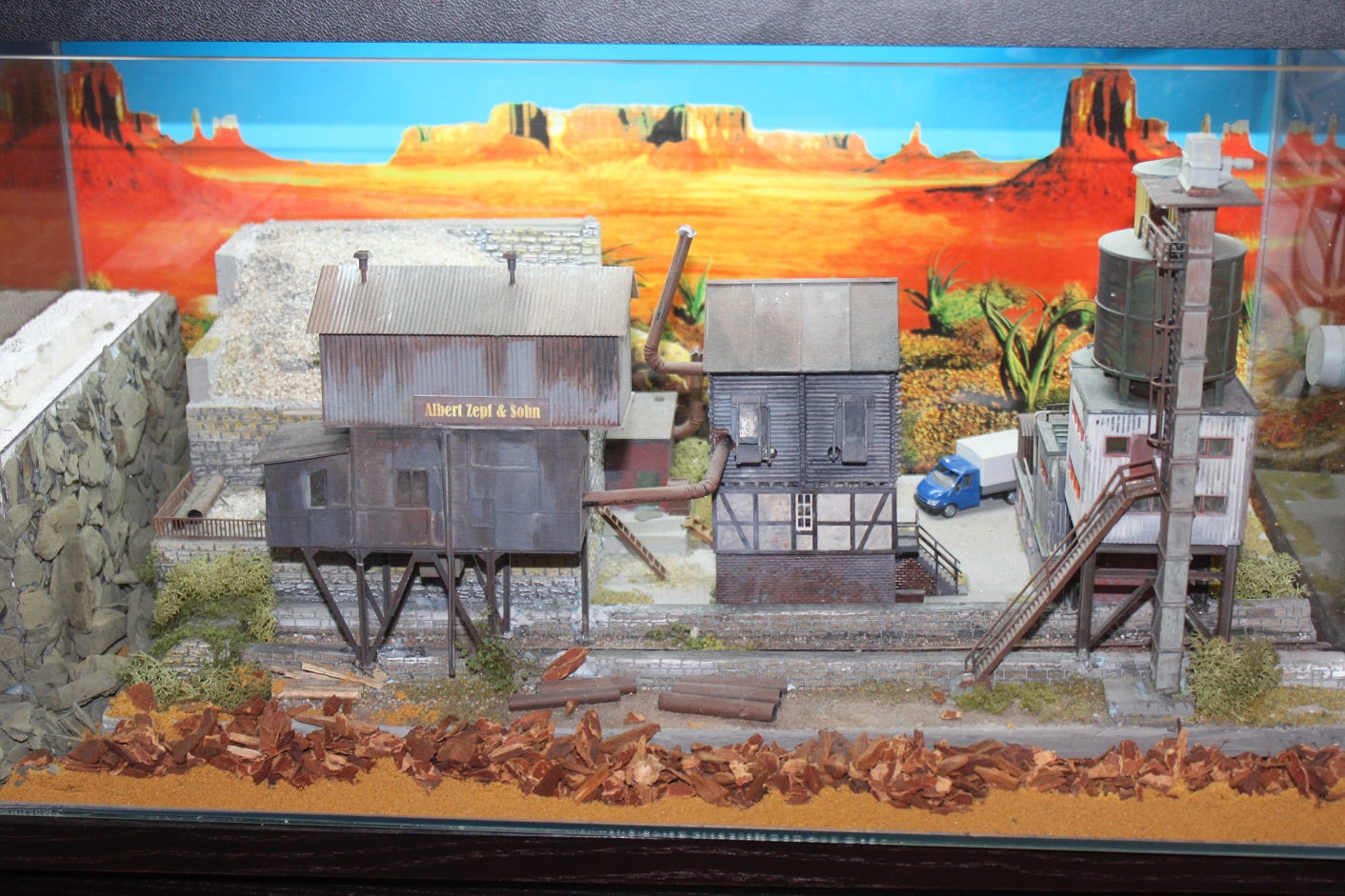 ein weiteres Formicarium von mir ist der Güterbahnhof. Hier habe ich mich mehr auf Modellbau konzentriert. Das Ytongnest ist mittels kleiner Steinplättchen verschönt worden, damit es mehr zum Thema passt. Ansonsten können hier die Tiere mehrere Zweignester in den Gebäuden nutzen. Mittels Strohhalmröhrchen sind auch ein paar Gebäude verbunden.
