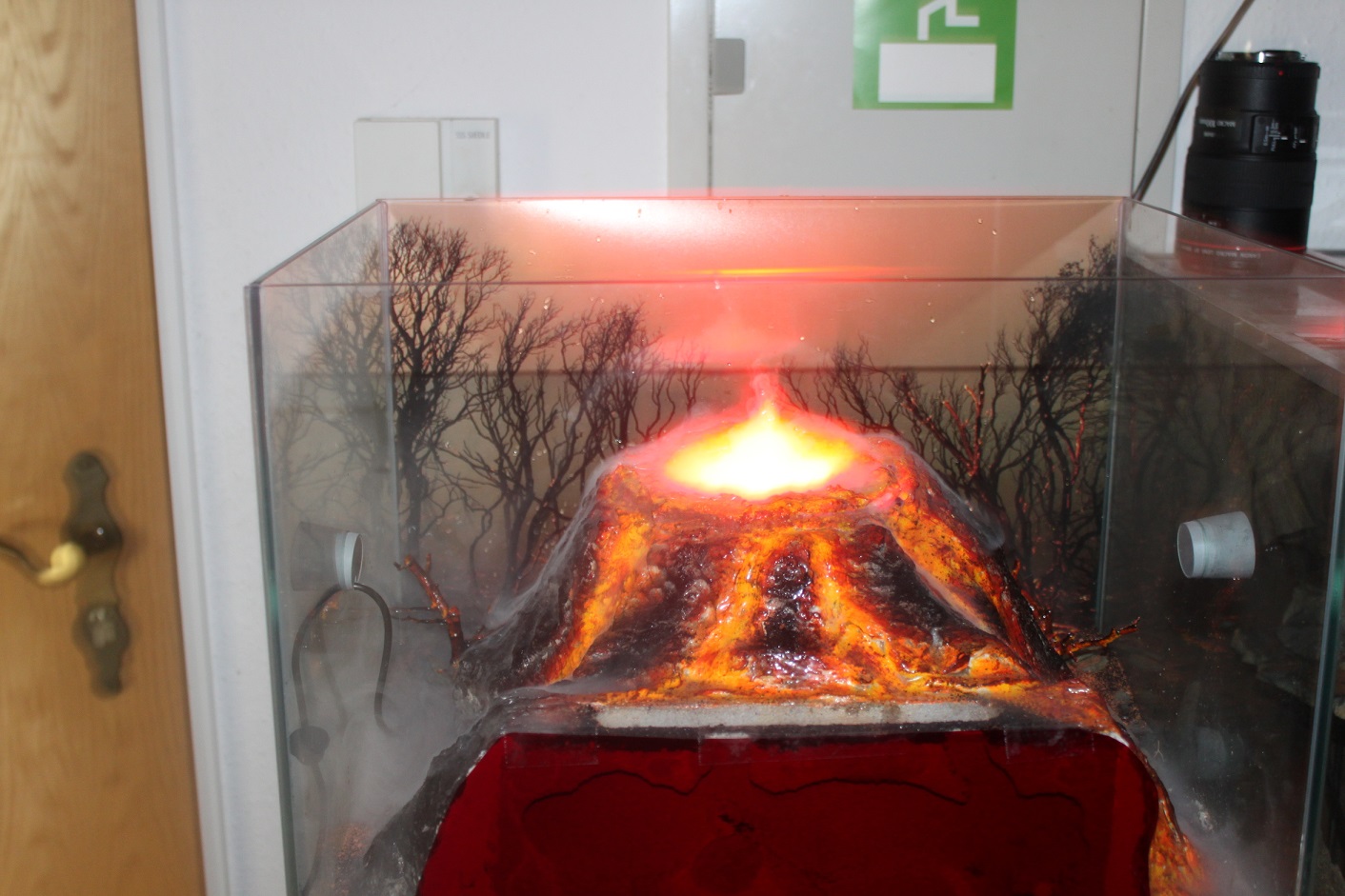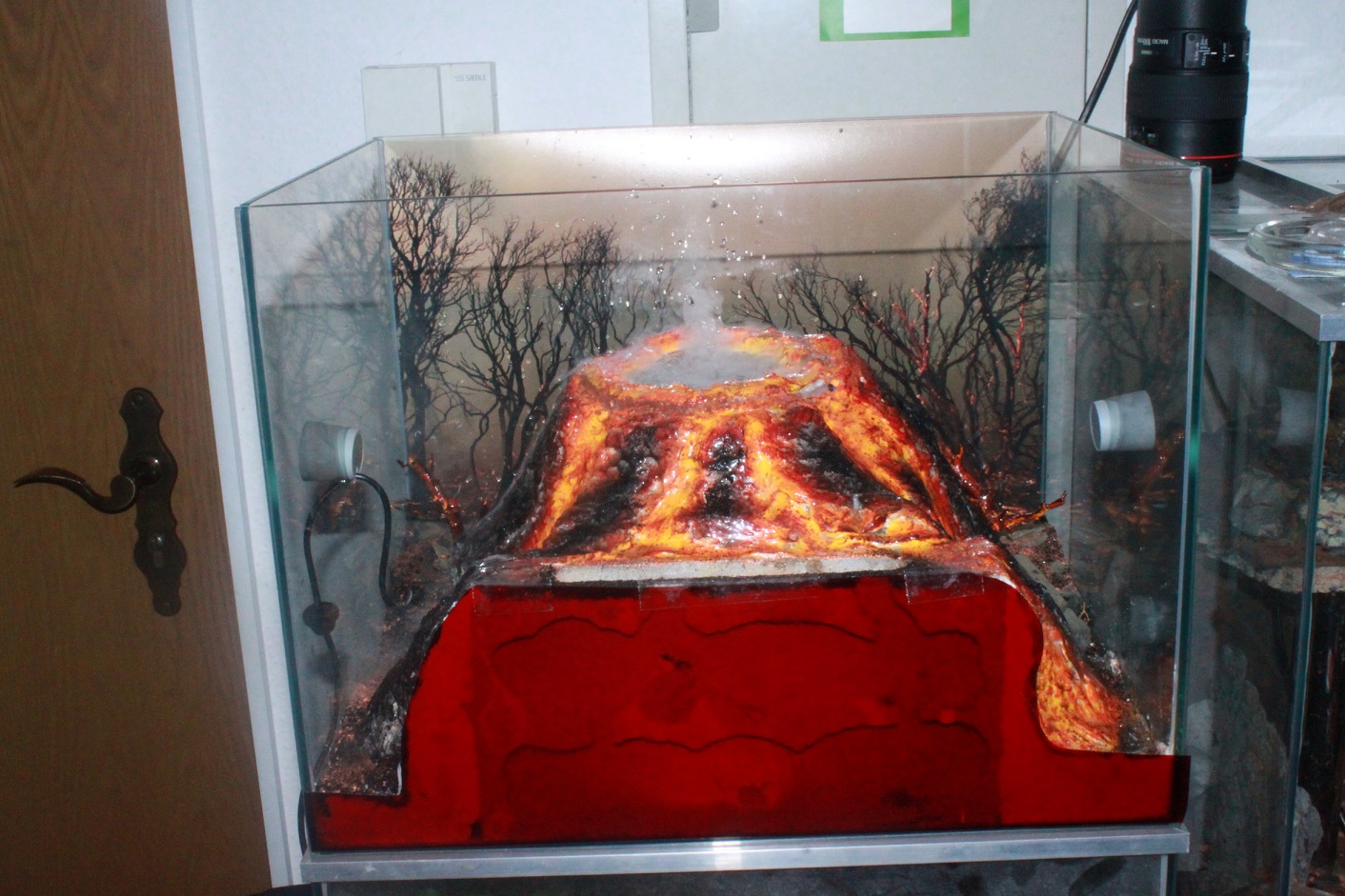 Der Vulkan ist handmodelliert. Das Thema ist eigentlich erst in meinem Kopf gereift, nachdem ich ein Poster gefunden habe (Rückwandbild) und mir dachte, daraus kann man doch was machen. Ich habe zuerst kleine Äste gebastelt und angemalt um zu gucken, wie nah komm ich an die Bäumchen im Bild ran. Das hat ganz gut funktioniert, also dachte ich mir irgendwas muss ich basteln, damit man auch weiß wieso es brennt, so entstand dann der Vulkan. Mittels Nebler und Beleuchtung habe ich dann meine eigene Befeuchtung im Terrarium geschaffen. Der Vulkan bricht täglich um 18 Uhr einmal aus. Ich habe mittlerweile auch eine Stereobox angesteuert, die gleichzeitig einen entsprechenden Sound des Ausbruchs startet.