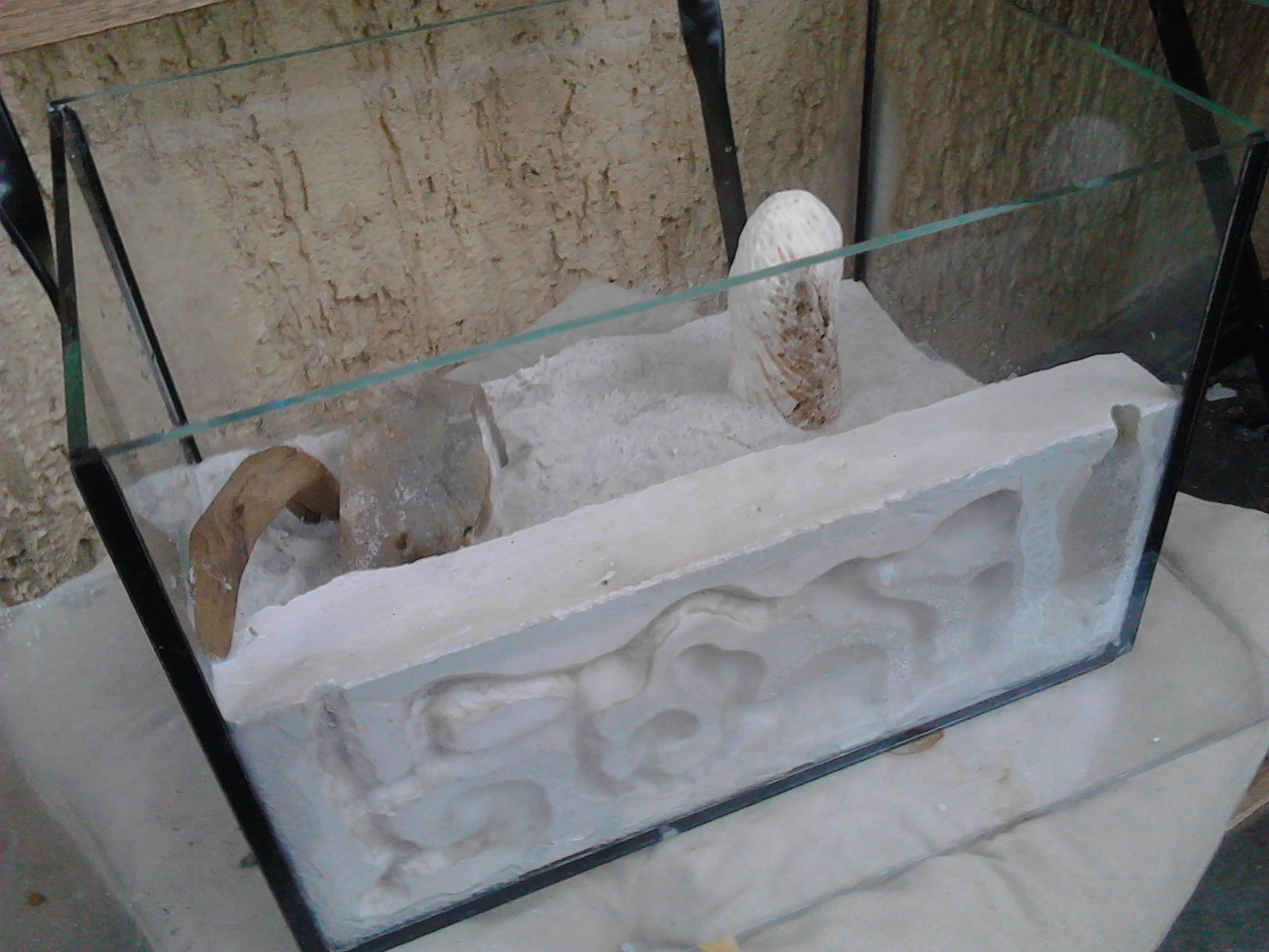 Genau aus diesem Grund hole ich im mir heute einen Deckel aus HobbyGlas fĂŒr das Becken. FĂŒr die Kabel mache ich eine Aussparrung und stopfe Watte in den Zwischenraum.
