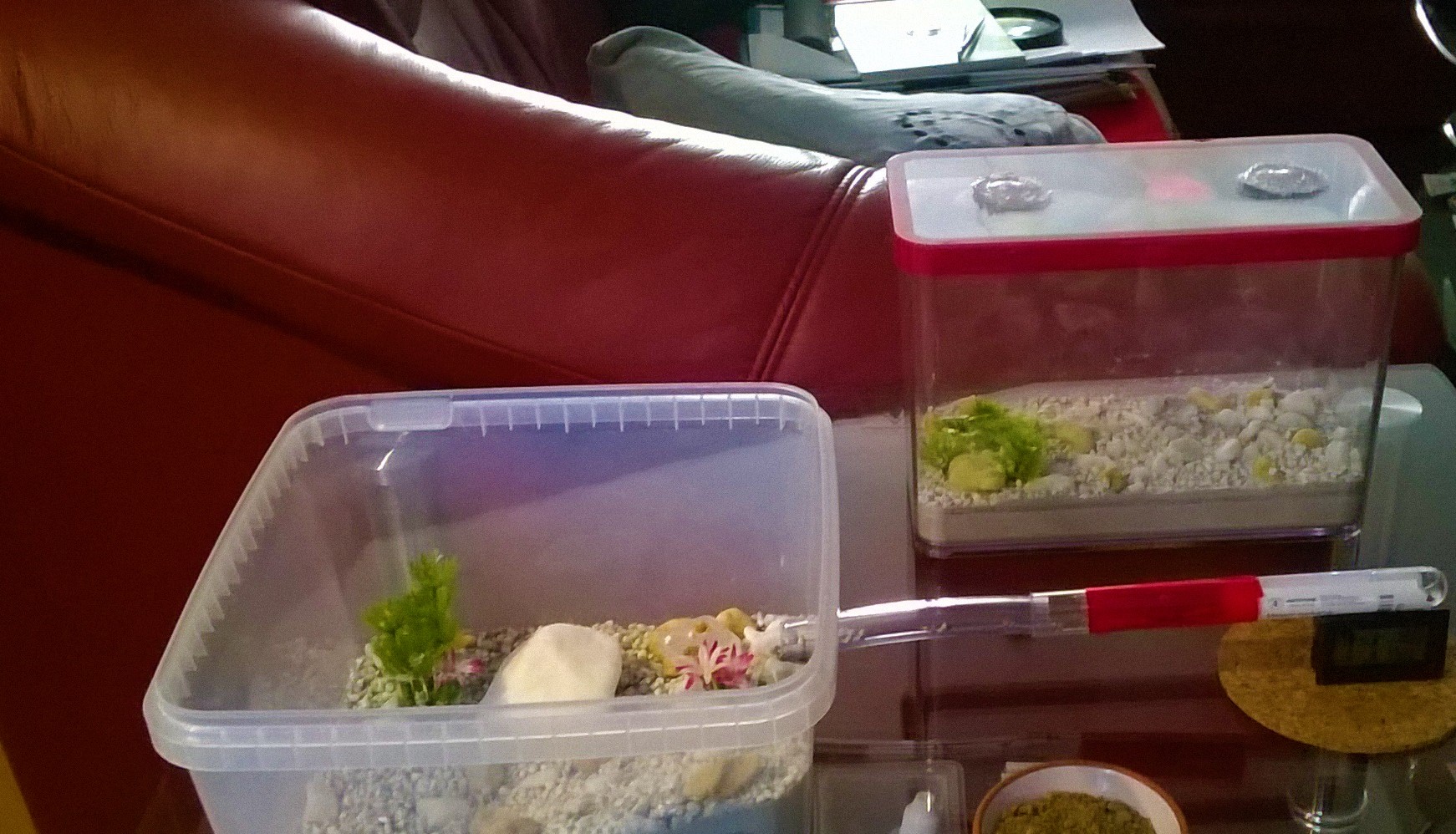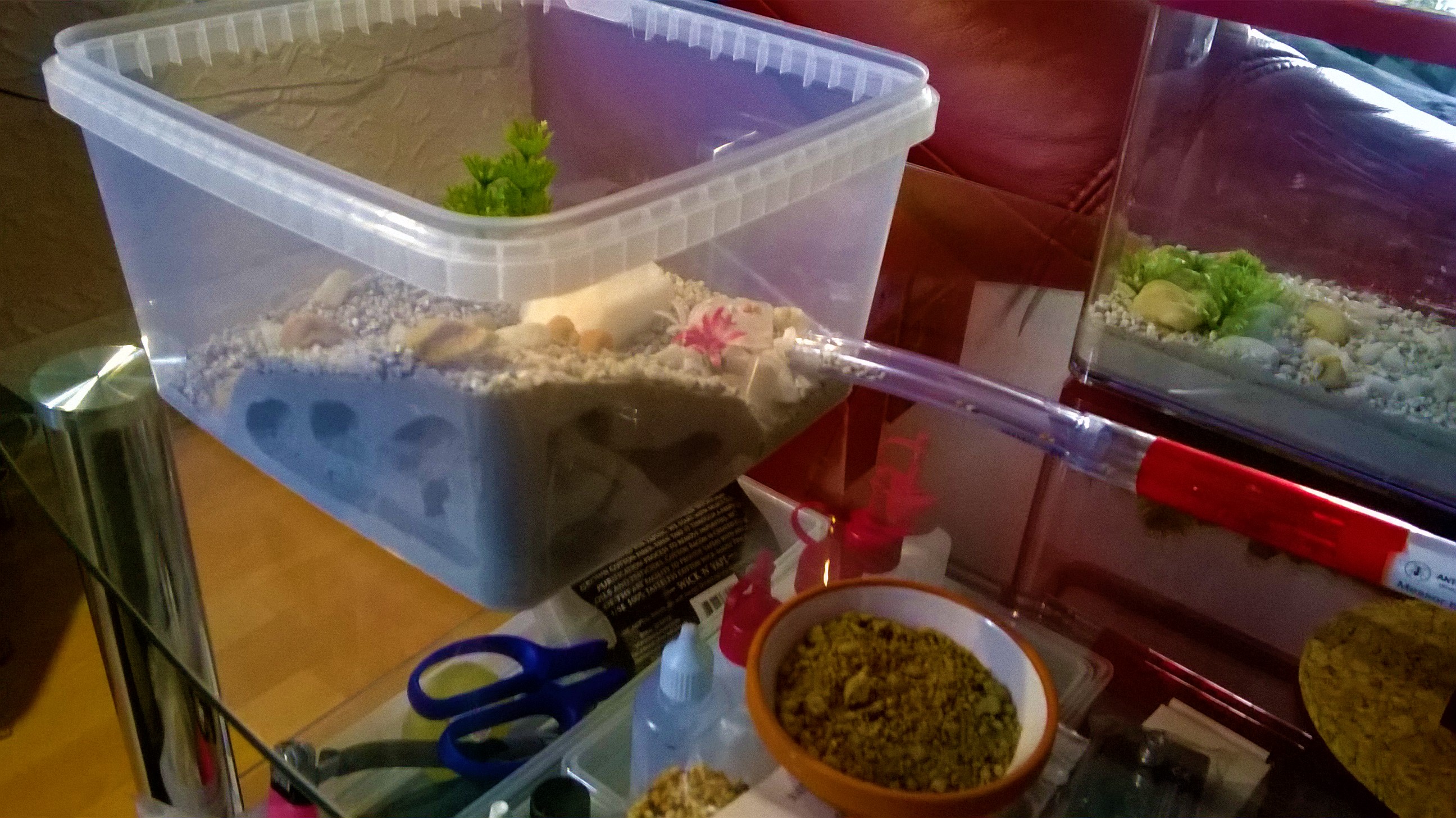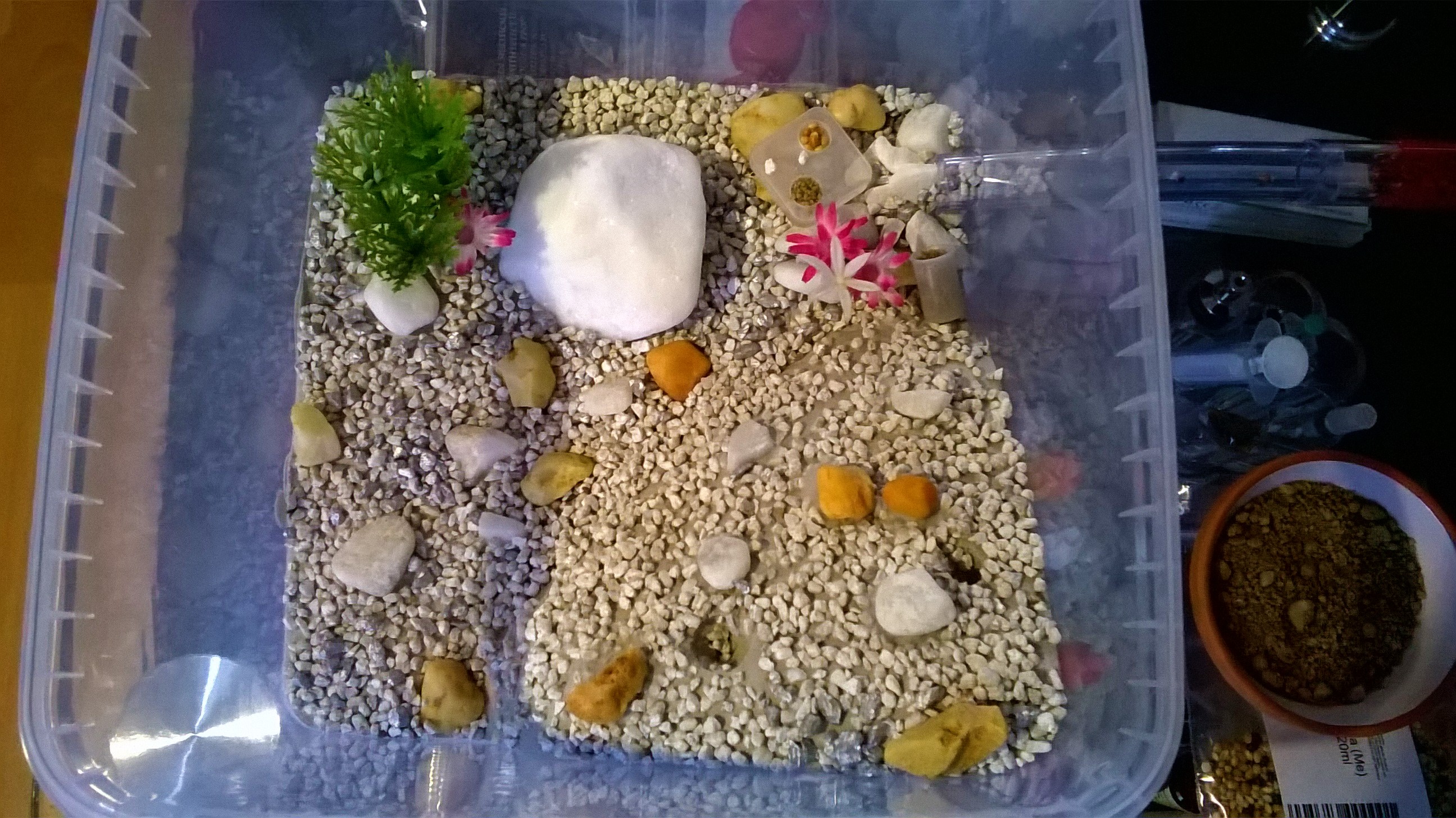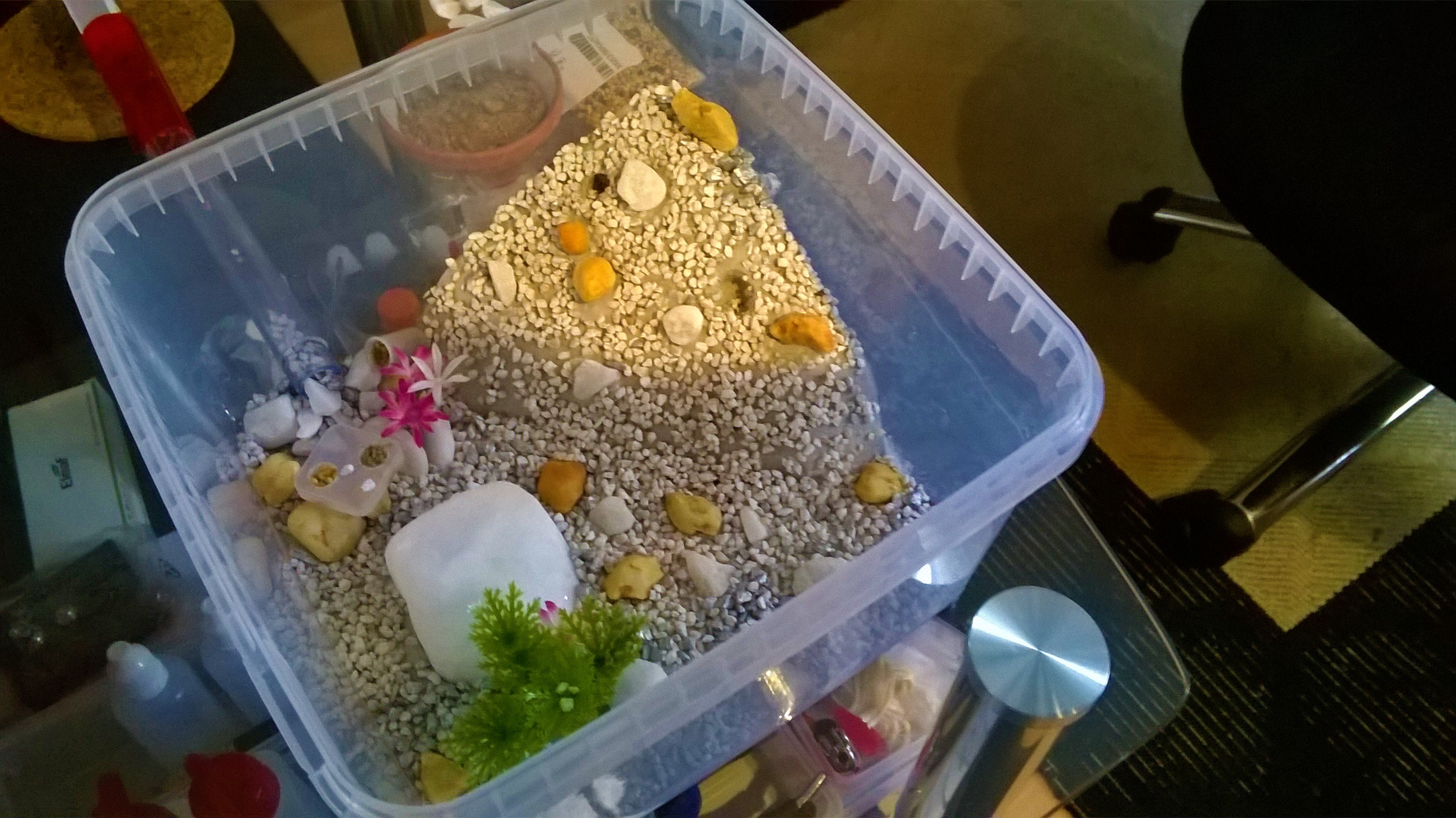 Die Kieselchen sind grösstenteils in den Gips eingestreut und unbeweglich. Dann noch etwas weissen Kiess drübergestreut als der Gipsboden und der Eckhügel schon hart waren damit sie etwas zum rumtragen haben. Und siehe da..nach einer Nacht war das Röhrchen schon halb voll mit den Dingern *g