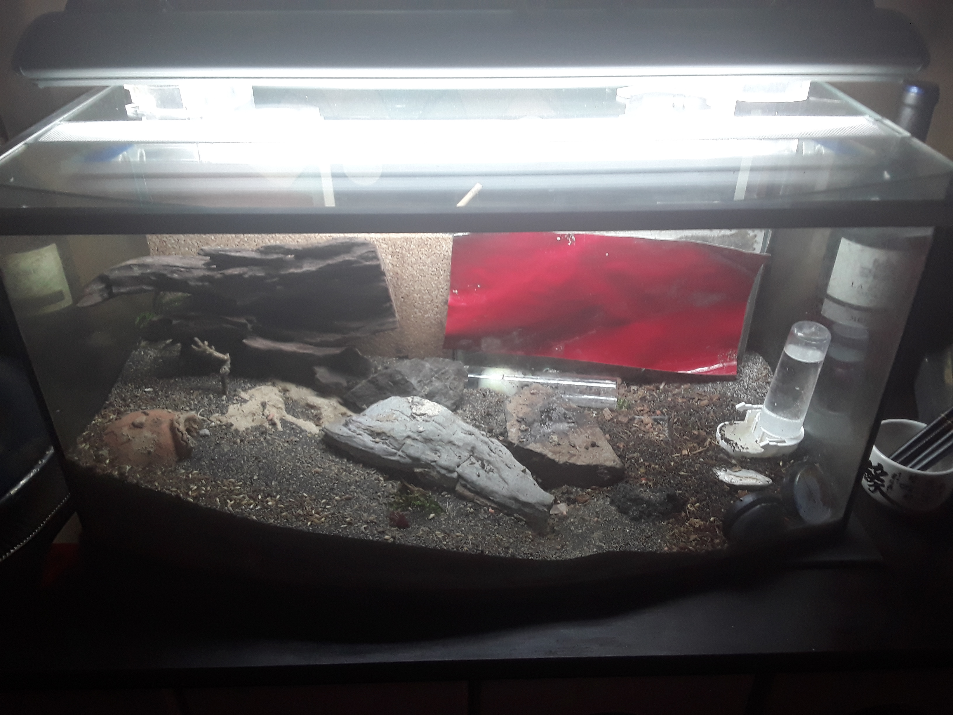 Den Schlauch zum Rg hab ich mittlerweile auf die hälfte gekürzt und das Glas selber mit Watte abgestützt und einem schwarzem Brillenputztuchtuch abgedeckt :huepfer: Nach der Diapause werd ich das Glas irgendwie belichten damit das Volk in den Gips umzieht. ^^ Hoffendlich *G