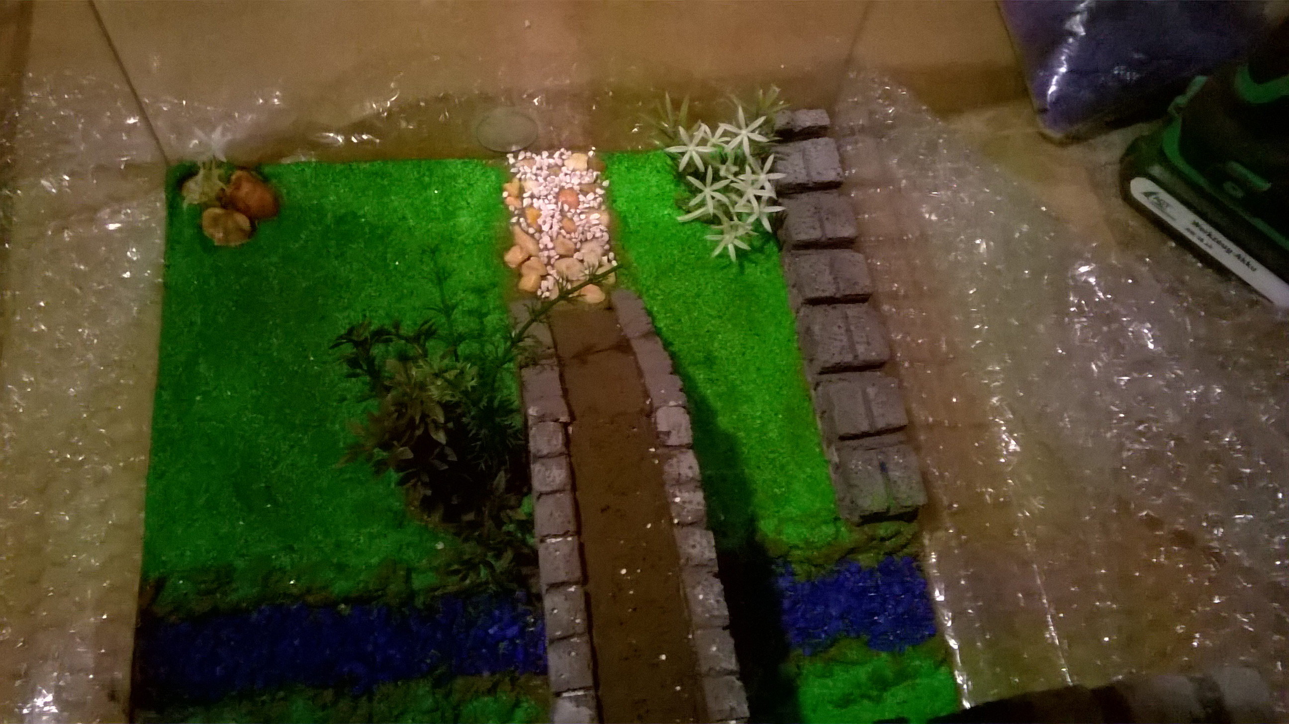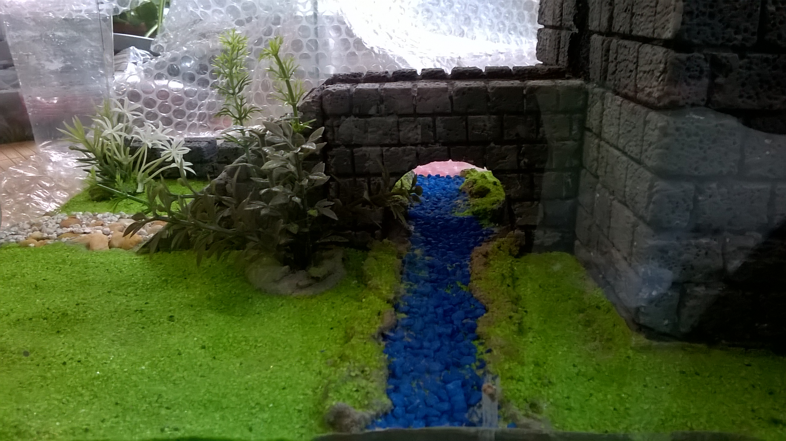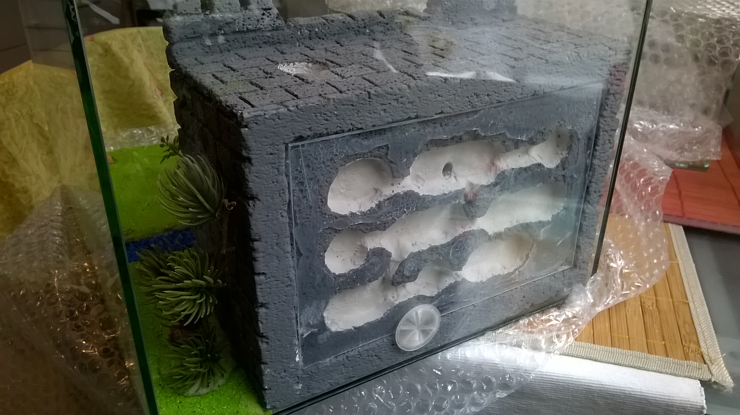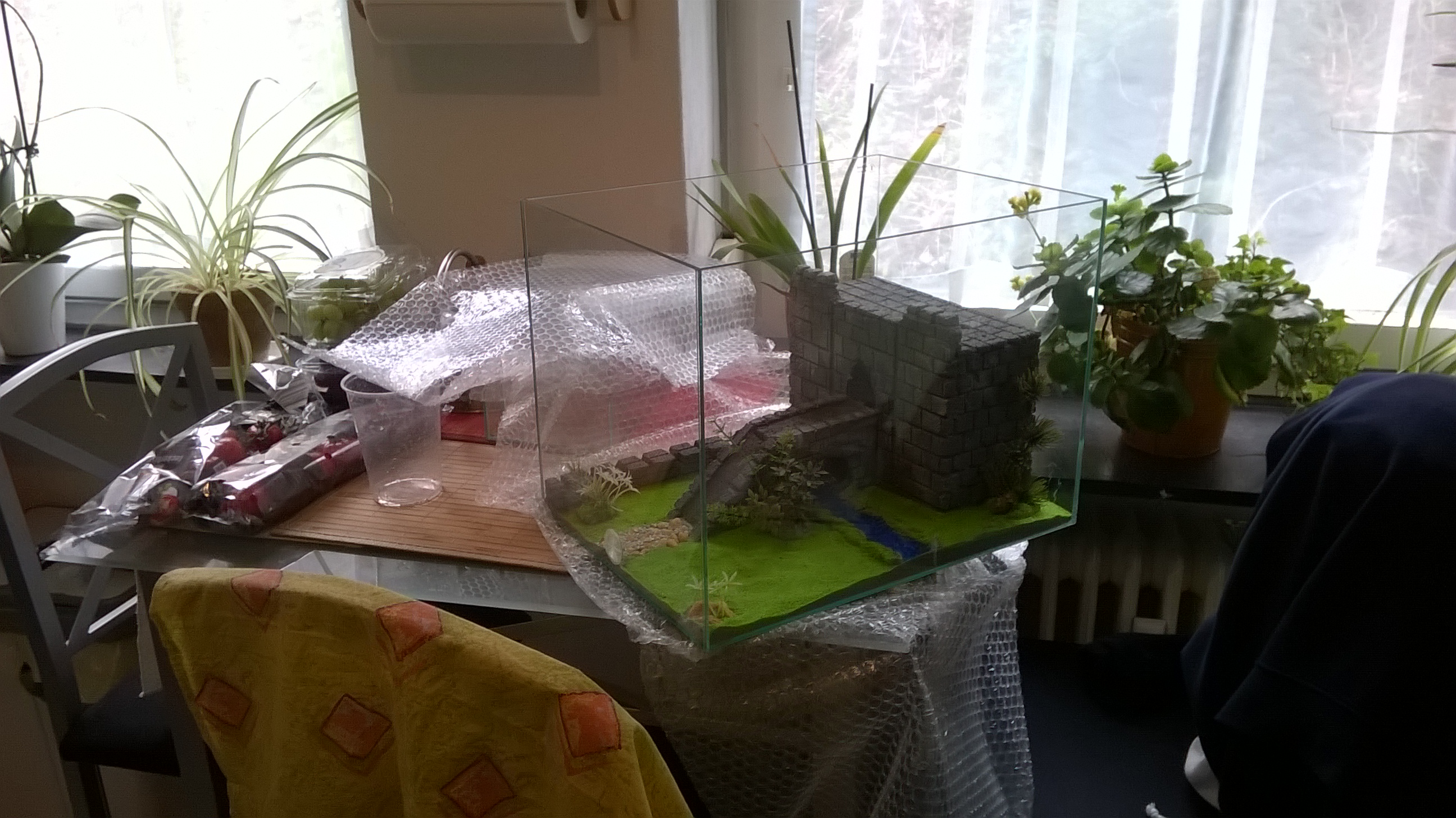 Material von dem Ding: Gasbeton, Gips (innen das Nest um die Poren zu verschliessen), Mörtel (Um die Kiesel und Steinchen zu befestigen), farbige Kiesel und Steinchen um Gras und Wasser ein wenig zu simulieren *g, Kunstpflanzen, Aquariensilikon, Abtönfarbe...naja das übliche halt.