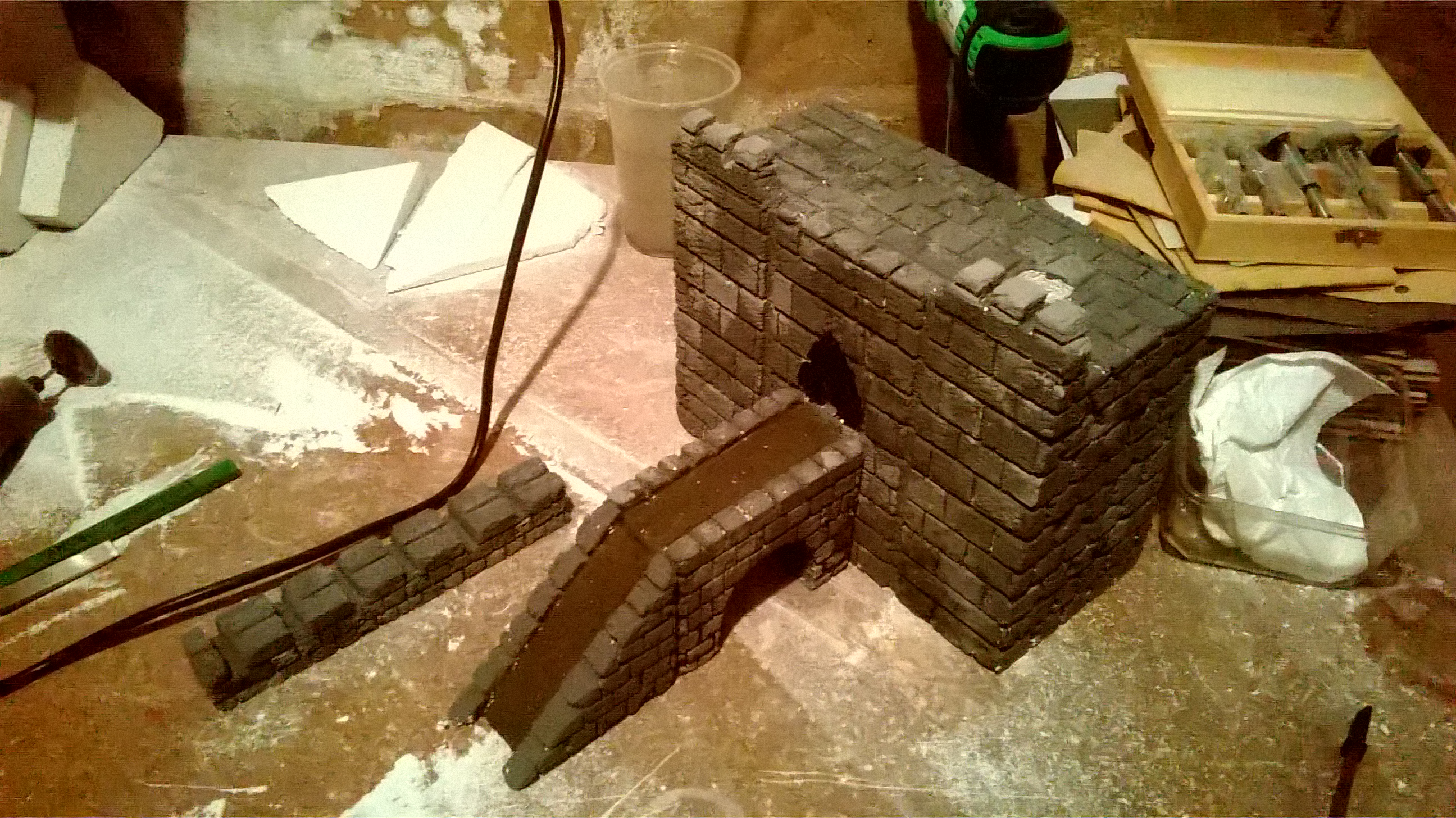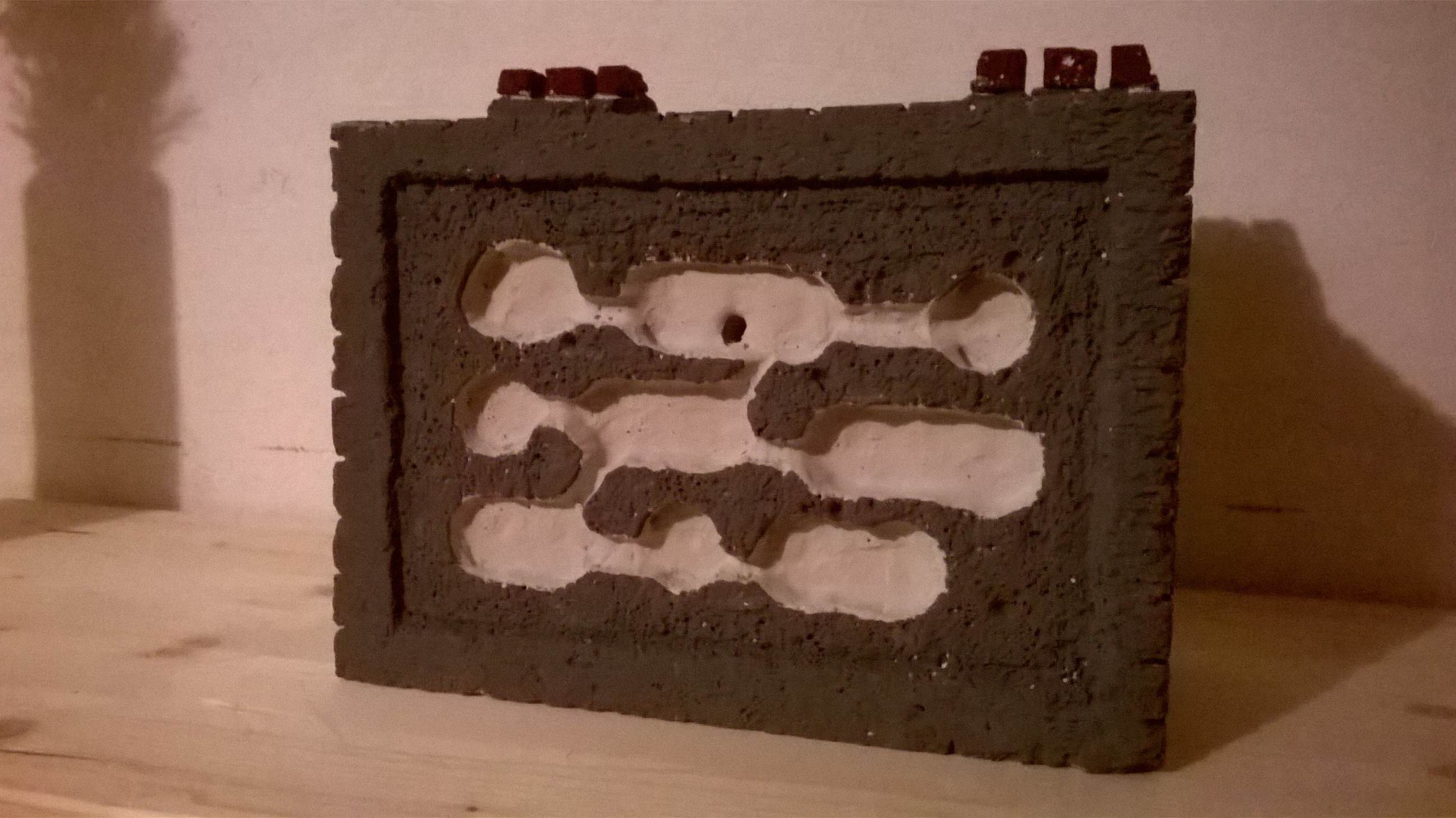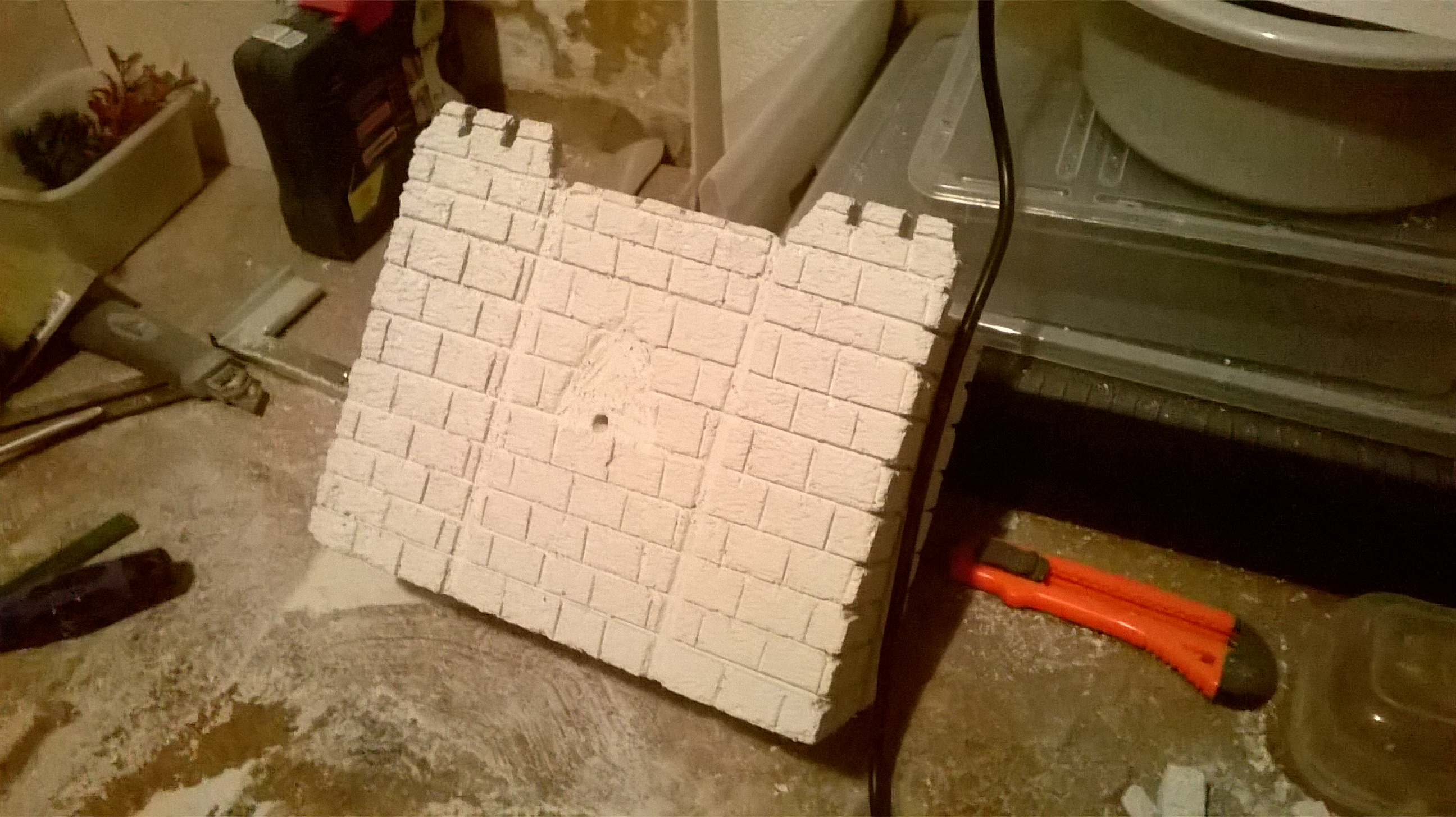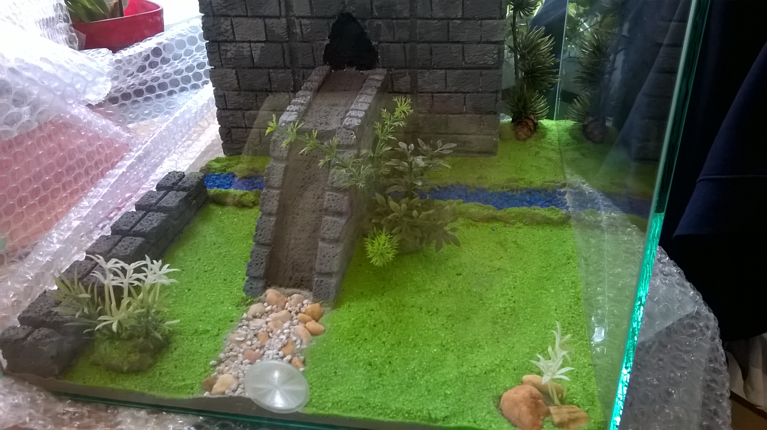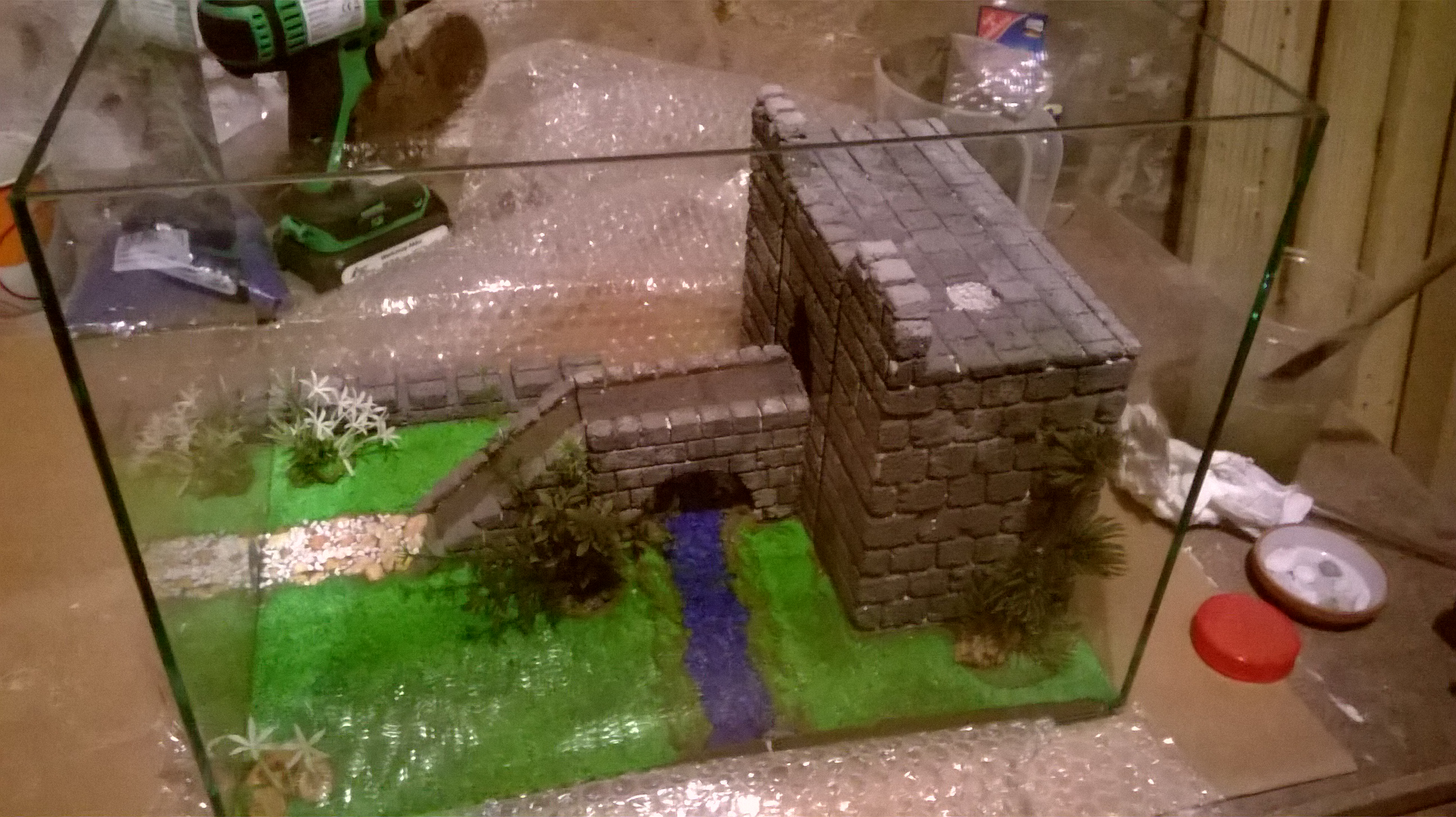 Material von dem Ding: Gasbeton, Gips (innen das Nest um die Poren zu verschliessen), Mörtel (Um die Kiesel und Steinchen zu befestigen), farbige Kiesel und Steinchen um Gras und Wasser ein wenig zu simulieren *g, Kunstpflanzen, Aquariensilikon, Abtönfarbe...naja das übliche halt.