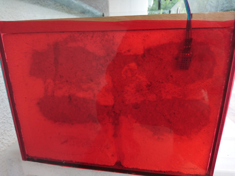 Die Rückseite des Aquariums (mit dem Nest) ist mit roter Folie beklebt.