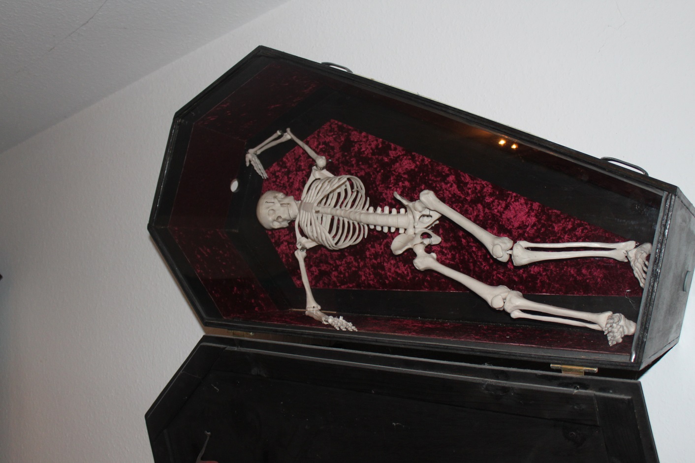 meine Schreinerfähigkeiten wollte ich auch mal unter Beweisstellen und habe ein Holzterrarium (Sarg) nachgebaut. Eine Große Plexiglasplatte ermöglicht die Sicht ins Innere. Das Terrarium ist wie auf dem Bild sichtbar so konzipiert, dass es an die Wand gehängt wird. Der Deckel des Sargs hängt somit auch nach unten. An der Seite kann man ins Terrarium hinein um Futterschälchen etc. zu wechseln. Den Tieren steht ein kleines Gipsnest zur Verfügung im Skelettschädel. Der Zugang ins Nest ist das Auge. Mittels Schlauchanschluss am Hinterteil des Kopfes kann dann ein externes Nest angeschlossen werden. Der Zugang zum Nest bleibt somit das Auge.