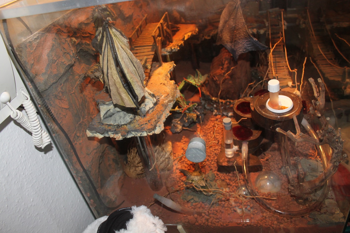 Besonderes an dem Terrarium ist der funktionierende Brunnen in der Mitte über dem ein Drache mit Reiter schwebt, sowie das mittlerweile eingepflegte Nest. Das Nest besteht aus mehreren Holzscheiben, in die jeweils eine Kammer eingefräßt wurde und mit einer Plexiglasplatte überarbeitet wurde. Am höchsten Teil des Nestes führt ein Rohr hinunter in das Ytongnest mit Halbkugelkammern. Der Ytong wird durch eine unterirdische Wasserkammer bewässert, die mit einem Schlauch und eine handelsüblichen Spritze betankt werden kann.