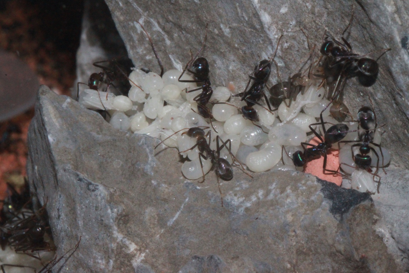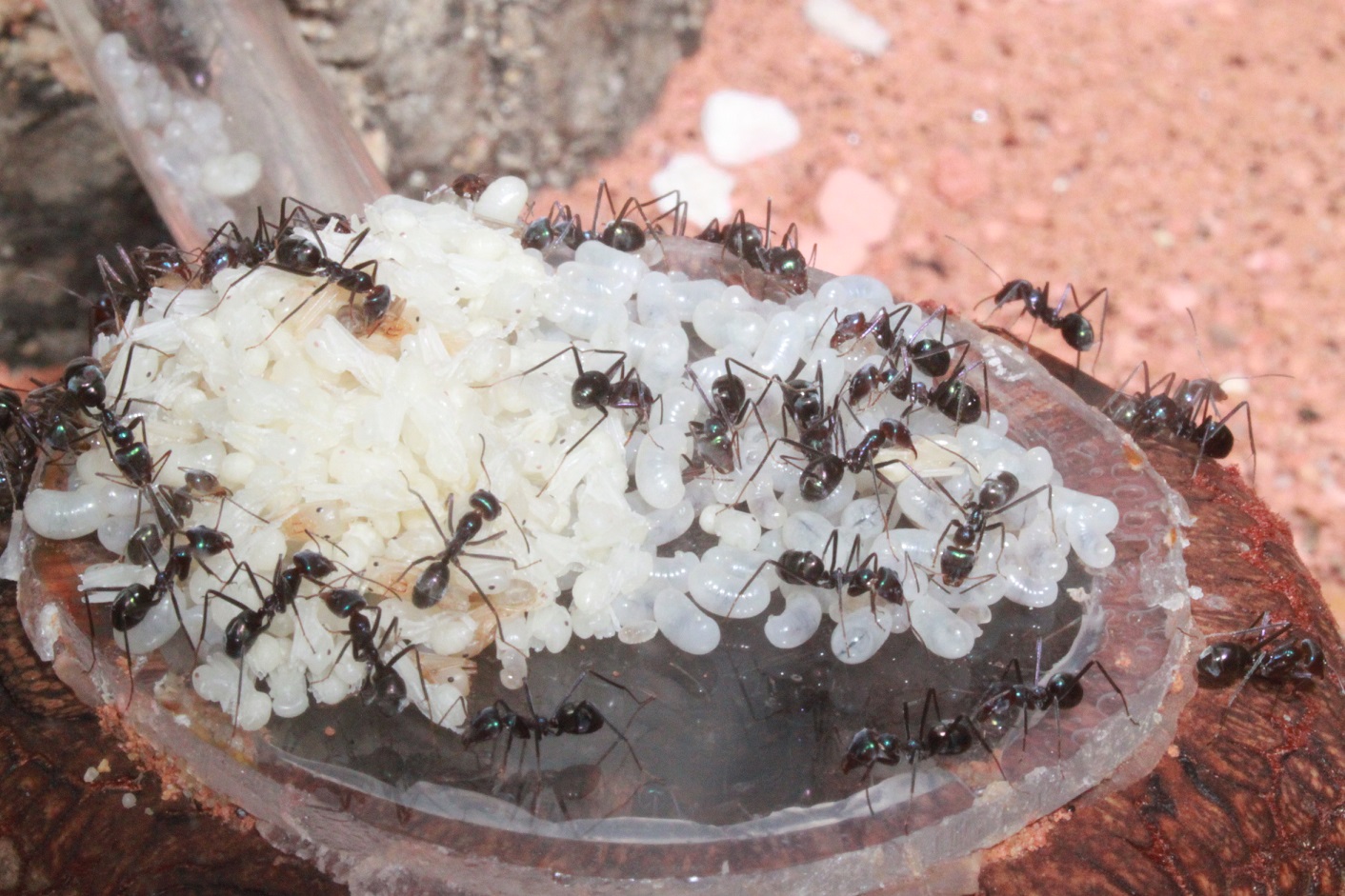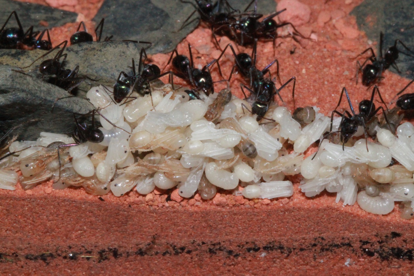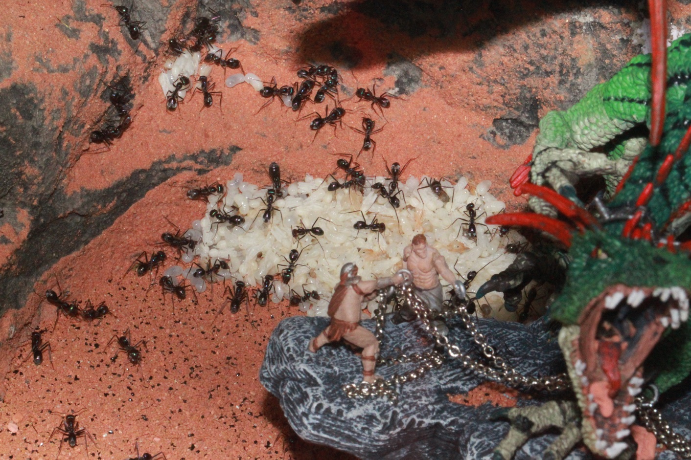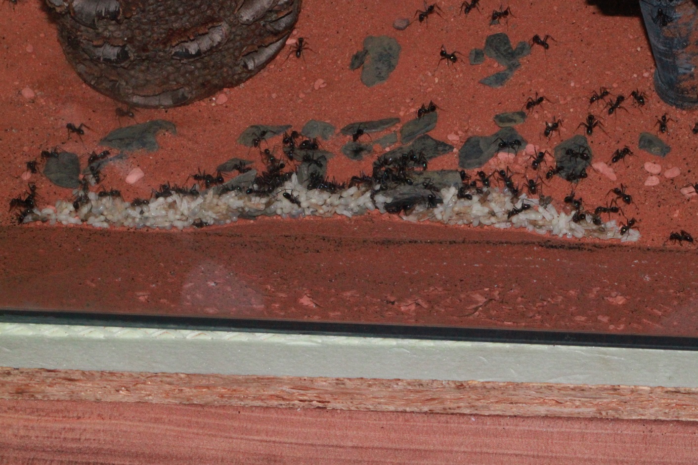 Vor den Camponotus haben hier meine Iridomyrmex gelebt, denen ich immer noch nachtrauere. Es war eine meiner allerliebsten Kolonien. Sehr volkstark so dass ich 2 weitere 80x50x50 Terrarien anschließen musste, da ich trotz Ausbruchschutz sonst den Deckel nicht mehr heben konnte. Leider ist die