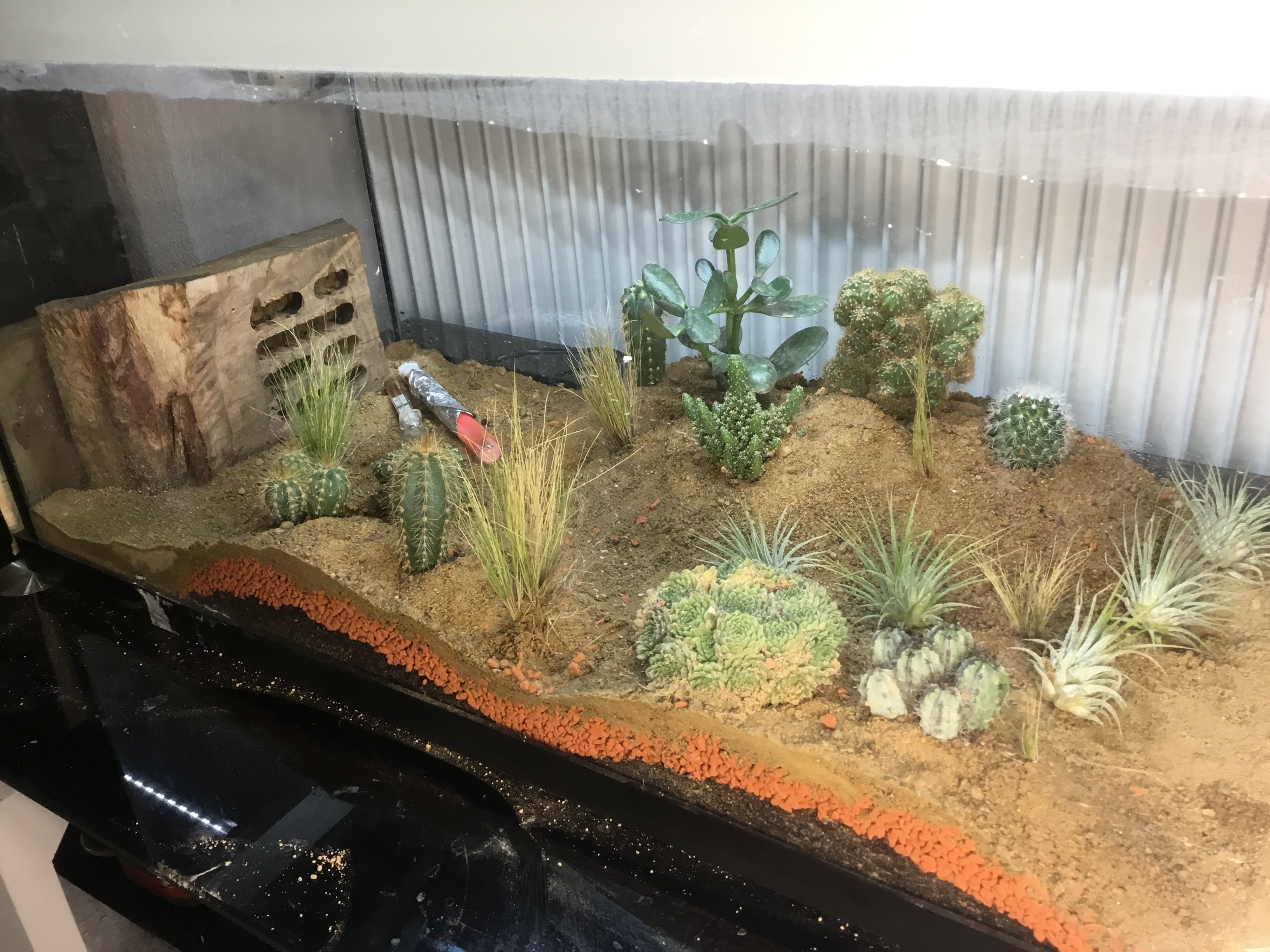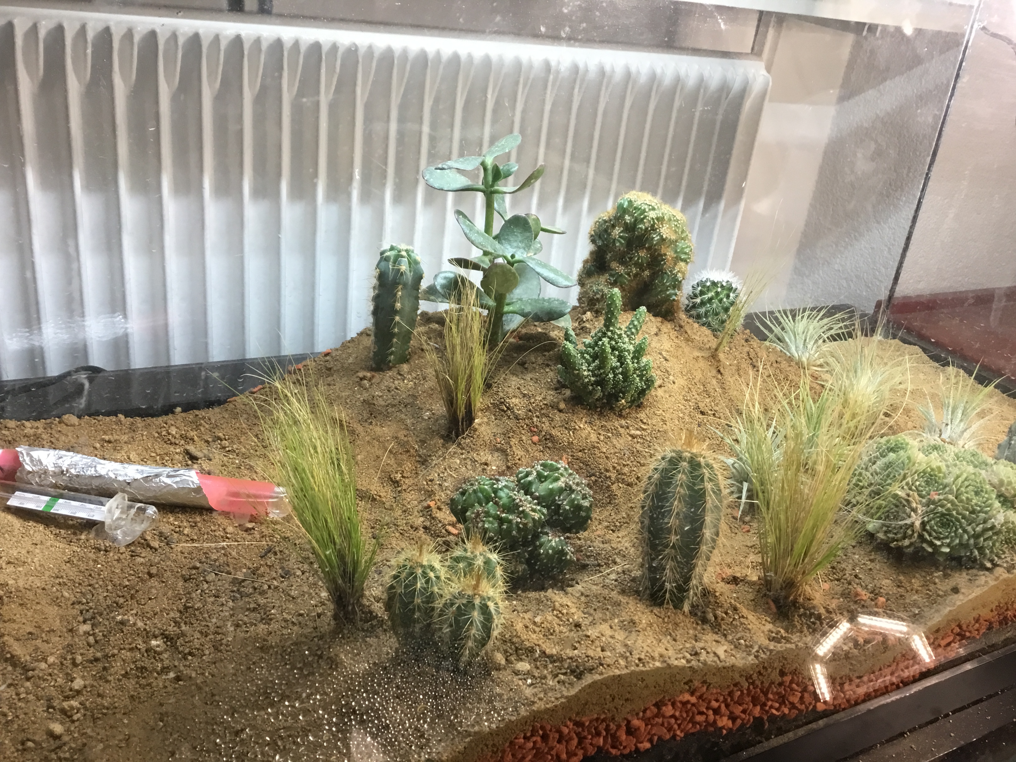 Offenbar mag sie den Sand nicht, springt äusserst geschickt von Stein zu Pflanze usw, eben sprang sie vom obersten Blatt vom Geldbaum auf den Felsenkaktus, ca 8 cm weit! Für ein Tier dass keine 5mm misst ne beachtliche Leistung
