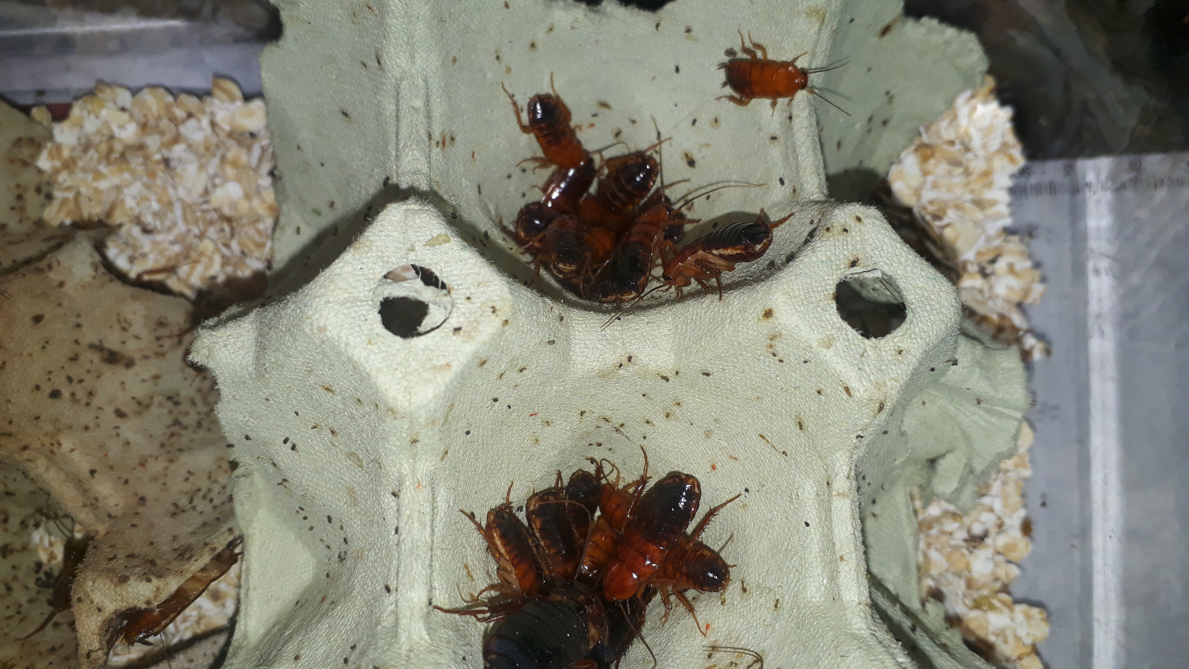 Was gibt es zu beachten bei der Haltung und Zucht, erstmal sollte man wissen, das diese Art von Schaben, keine glatten Wände hochklettern kann, was die Handhabung sehr erleichtert. Ansonsten handhabt ihr sie wie Heimchen, Eierkartons zum verstecken und häuten, Weizenschrot und Haferflocken als dünner Bodengrund sowie Trockenfutter ist ausreichend. Und als Nassfutter könnt ihr einfach die Gemüseabfälle aus der Küche nehmen, aber achtet auch hier darauf, das nichts schimmelt. Die allgemeine Regel sagt, alles was am Abend reingeworfen wurde und am nächsten Morgen noch da ist, ist zuviel.