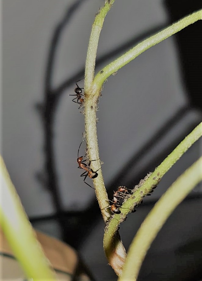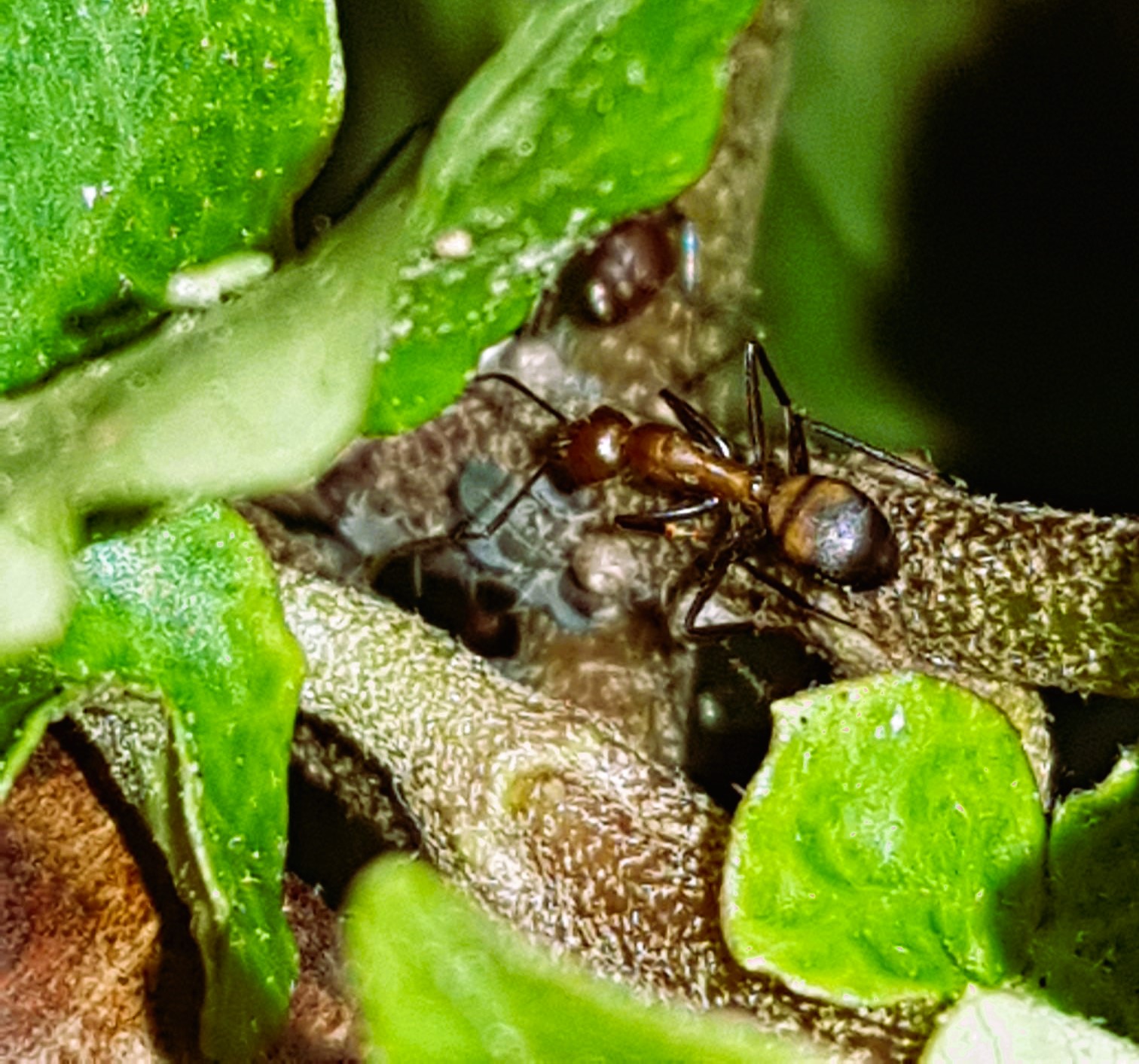 Fangen wir mit dem positiven an: Camponotus nicobarensis macht sich prĂ€chtig, kĂŒmmert sich Tag und Nacht um ihre LĂ€use. Die Zahl der LĂ€use hat sich merklich stabilisiert. Es scheint im Moment das Optimum an BlattlĂ€usen zu sein fĂŒr die Pflanzen, die ich ihnen anbiete. Verluste werden ausgeglichen aber die Trauben werden nicht mehr gröĂer. Im Moment sind es dreizehn Trauben mit jeweils zwischen 30 und 60 Tieren, die Zahl der LĂ€use kann man insgesamt auf etwa 500 schĂ€tzen. Damit sind es mehr Ameisen als LĂ€use, was den Ameisen vom Hongitau her auch nicht ganz ausreicht, denn die LĂ€use sind im Vergleich zu den anderen Arten winzig. Ab und an fĂŒttere ich Honig zu. Die Nicos bekommen pro Stunde etwa drei volle