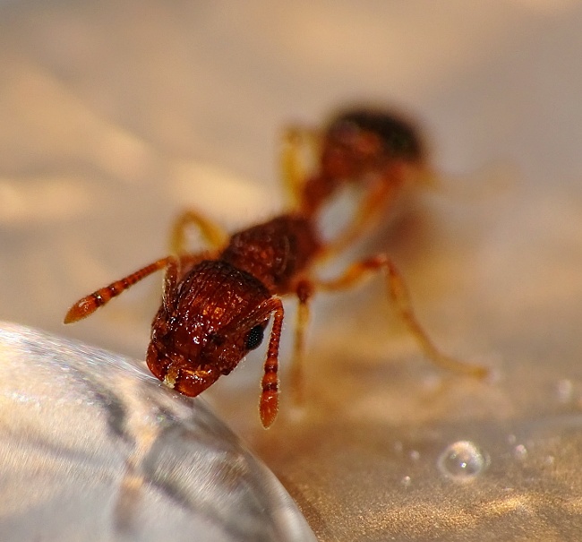 Invertzucker ist eine klare, leicht zähflüssige Flüssigkeit. Ameisen können diese ohne Probleme unverdünnt aufnehmen; wie es z. B. hier eine Tetramorium-Arbeiterin macht: