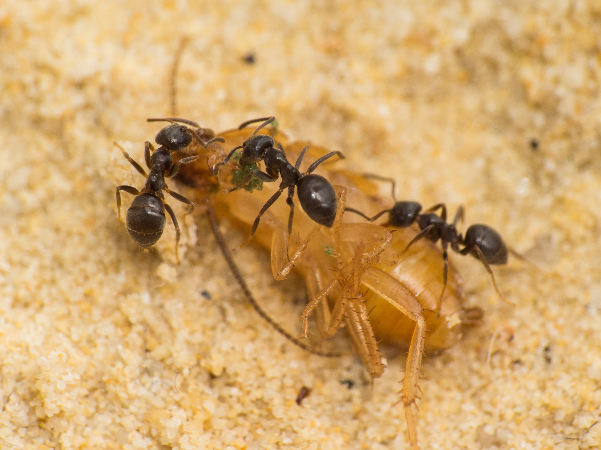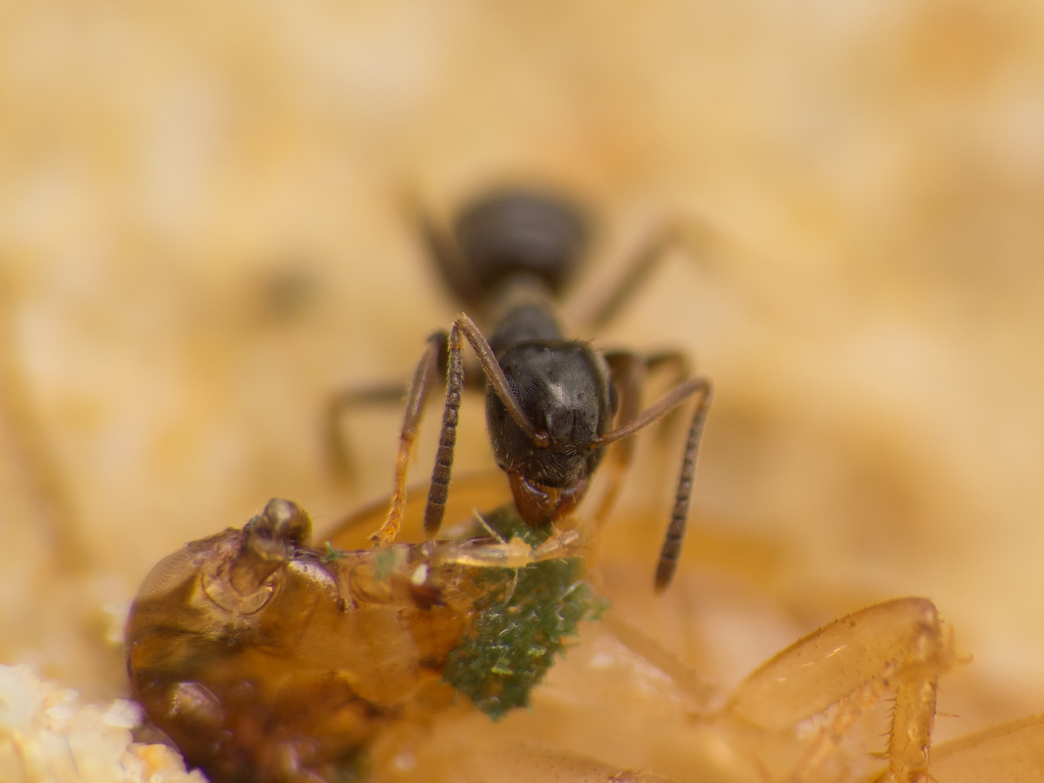Habe gerade wieder eine kleine Nymphe an die Lasius niger Kolonie verfĂĽttert (10 Arbeiterinnen stark) und es waren recht schnell drei Arbeiterinnen zur Stelle.