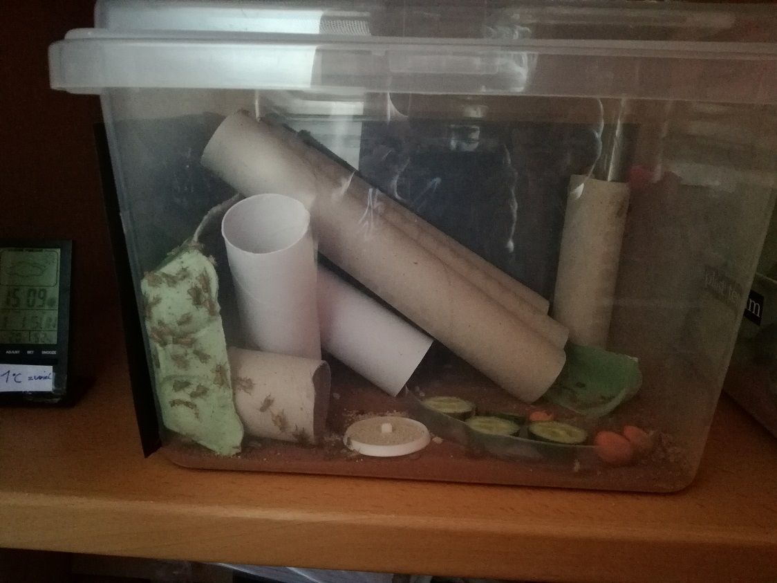 Beim Züchten hättest du die Option die Käfer einfach zu behalten oder mehrfach die Futtertiere auszusuchen und umzusetzen. Die Käfer werden in hohen Behälter immer an den Wänden hochlaufen und können so abgesammelt werden. Was allerdings auch die Gefahr bringt das die Käfer einfach wegfliegen und sich in der Wohnung ihren Platz suchen desweiteren können auch Schaben entkommen, was dann von Interesse ist wenn du einen wärmeren Raum in der Wohnung hast worin die Vermehrung stattfinden kann. Ansonsten ist bei niedrigen Temperaturen auch damit nicht zu rechnen.