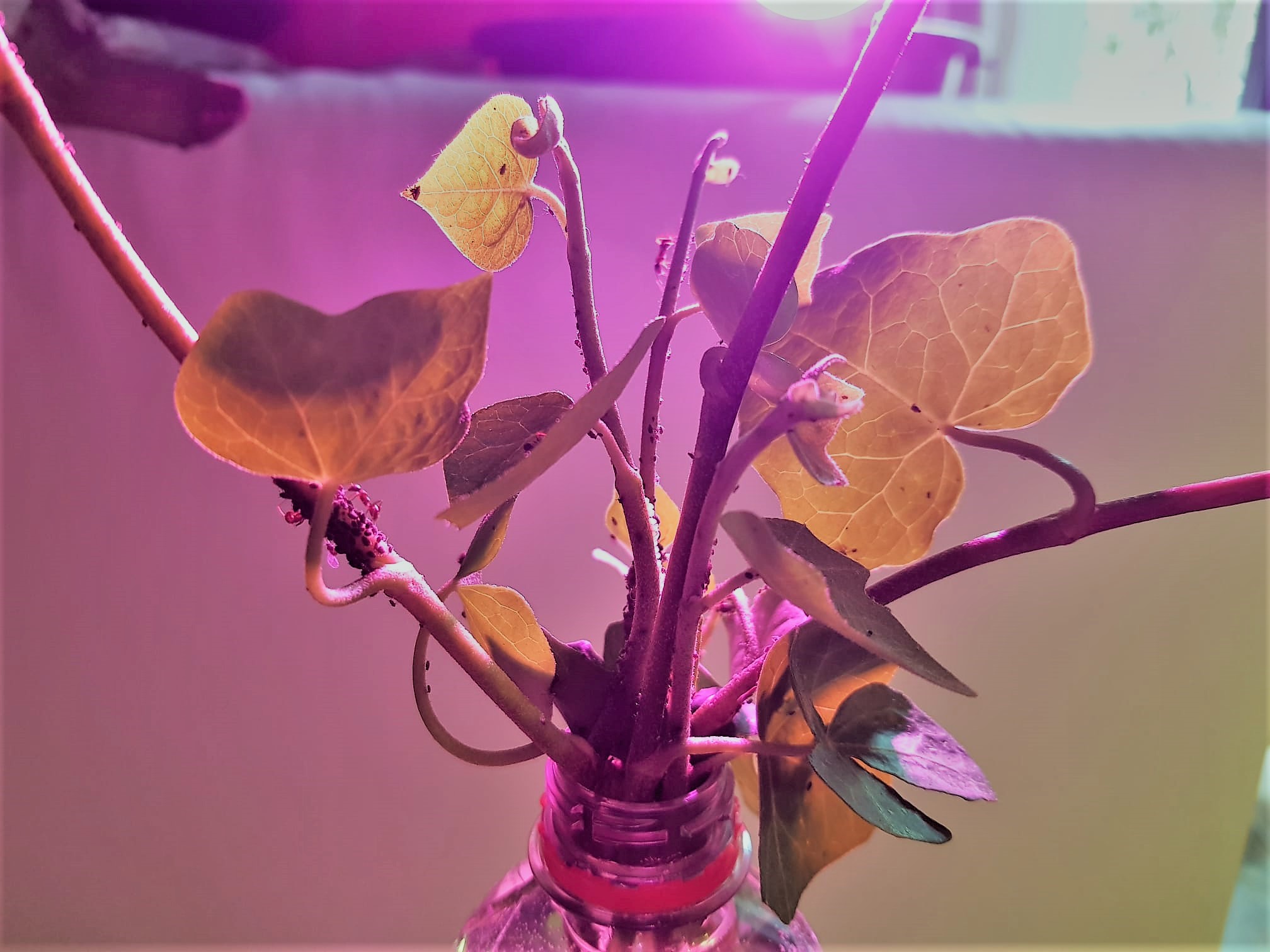 Robinien sind wie erwartet schwierig innen zu kultivieren, wĂ€hrend sie eine massive Traube LĂ€use tragen. Inzwischen geht meine zweite Robinie zur Neige und ich muss die LĂ€use ein drittes Mal auf eine frische Pflanze siedeln lassen. Das geht zwar recht problemlos, ist aber ein Mehraufwand, der ja eigentlich bei diesen Versuchen gelöst werden soll. Es mĂŒssen Reservepflanzen nebenher gehalten werden und das Umsiedeln der LĂ€use bringt auch eine Verkleinerung der Kolonie mit sich. Die Lebensdauer einer lausbesetzten Robinie liegt bei mir jetzt zwischen 4 und 6 Wochen, das ist schlechter als die Rosen letztes Jahr, wird aber durch einen deutlich geringen Aufwand beim Vorbereiten der Pflanzen ausgeglichen.