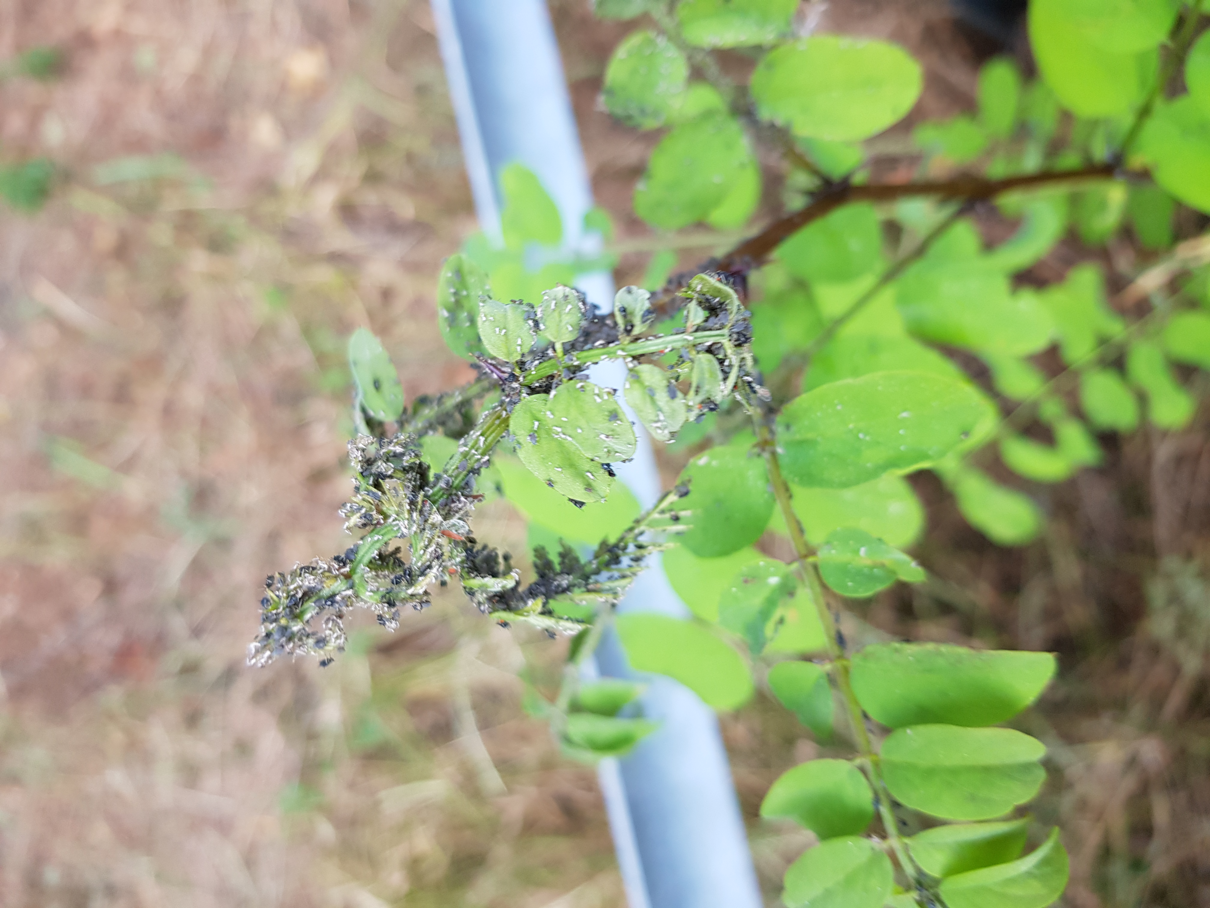 Hier ist die aktuelle Robinie der Camponotus nicobarensis. Etwa 30cm hoch und mit stabilem Lausbefall. Die Pflanze ist trotz Wachstum durch die Zimmerhaltung geschwÀcht, dies kommt den LÀusen aber zugute, welche mit Vorliebe geschwÀchte Pflanzen besiedeln.