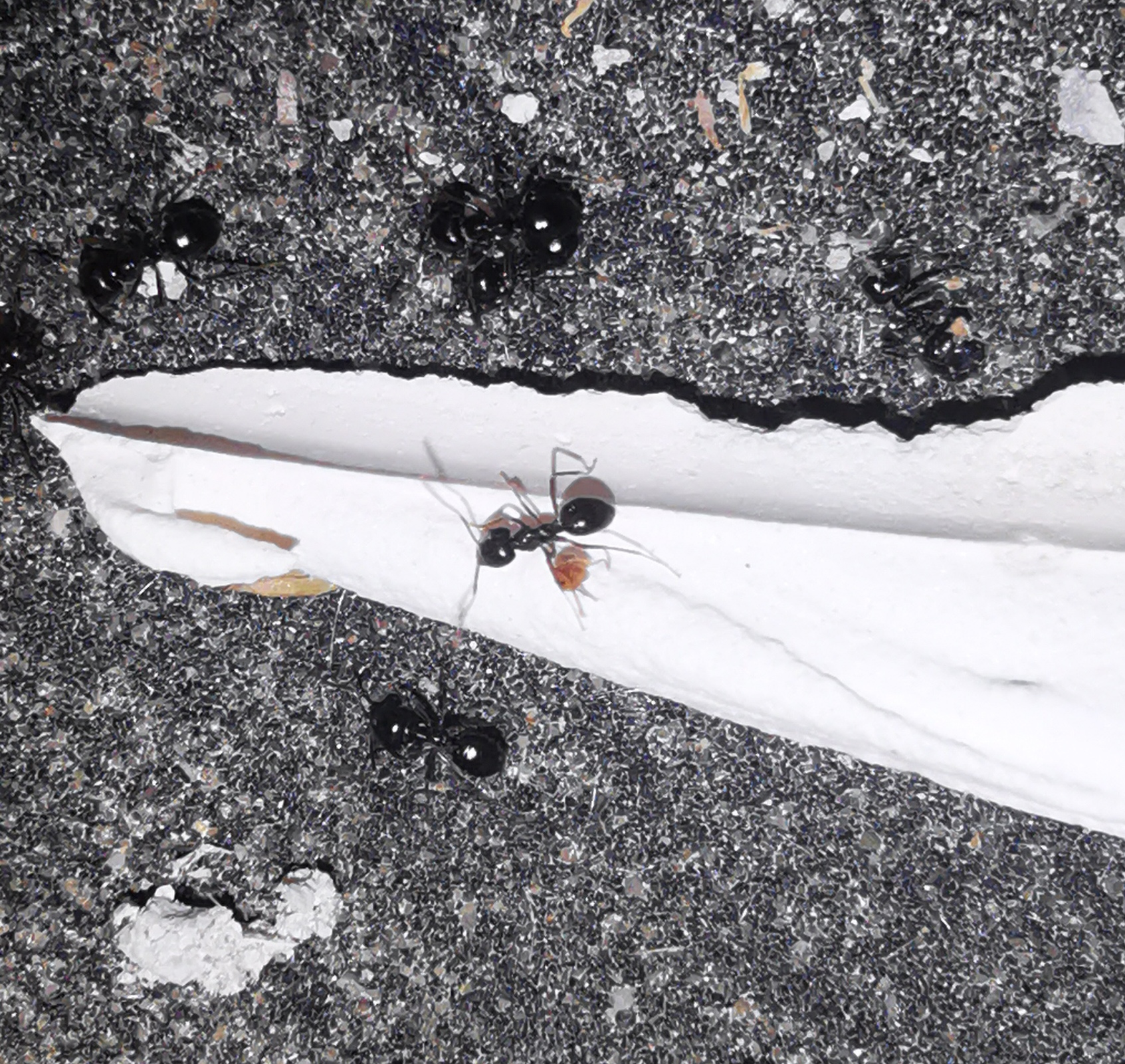 Habe nochmal versucht bessere Fotos zu machen. Also diese glänzend schwarze Holzameise hat Streifen auf dem Rücken, oder? Die sehe ich hier bei den Ameisen nicht... Wobei sie glänzend und schwarz sind...