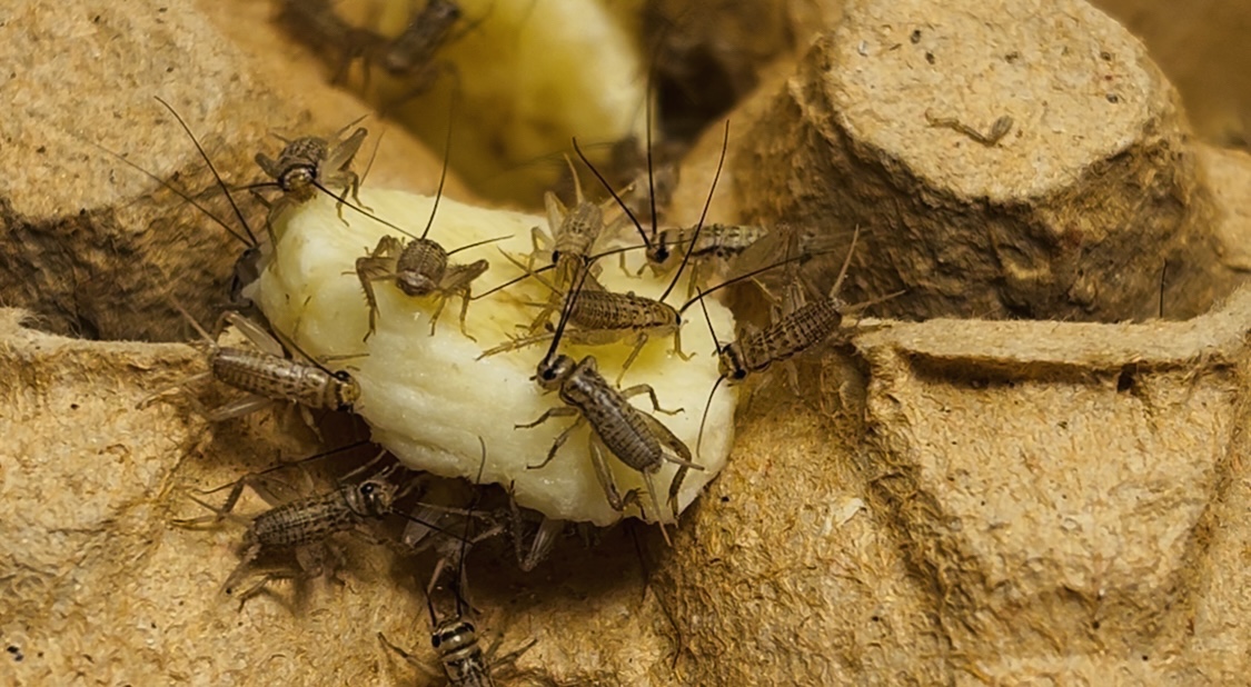 Zusätzlich habe ich zwei kleine Dosen mit jeweils etwa 50 Heimchen gekauft und diese in ein Plastikbecken mit Eierkartons etc. gesetzt.